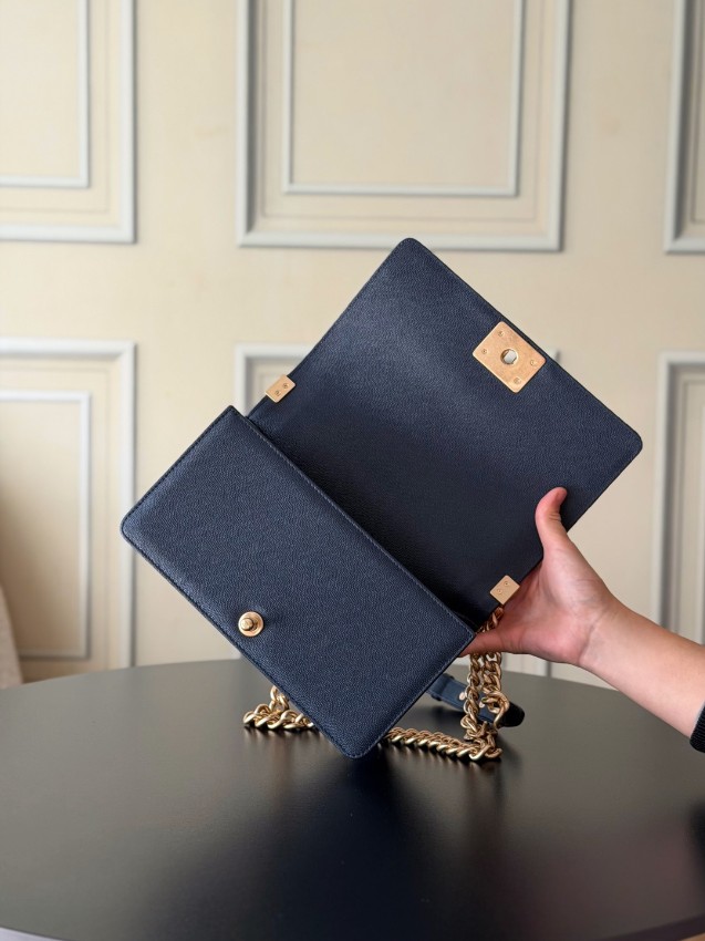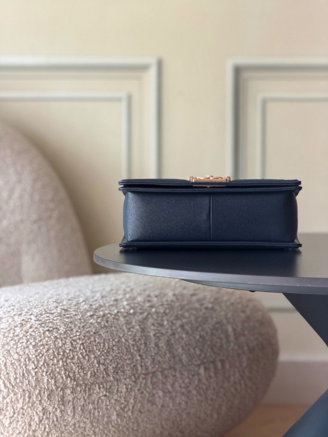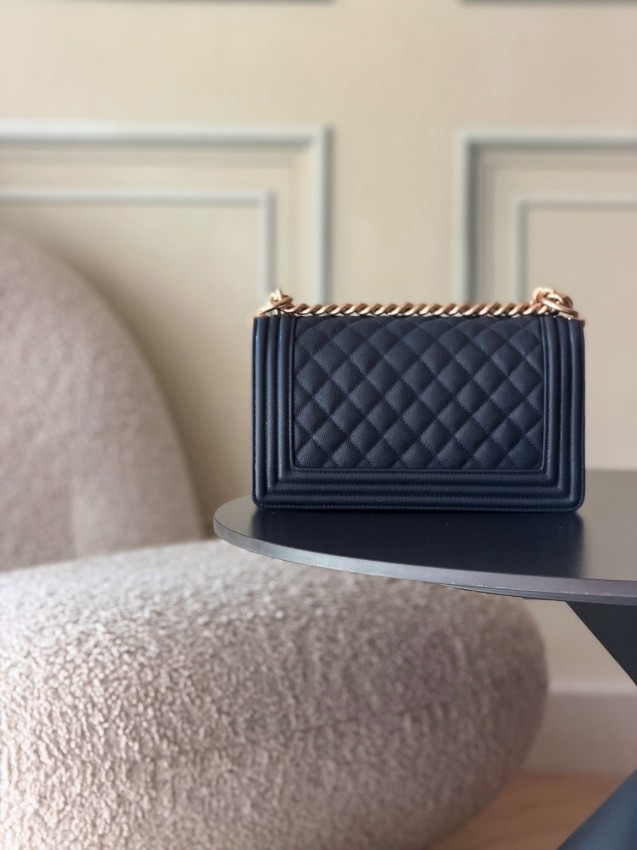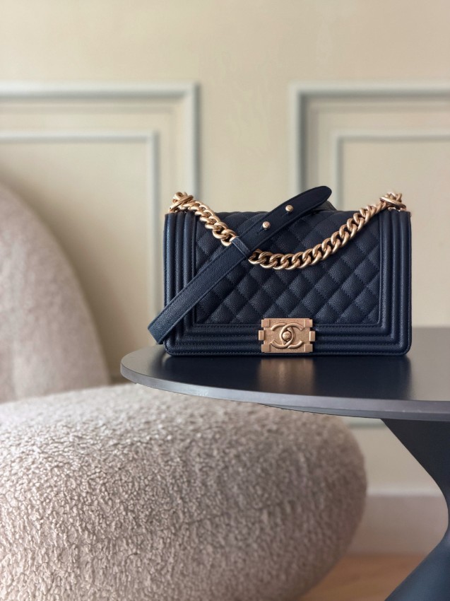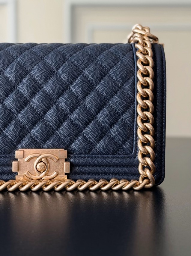 シャネル ボーイシャネルシリーズの中でも、深みのあるネイビーカラーが魅力のチェーンショルダーバッグ。立体的なダイヤキルティングが美しい陰影を生み、シックで洗練された雰囲気を演出します。ゴールドカラーのロゴ金具とチェーンがアクセントとなり、落ち着いた色合いの中にも華やかさをプラスしたデザインです。