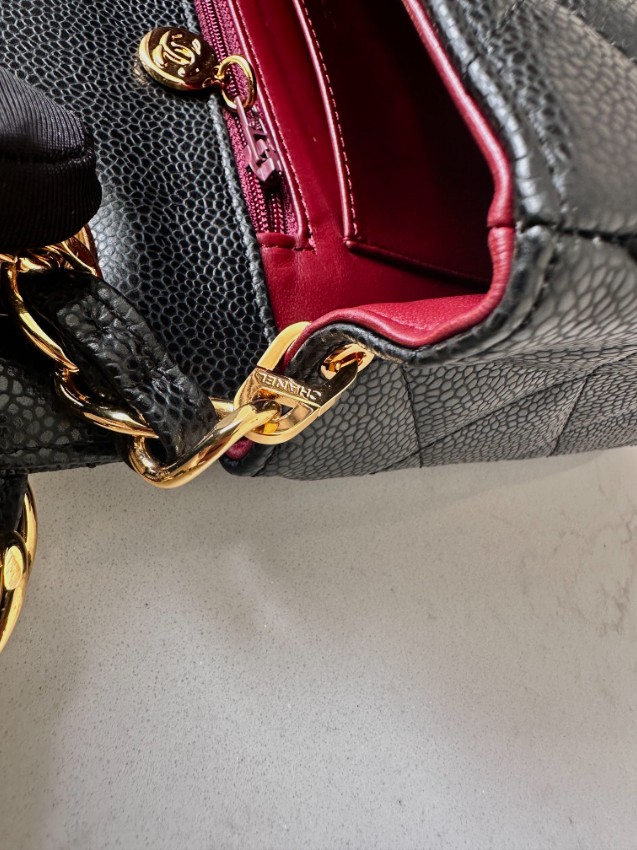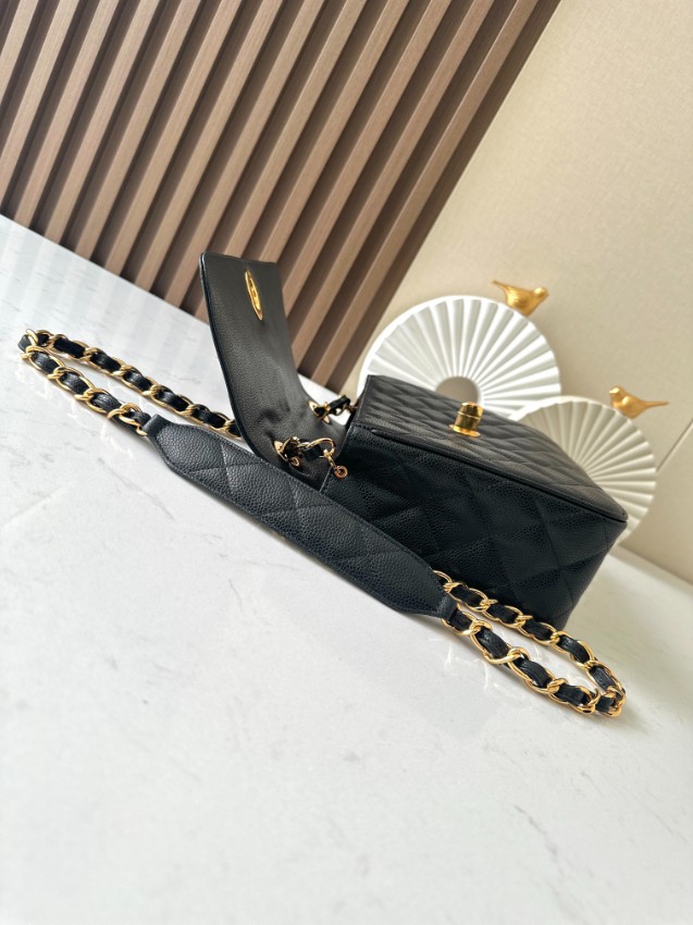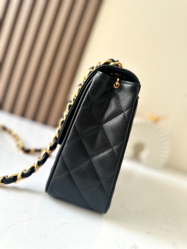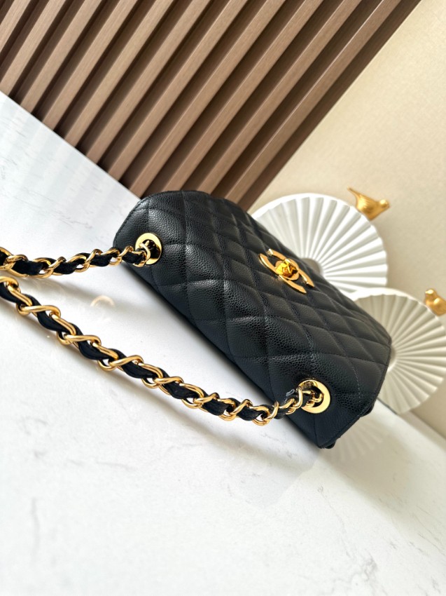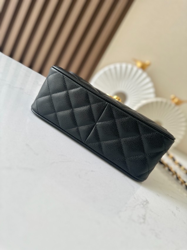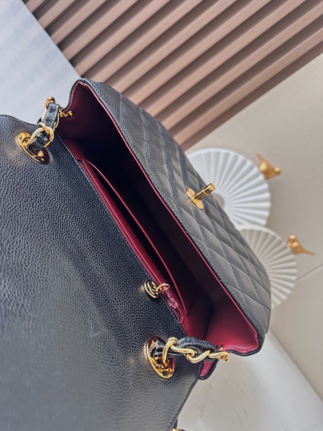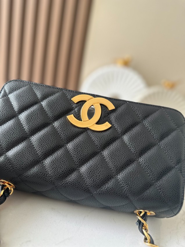 シャネルの象徴ともいえるクラシックフラップをベースにした2WAYミニバッグは、キャビア調の型押しレザーが特徴の洗練されたモデル。細かなシボ感が高級感を演出し、キルティングステッチと相まって立体的で美しいフォルムを実現しています。ブラックカラーにゴールドのココマーク金具が映え、シンプルながら存在感のある仕上がりです。