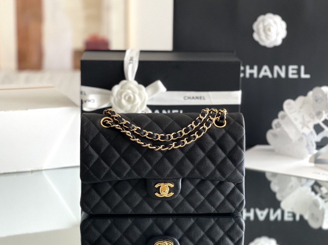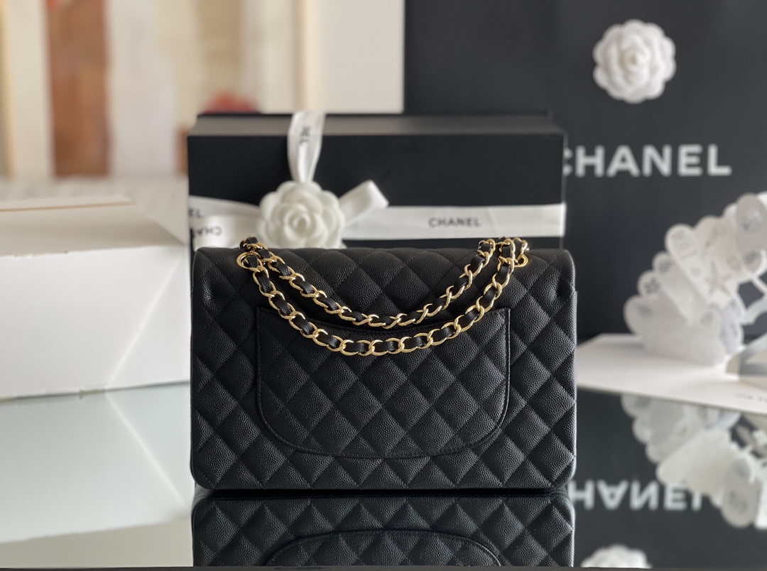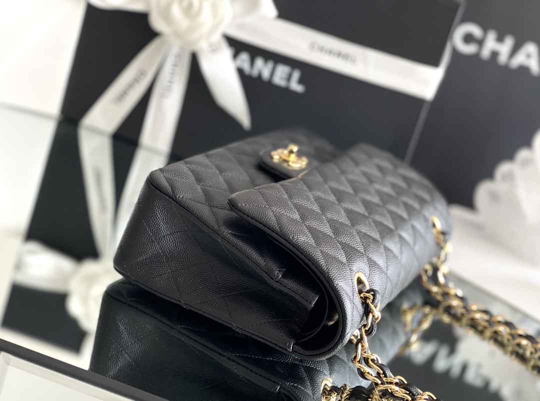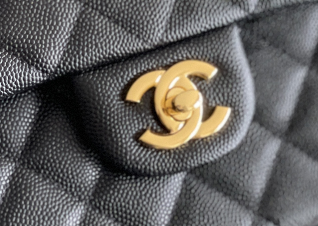 シャネルを象徴するクラシックフラップをベースにしたチェーンショルダーバッグは、タイムレスなブラックカラーとキルティングが魅力の一品。上質なキャビア調レザーのシボ感が美しい立体感を生み出し、耐久性と高級感を兼ね備えています。フロントにはゴールドのココマーク金具が配置され、シンプルな中にも華やかさを添えています。