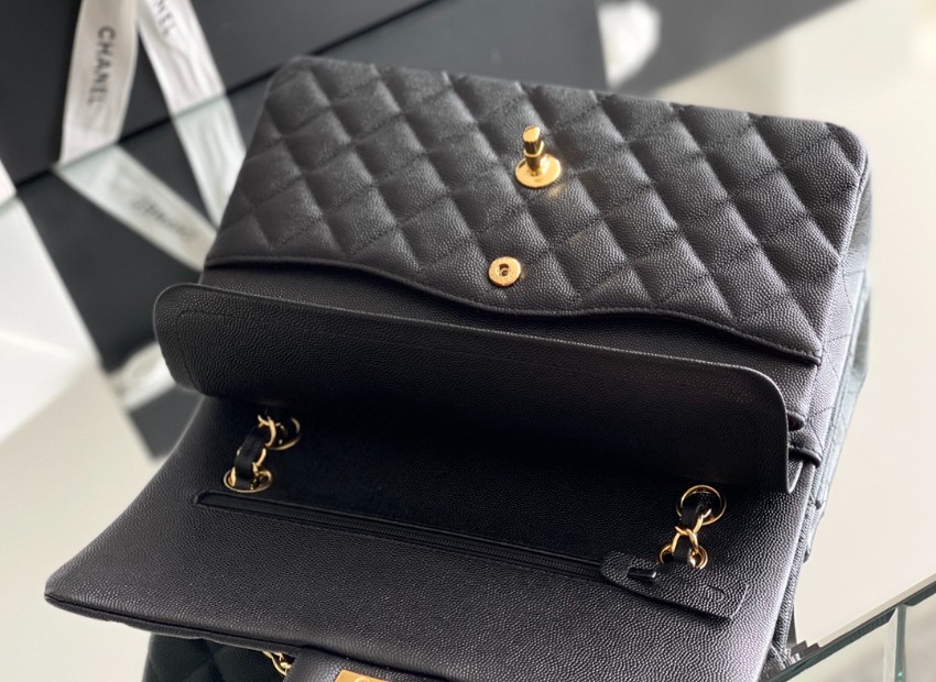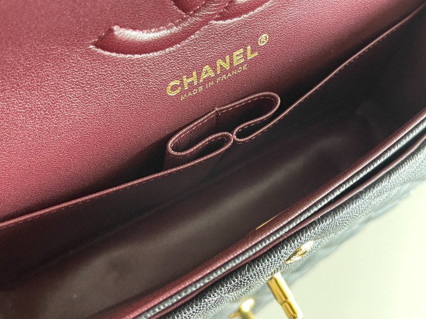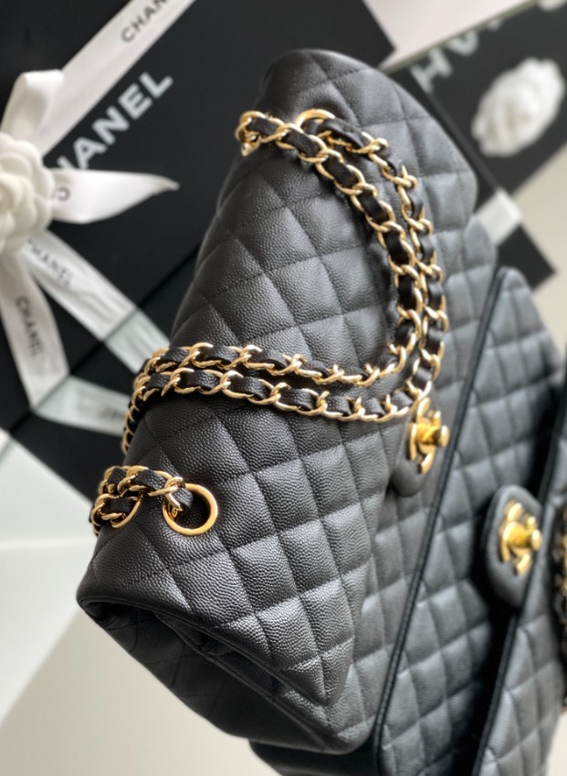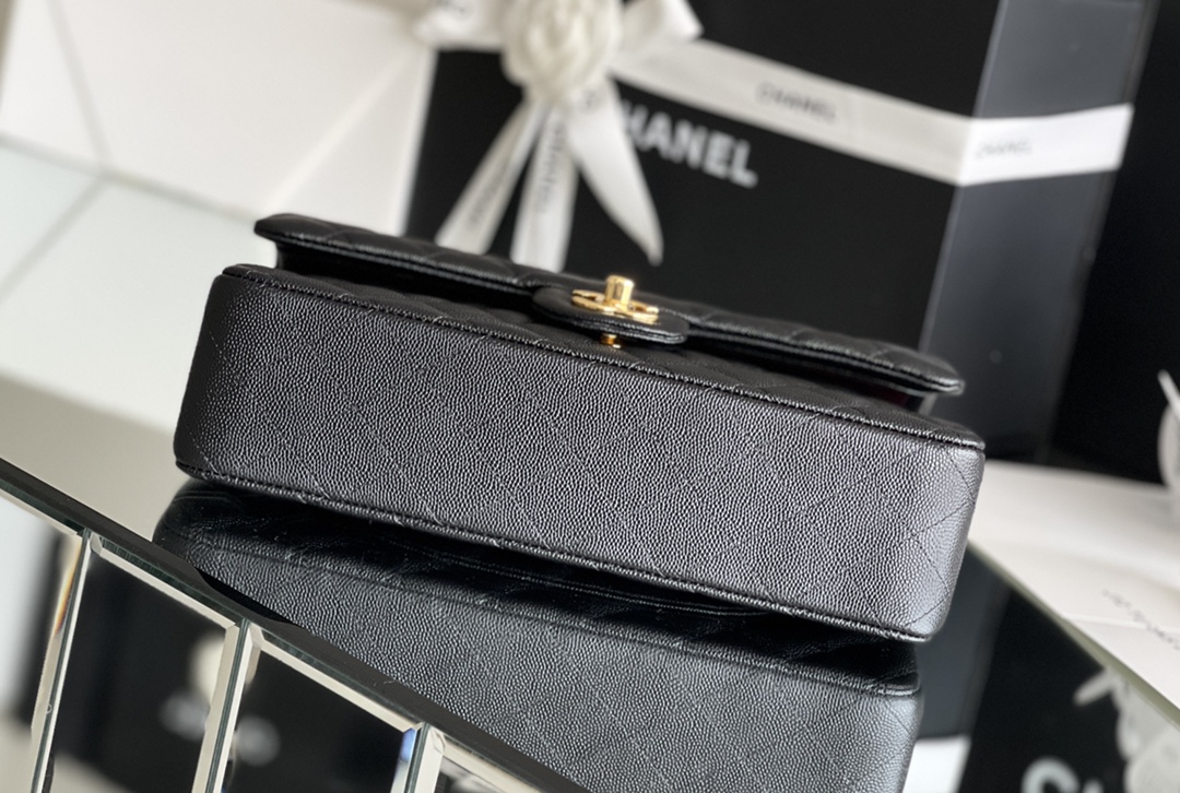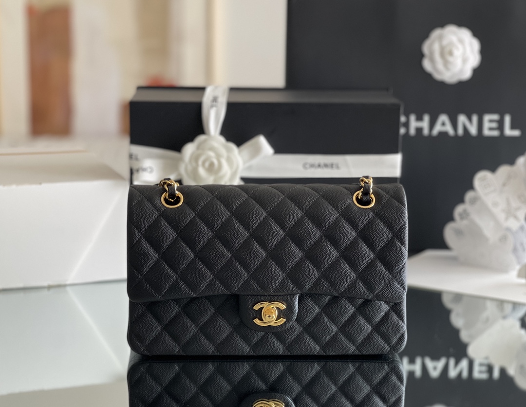 シャネルを象徴するクラシックフラップをベースにしたチェーンショルダーバッグは、タイムレスなブラックカラーとキルティングが魅力の一品。上質なキャビア調レザーのシボ感が美しい立体感を生み出し、耐久性と高級感を兼ね備えています。フロントにはゴールドのココマーク金具が配置され、シンプルな中にも華やかさを添えています。