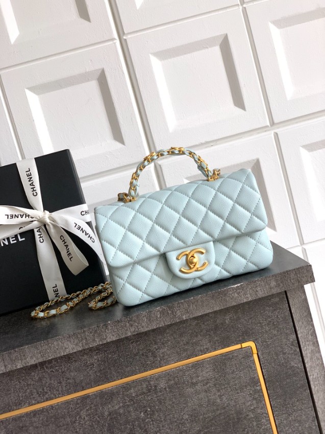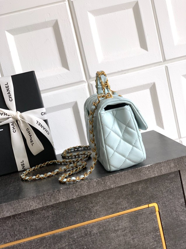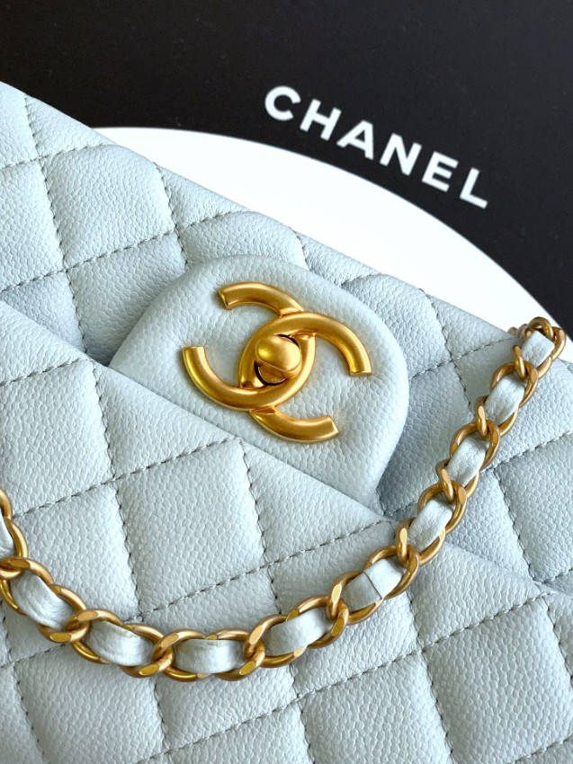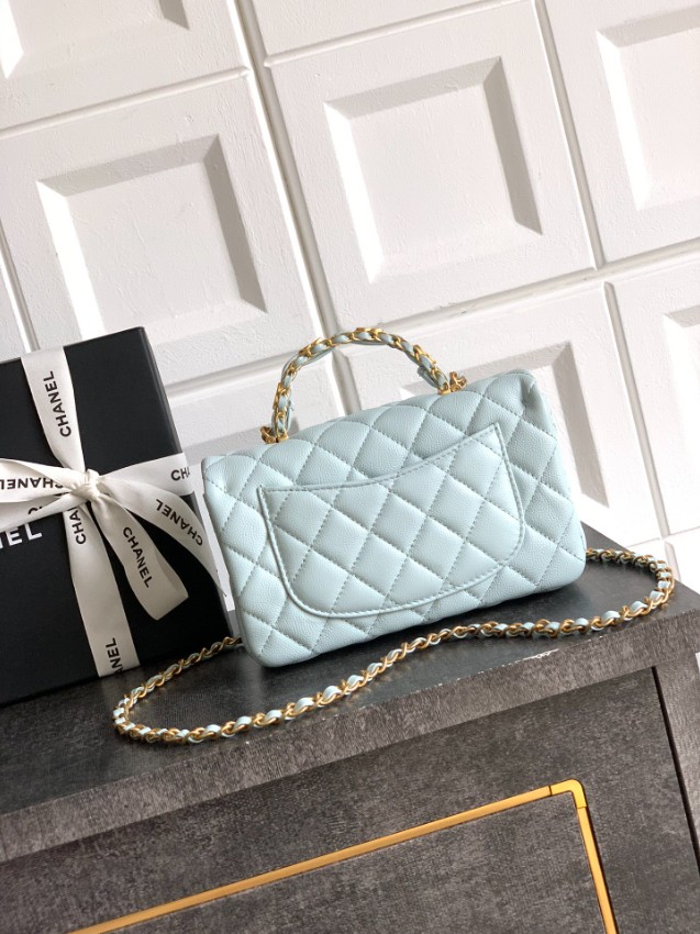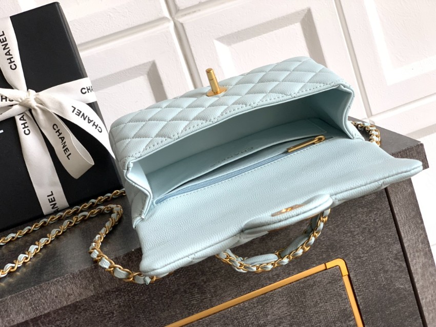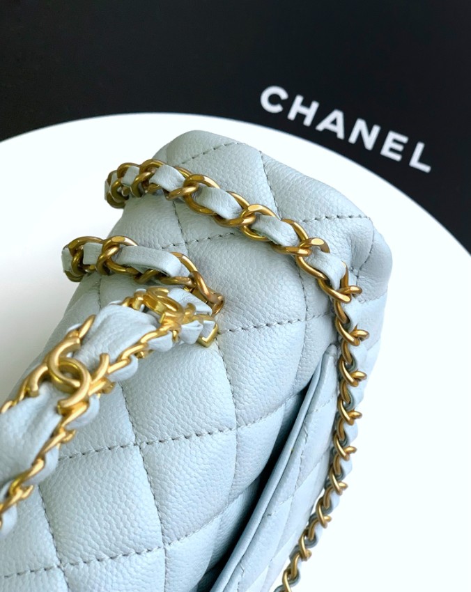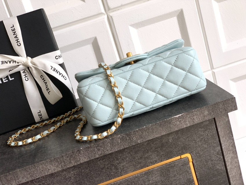 シャネルの象徴的なクラシックフラップシリーズをベースにした、華やかで爽やかなミニバッグです。淡いライトブルーカラーが柔らかく優しい印象を与え、春夏コーデにもぴったりな軽やかさを演出します。立体感のあるキルティング加工とフロントのココマーク金具が、シンプルながらも高級感を引き立てます。