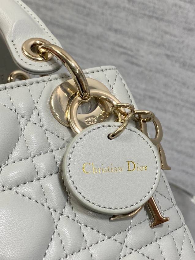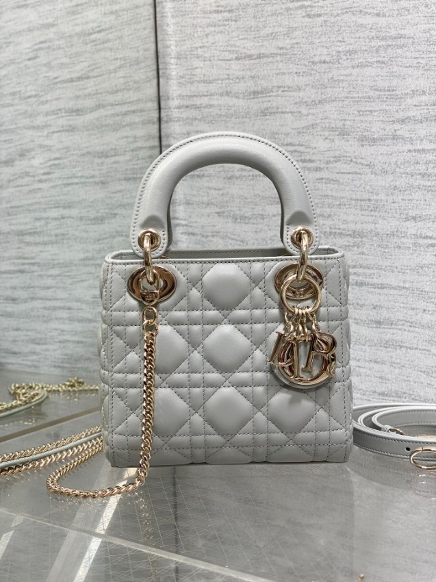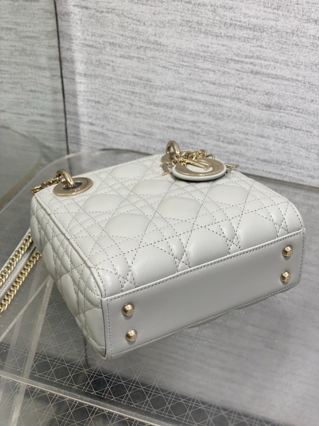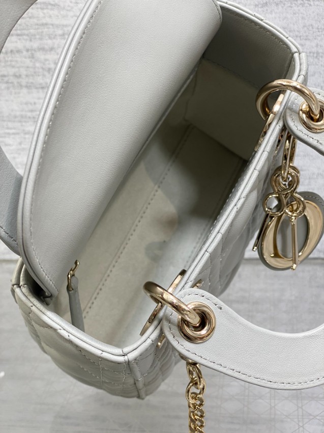 レディ ディオールシリーズのエレガントな魅力を引き立てる、落ち着いたライトグレーカラーのミニバッグ。上質なレザーに施されたカナージュキルティングが立体感を生み出し、柔らかな色合いとともに上品で洗練された印象を演出します。ゴールドのDIORチャームが揺れるたびに華やかさを添え、シンプルながら存在感のあるデザインに仕上がっています。