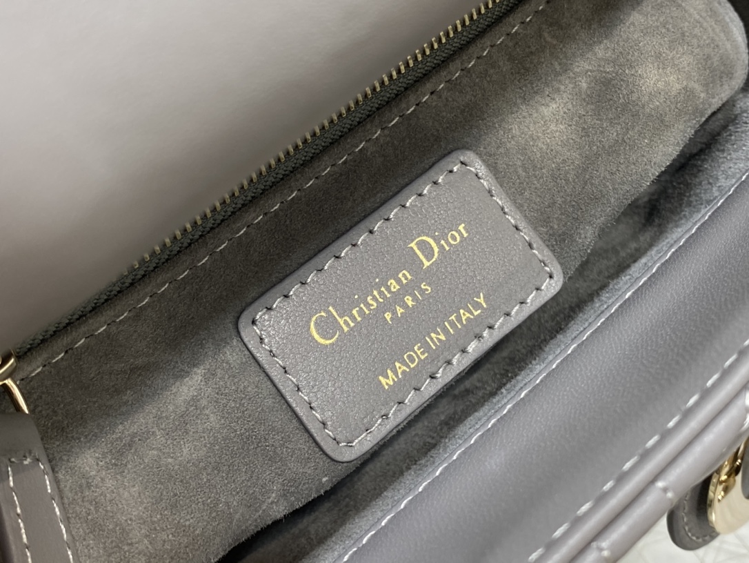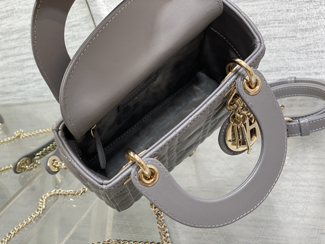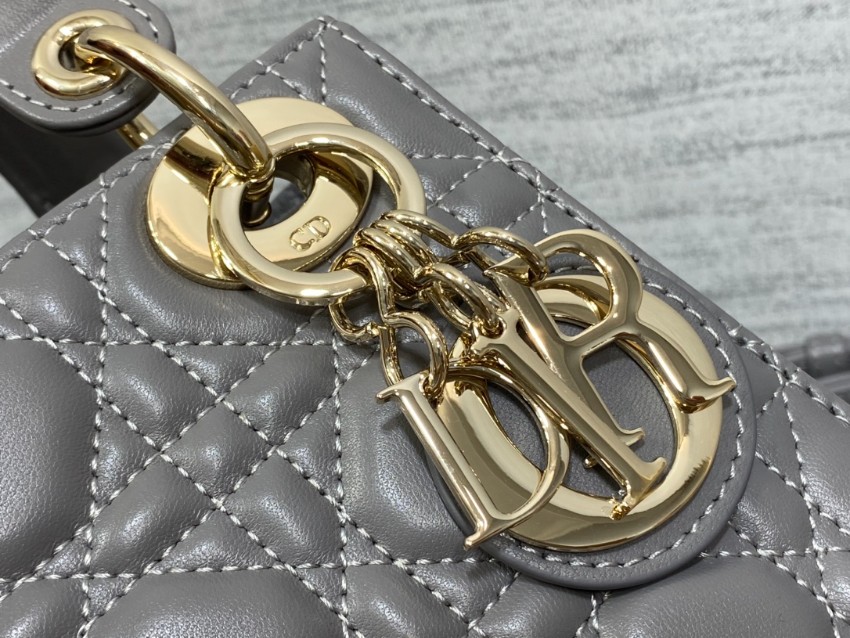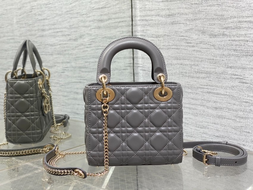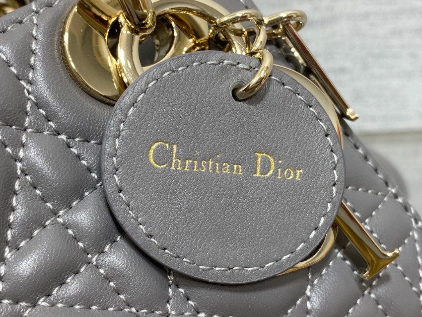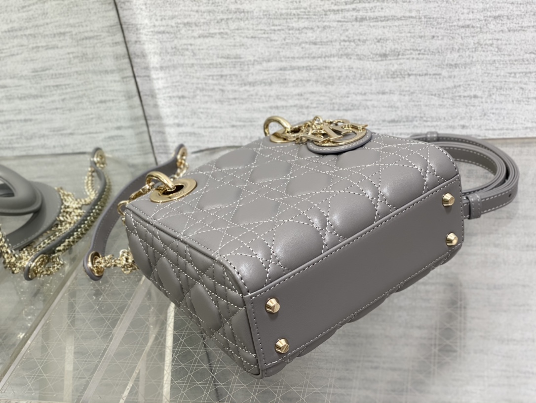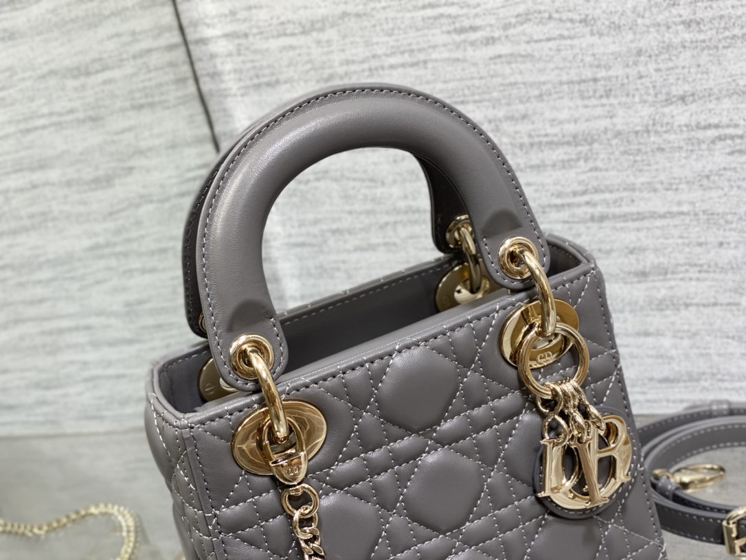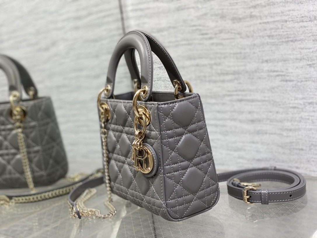 レディ ディオールシリーズの洗練された魅力を引き立てる、落ち着いたグレーカラーのミニバッグ。上質なレザーに施されたカナージュキルティングが美しい立体感を生み出し、シンプルながらも高級感のある仕上がりです。ゴールドのDIORチャームが揺れるたびに華やかさを添え、コーディネートに上品なアクセントをプラスします。