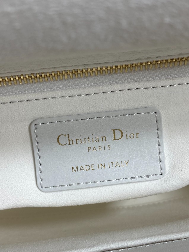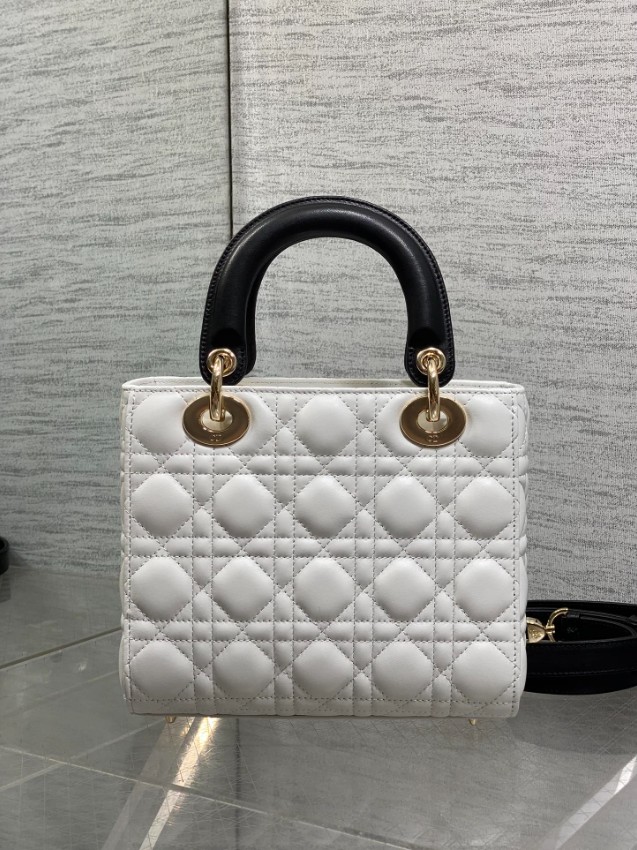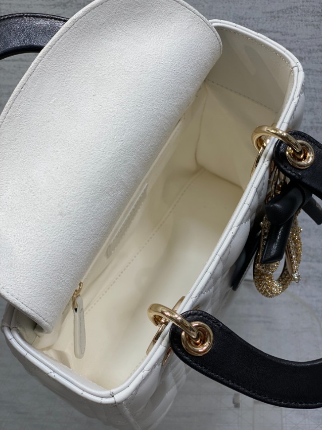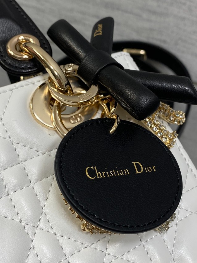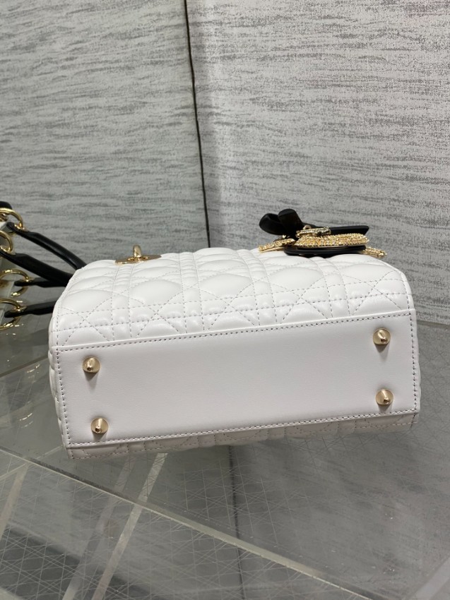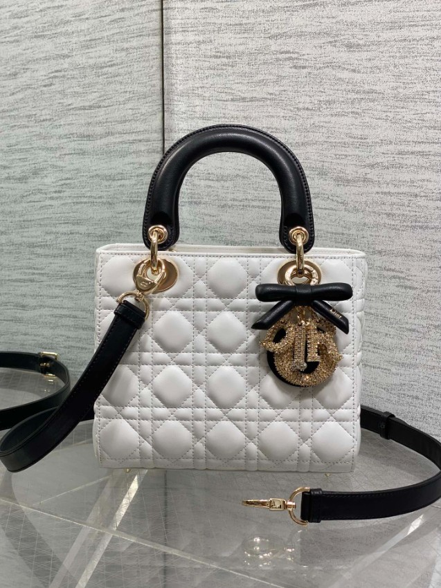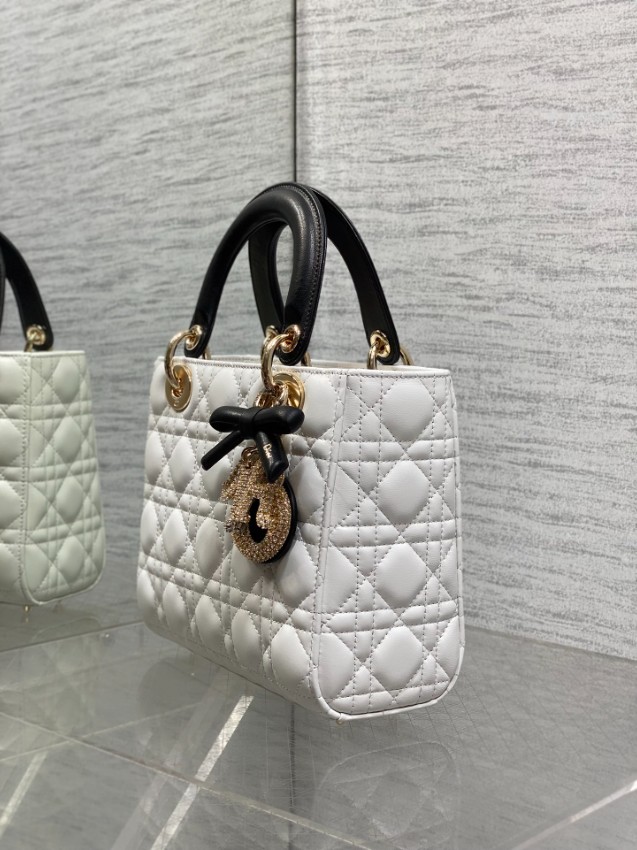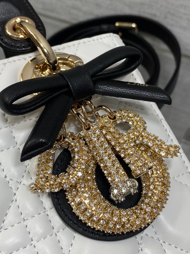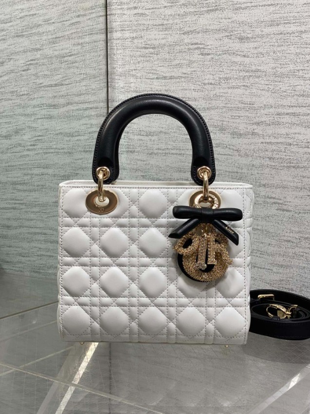 レディ ディオールシリーズの気品あるデザインに、モダンなコントラストを加えたハンドバッグ。上質なホワイトレザーに施されたカナージュキルティングが立体感を生み出し、ブラックハンドルとの配色が洗練された印象を演出します。さらに、リボンモチーフと煌びやかなDIORチャームが華やかなアクセントとなり、個性とエレガンスを兼ね備えた仕上がりです。