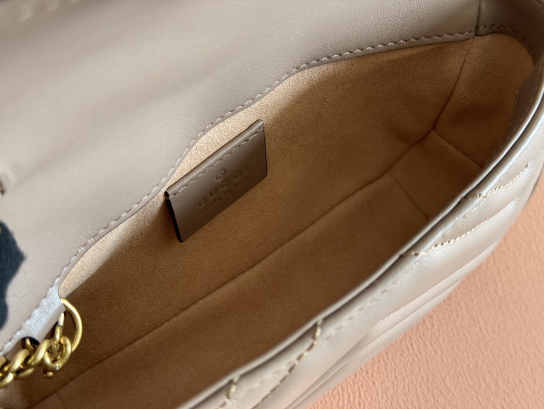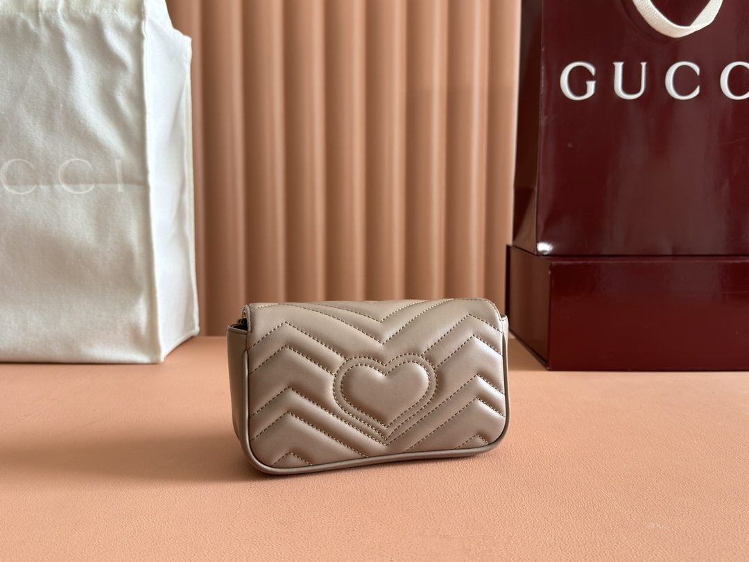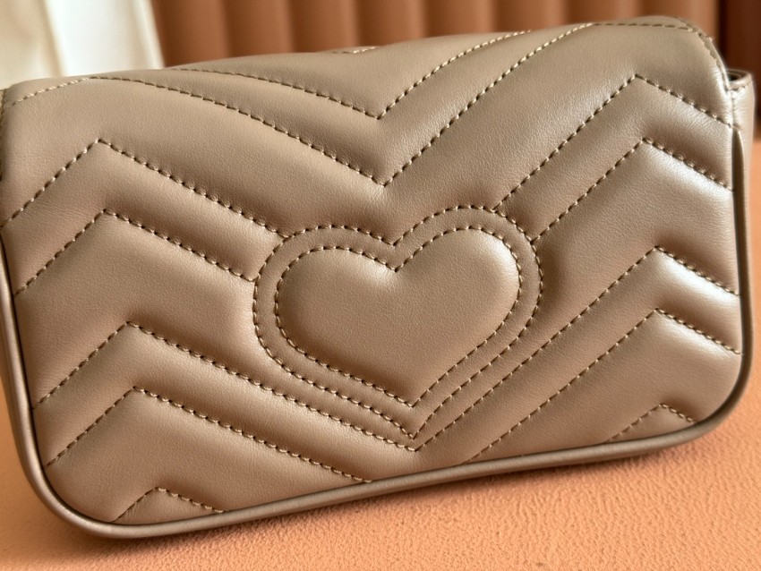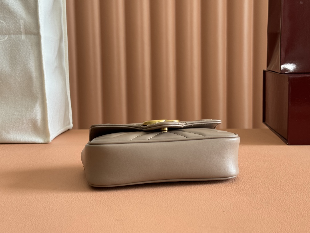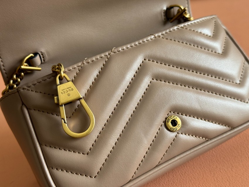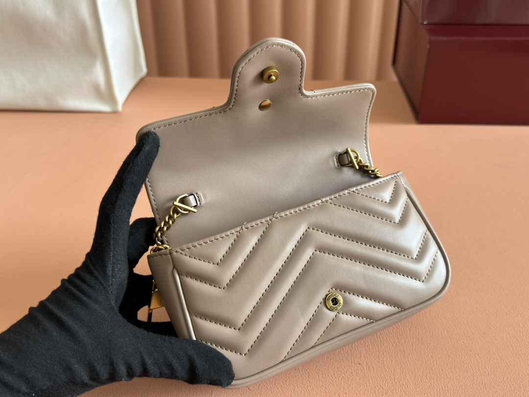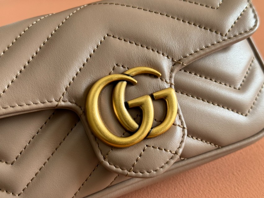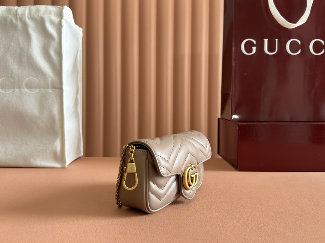 グッチGGマーモントシリーズのエレガントな魅力を凝縮したミニショルダーバッグです。落ち着いたベージュカラーにシェブロンキルティングを施し、柔らかく上品な質感を表現。フロントには象徴的なダブルGロゴを配置し、シンプルながら存在感のあるデザインに仕上げています。コンパクトなサイズ感ながら、スマートフォンやミニウォレットなどの必需品をしっかり収納でき、日常使いにも便利。チェーンストラップは軽やかで肩掛けしやすく、カジュアルからきれいめコーデまで幅広くマッチします。n級品として細部の縫製や金具の質感にもこだわり、グッチらしい高級感を気軽に楽しめるのも魅力。旅行やショッピング、デートシーンにも活躍する実用性の高いアイテムです。