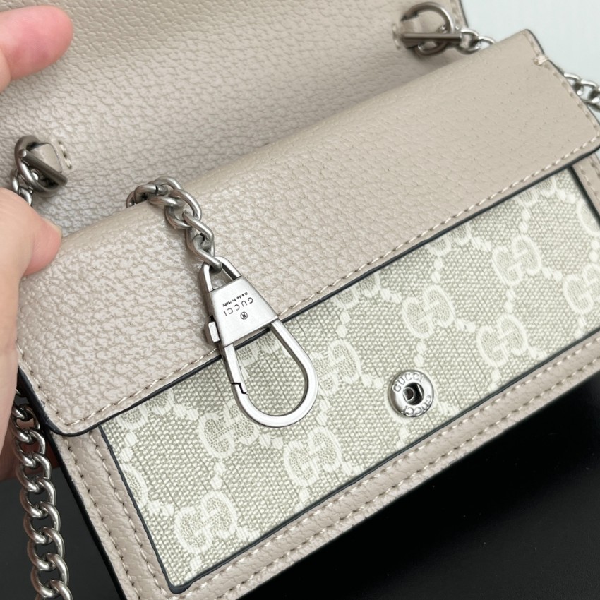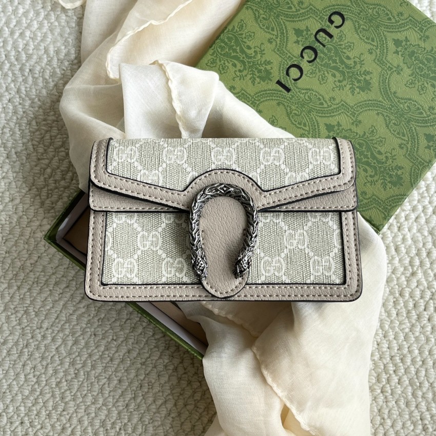 商品説明:グッチの人気ディオニュソスシリーズをモチーフにしたハイブランドコンパクトバッグは、クラシカルなGGキャンバスとレザーを組み合わせた上品な仕上がりが魅力です。柔らかなベージュトーンが女性らしい優しい印象を演出し、フロントにはディオニュソスを象徴するアイコニックな金具を配置することで、ブランドらしい高級感を引き立てています。コンパクトなサイズ感ながら、スマートフォンやミニウォレット、小物類をすっきり収納可能で、日常使いに最適。チェーンストラップ付きでショルダーやクロスボディとしても活用でき、カジュアルからきれいめスタイルまで幅広く対応します。シンプルながら洗練されたデザインで、ハイブランドスタイルを気軽に楽しめるおすすめのアイテムです。