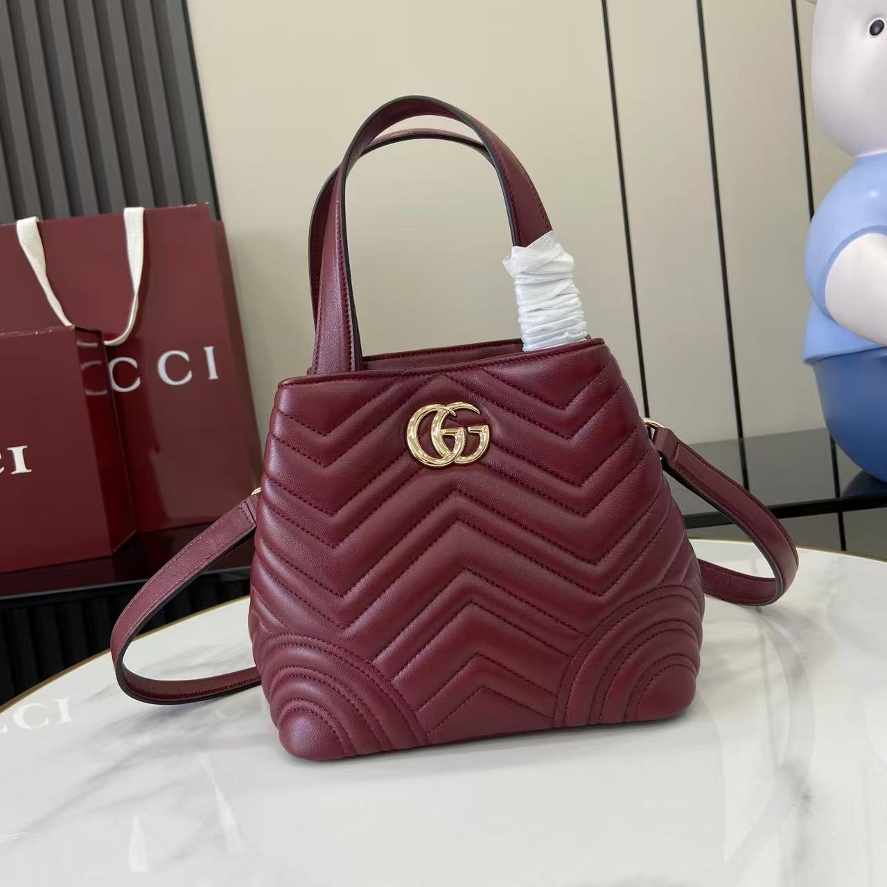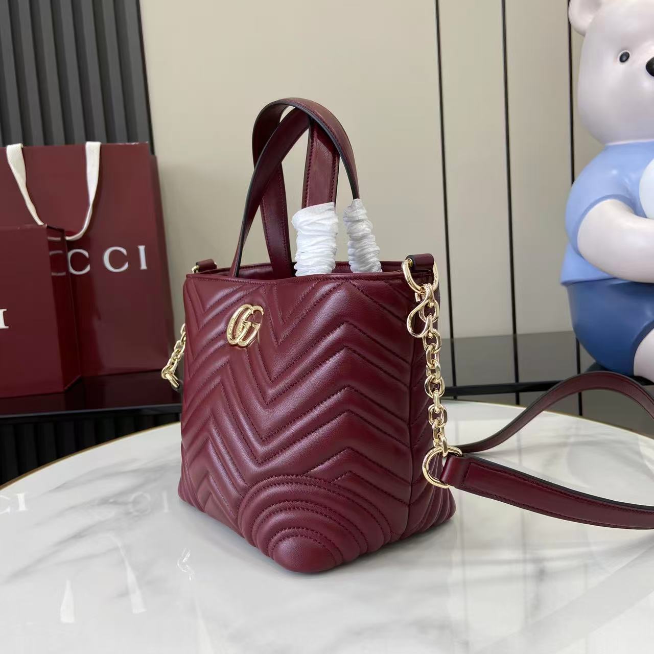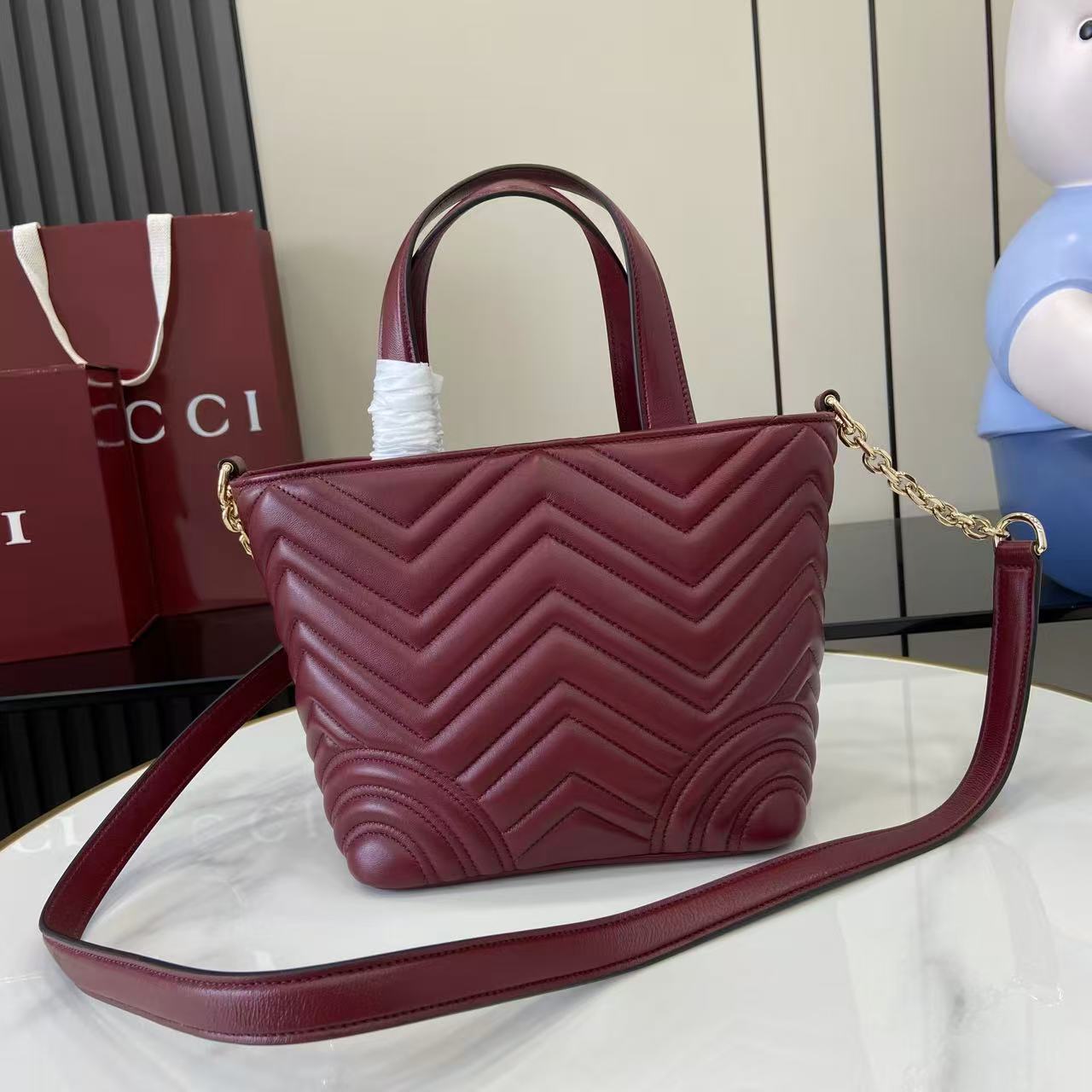 商品説明:グッチ GGマーモントシリーズの魅力を取り入れたハイブランドテイストのミニトートバッグは、シェブロンキルティングが美しく映えるデザインが特徴。柔らかなレザー調素材を使用し、丁寧なステッチと上品なゴールド金具が高級感を引き立てます。コンパクトなサイズながら収納力に優れ、財布やスマートフォン、コスメなど日常の必需品をしっかり整理可能。取り外し可能なショルダーストラップが付属しており、ハンドバッグとしてもショルダーバッグとしても使える2WAY仕様で、シーンに合わせた使い分けが可能です。ワインレッド系カラーはコーディネートのアクセントとしても活躍し、シンプルな装いに華やかさをプラス。GGマーモントならではのクラシカルな魅力と実用性を兼ね備えた一品です。