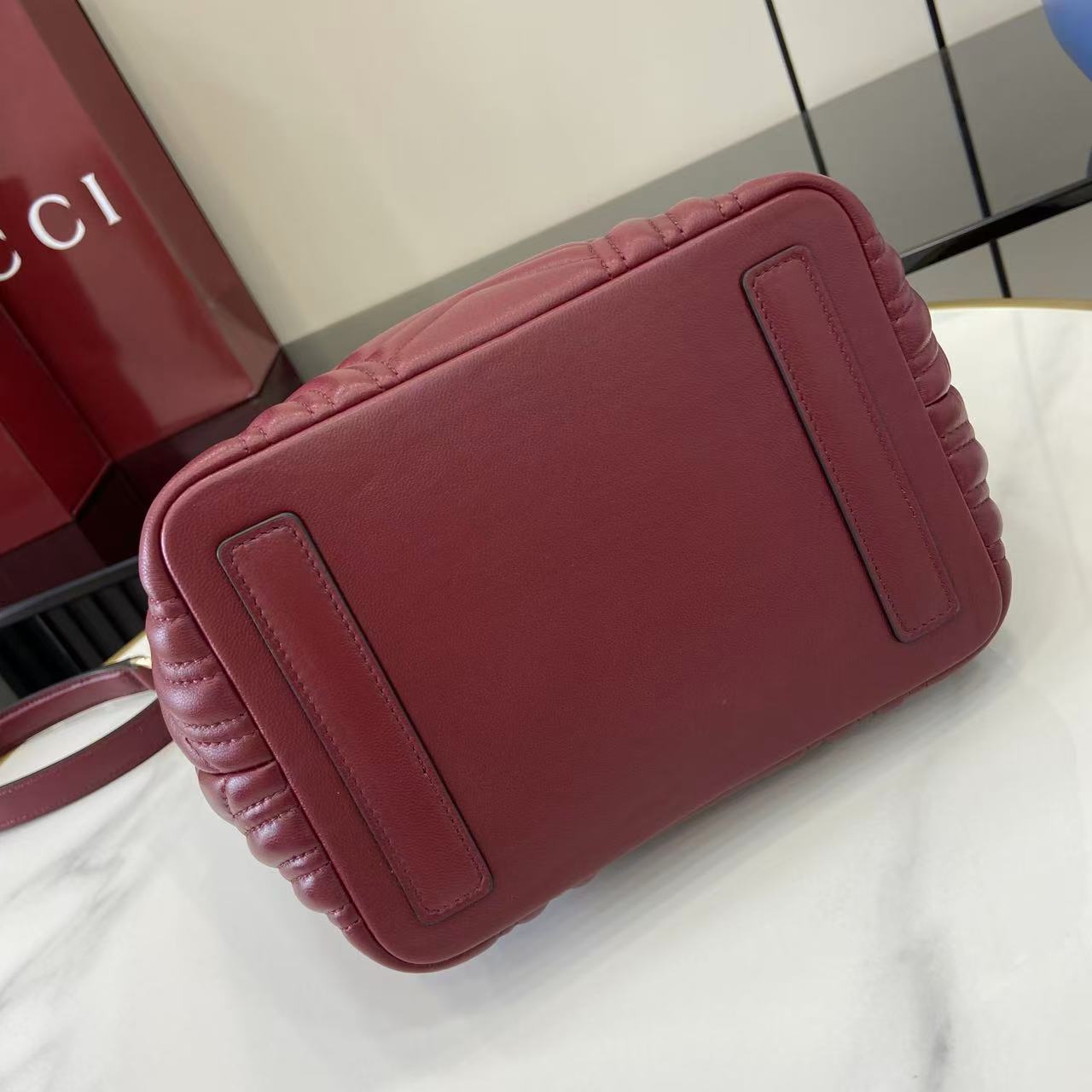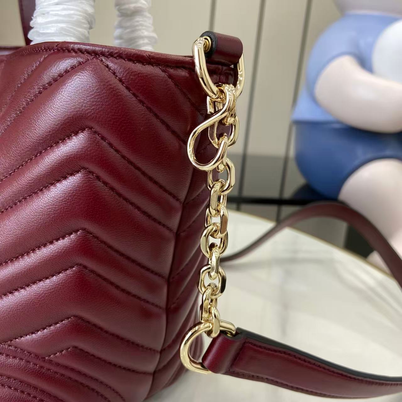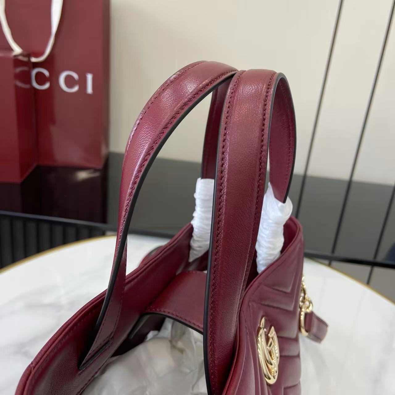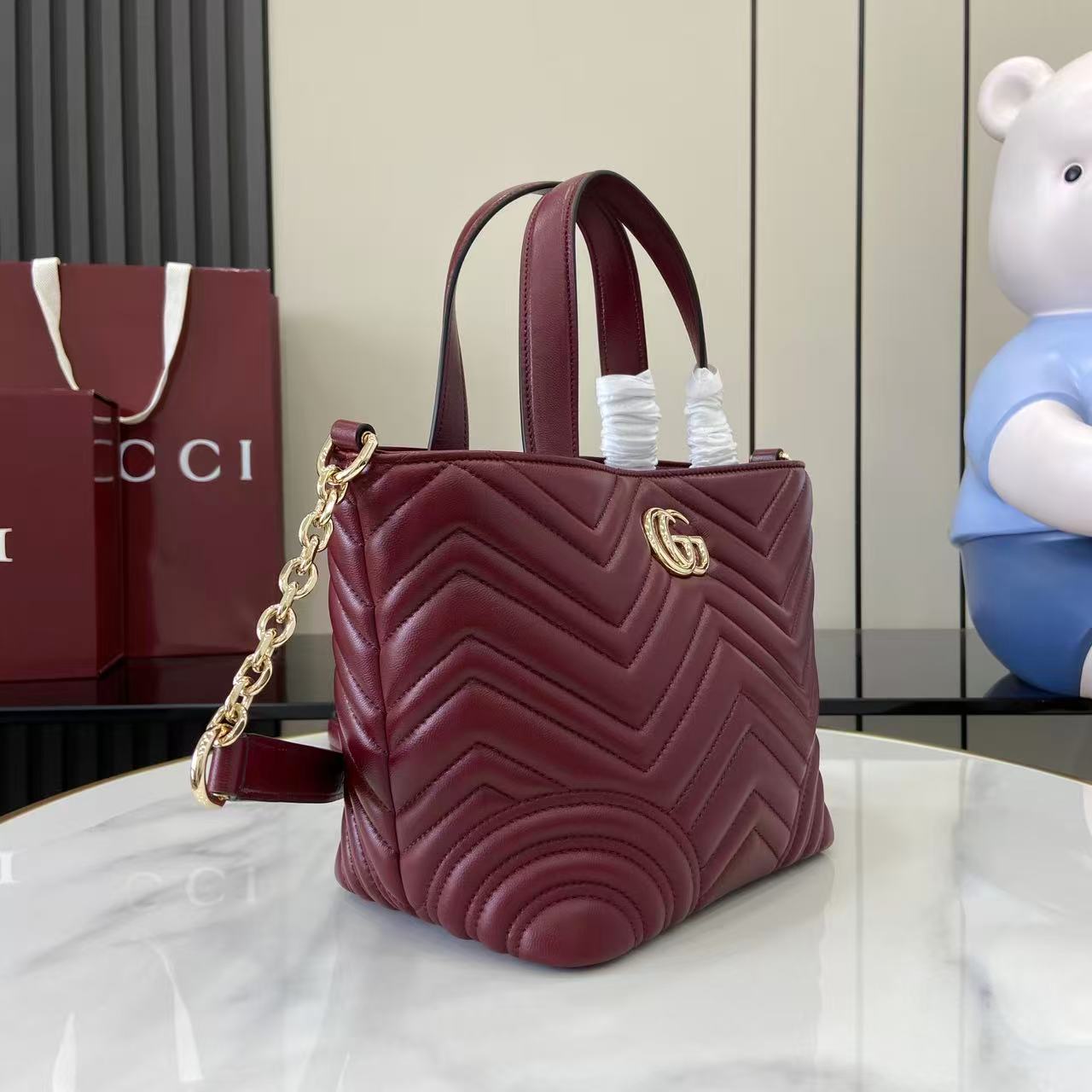 商品説明:グッチ GGマーモントシリーズの魅力を取り入れたハイブランドテイストのミニトートバッグは、シェブロンキルティングが美しく映えるデザインが特徴。柔らかなレザー調素材を使用し、丁寧なステッチと上品なゴールド金具が高級感を引き立てます。コンパクトなサイズながら収納力に優れ、財布やスマートフォン、コスメなど日常の必需品をしっかり整理可能。取り外し可能なショルダーストラップが付属しており、ハンドバッグとしてもショルダーバッグとしても使える2WAY仕様で、シーンに合わせた使い分けが可能です。ワインレッド系カラーはコーディネートのアクセントとしても活躍し、シンプルな装いに華やかさをプラス。GGマーモントならではのクラシカルな魅力と実用性を兼ね備えた一品です。