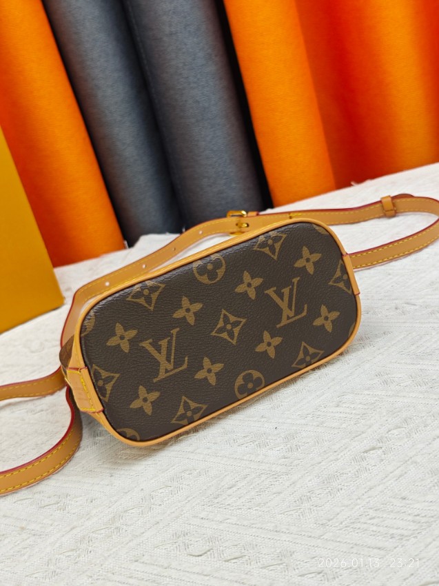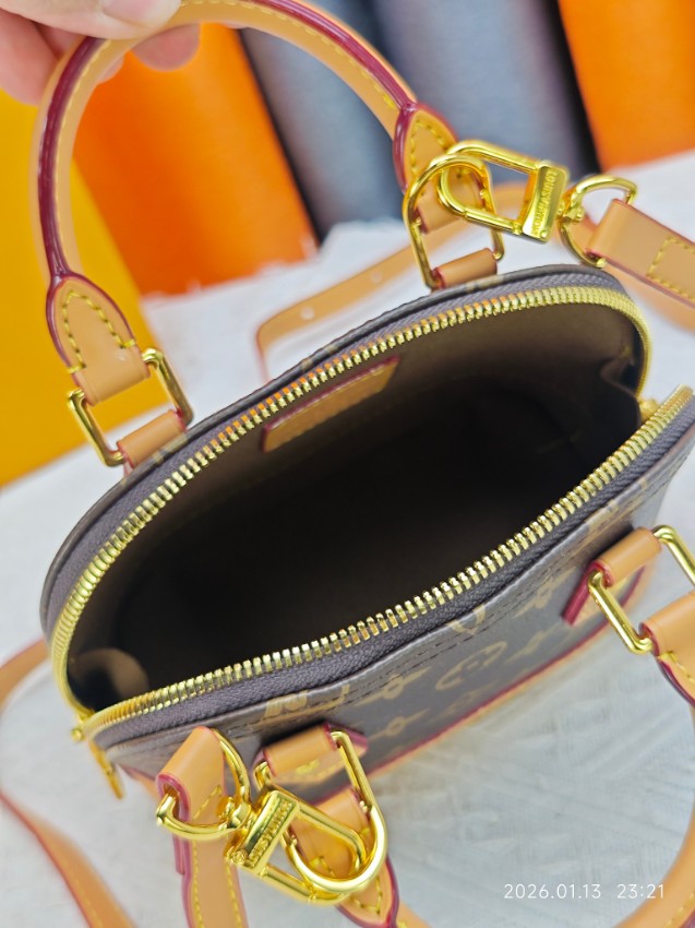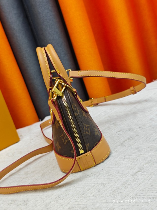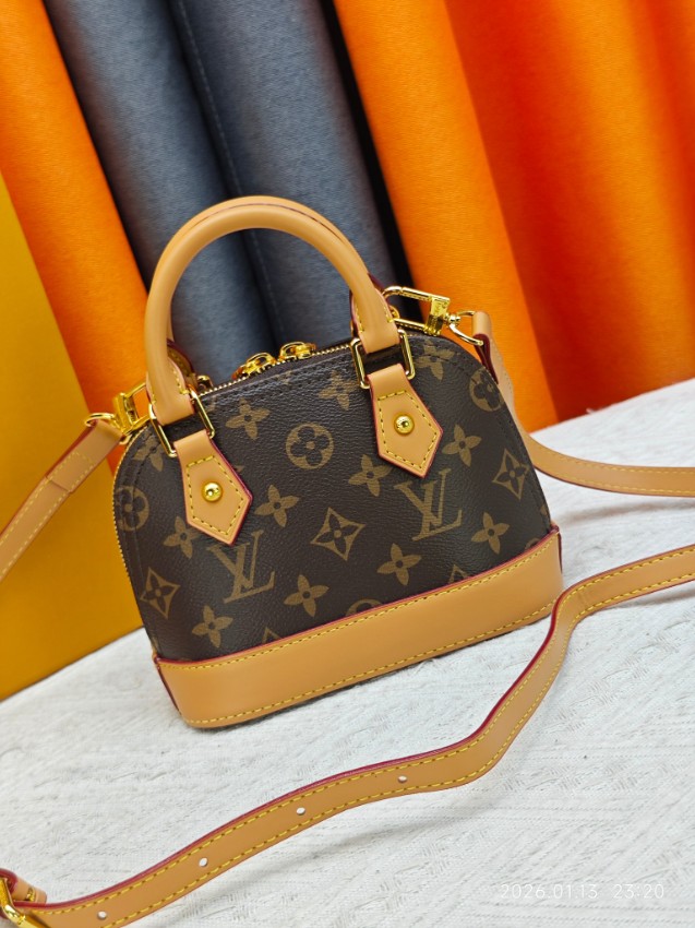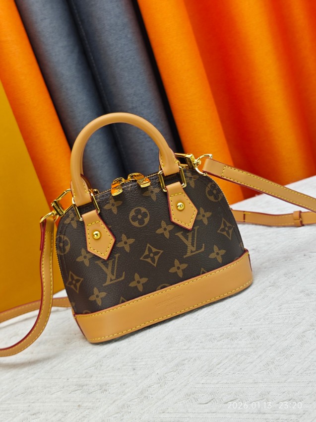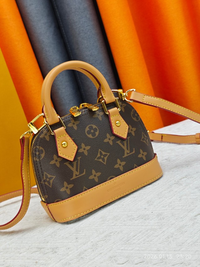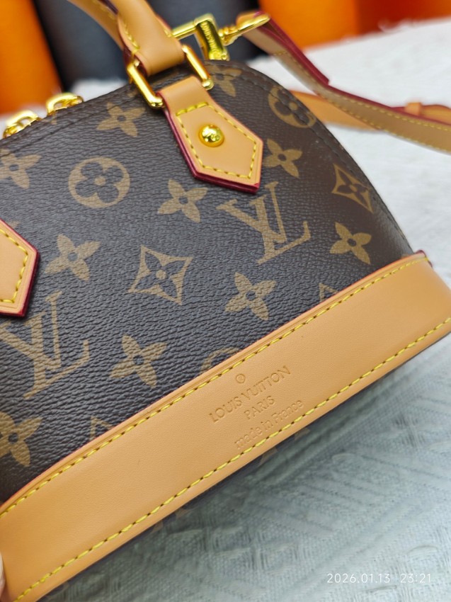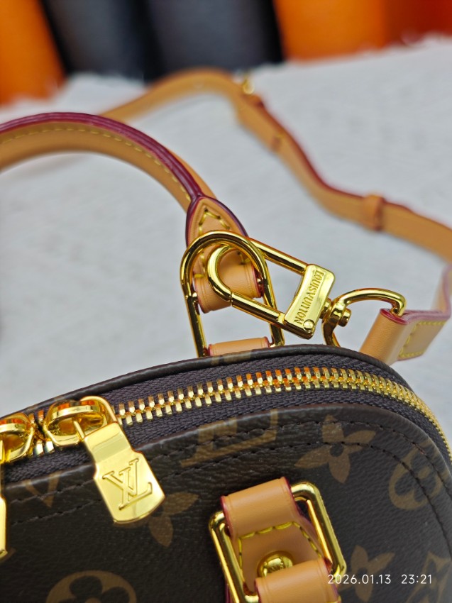 商品説明:ルイヴィトンの定番ライン「アルマ」をベースにした並行輸入品ミニバッグは、ブランドを象徴するモノグラムキャンバスとナチュラルなヌメ革のコンビが魅力の一品です。丸みのあるコンパクトなフォルムが女性らしさを引き立て、ブラウンの落ち着いた色味がどんなコーディネートにも馴染みます。ゴールド金具が上品なアクセントとなり、細部まで丁寧に仕上げられたデザインが高級感を演出。取り外し可能なショルダーストラップ付きで、ハンドバッグとしても斜め掛けバッグとしても使える2WAY仕様です。コンパクトながら収納力もあり、財布やスマートフォンなど日常の必需品をしっかり収納可能。アルマシリーズならではのエレガントな雰囲気を楽しめるレディースバッグとしておすすめのアイテムです。