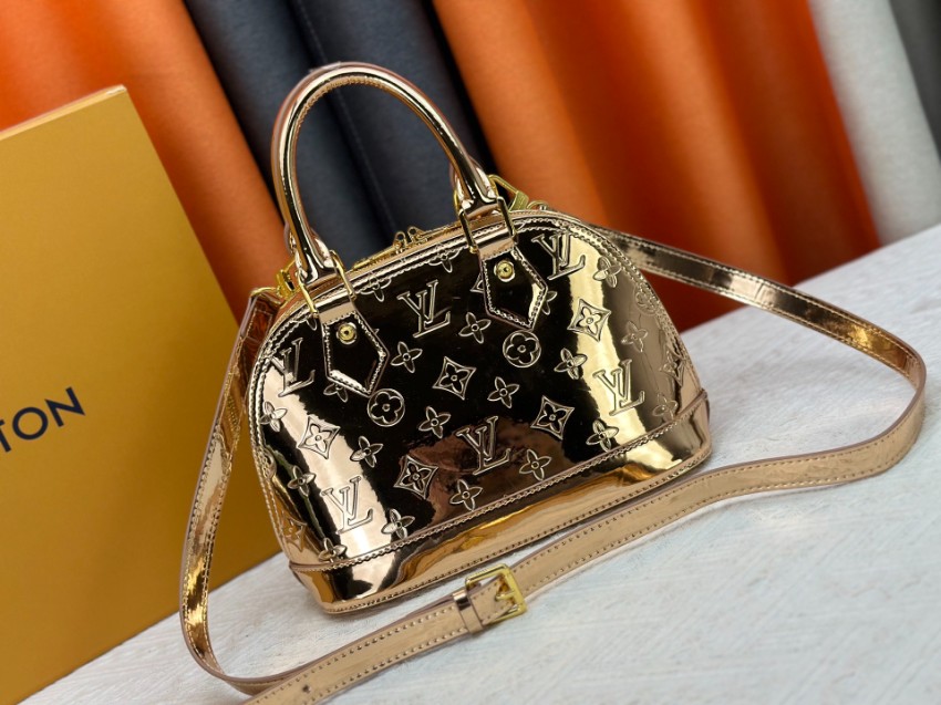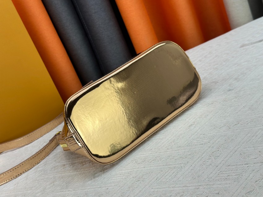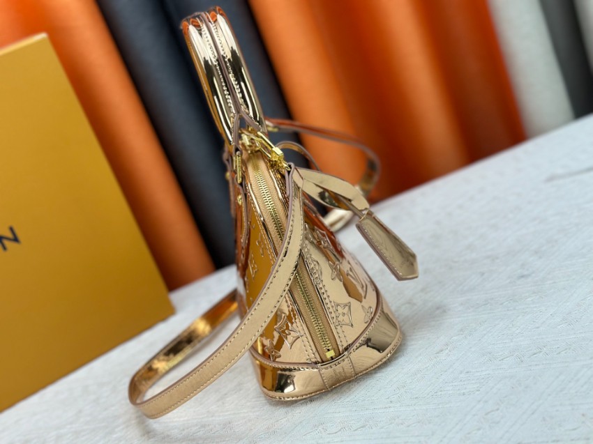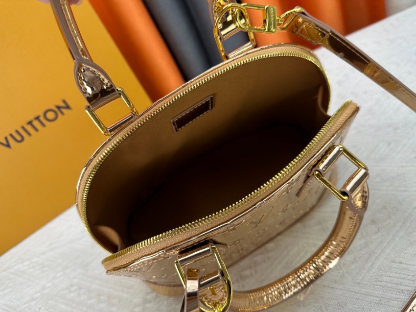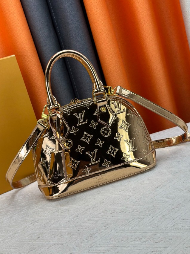 商品説明:ルイヴィトンの定番アルマシリーズをベースにした並行輸入品ミニボストンバッグは、ゴールドカラーのパテントモノグラムが印象的なラグジュアリーデザイン。鏡面のような光沢が美しく、光を受けて輝く存在感がコーディネートを華やかに演出します。丸みのあるアルマ特有のフォルムが女性らしさを引き立て、ゴールドハンドルとストラップが統一感を持たせた上品な仕上がりです。ハンドバッグとしてはもちろん、ショルダーストラップを使用した斜め掛けにも対応する2WAY仕様で、シーンに応じた使い分けが可能。コンパクトながら収納力もあり、財布やスマートフォンなどの必需品をすっきり収納できます。パーティーやお出かけなど幅広いシーンで活躍する、アルマシリーズの魅力を堪能できるレディースバッグです。