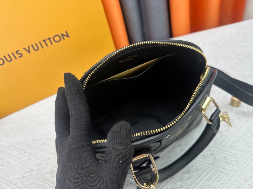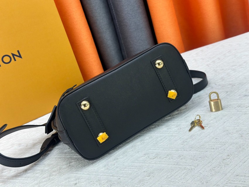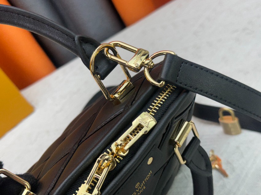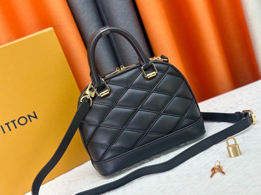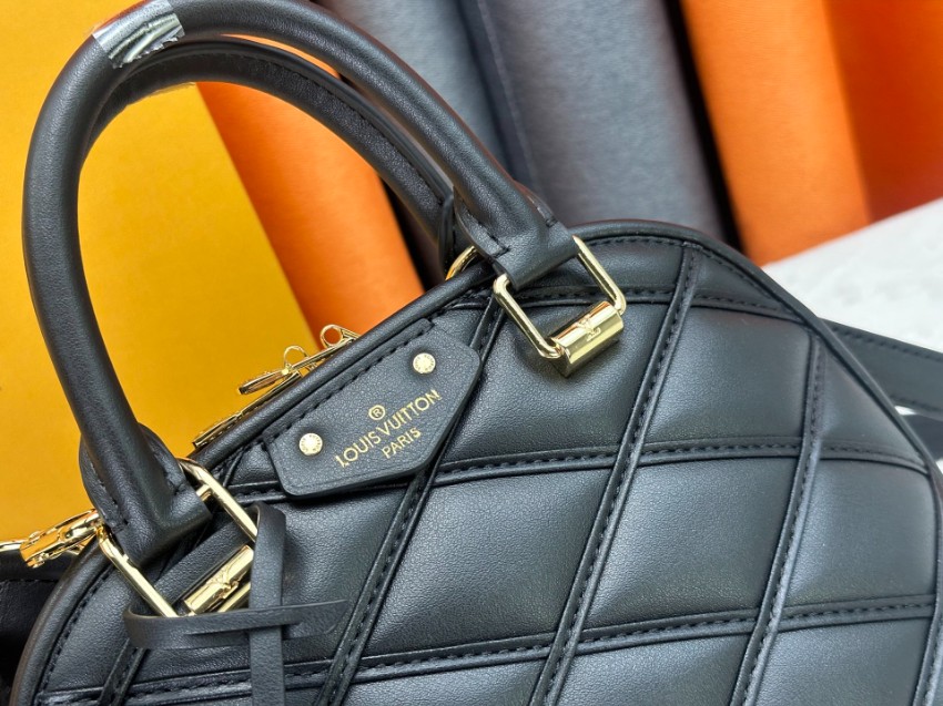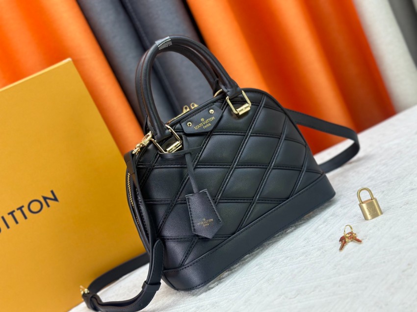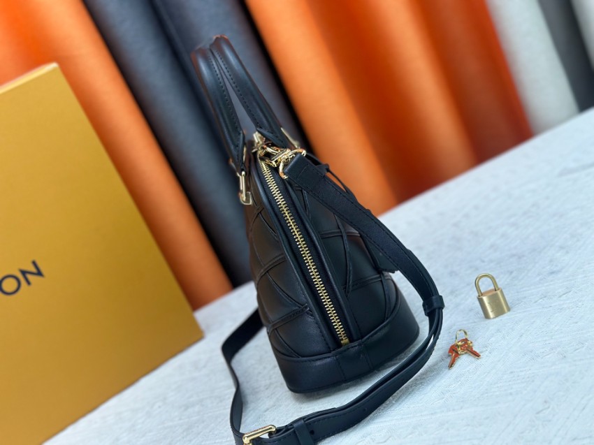 アルマをベースにしたコピー コンパクトバッグは、クラシックなフォルムとモダンなステッチデザインが特徴。ブラックのワントーンに斜め格子状の立体感を加え、落ち着いた中にも個性を感じさせる仕上がりです。