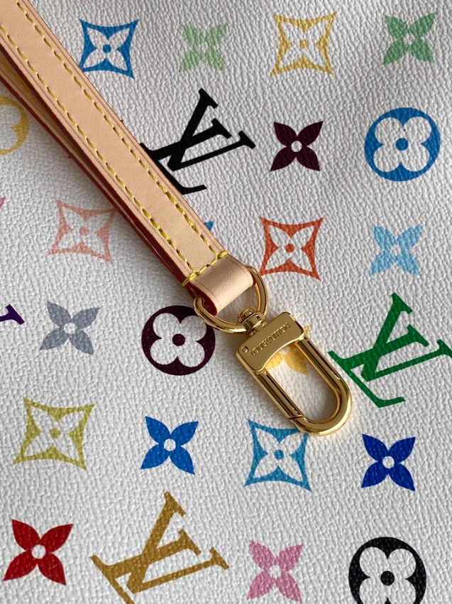 ルイヴィトンの人気シリーズ「ネヴァーフル」をベースにしたトートバッグは、ホワイトキャンバスにカラフルなモノグラムを配した華やかなデザインが魅力です。ブランドらしいアイコニックなパターンに加え、ナチュラルレザーのハンドルやトリミングが上品なアクセントとなり、カジュアルとエレガントを両立した仕上がりです。付属チャームがさりげない高級感を演出し、細部までこだわりを感じられます。