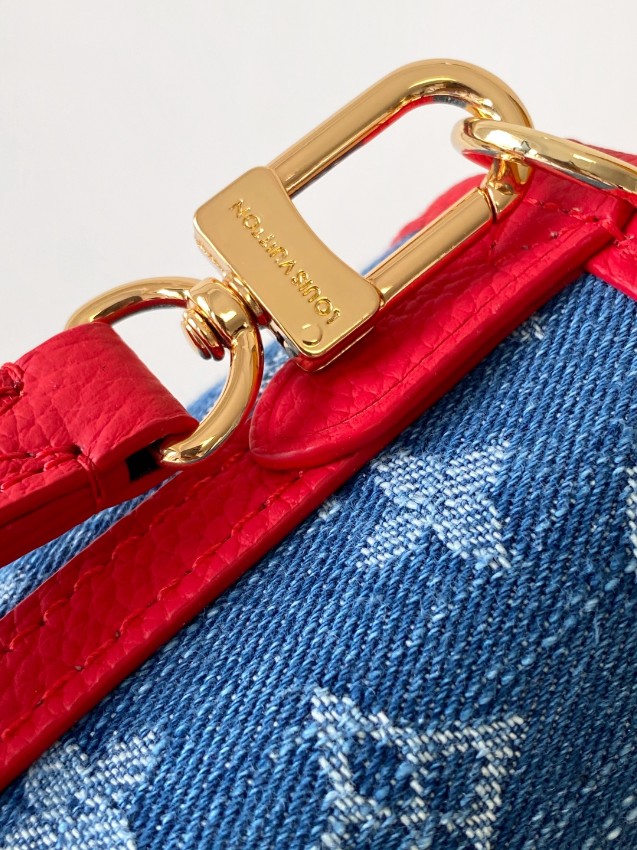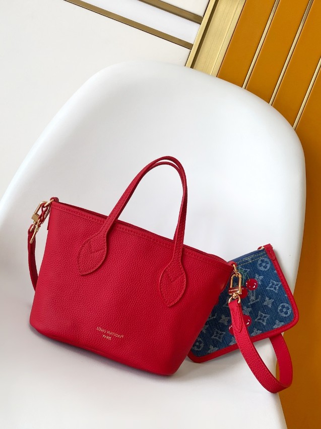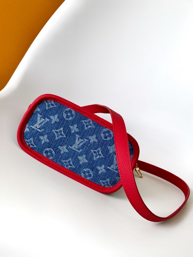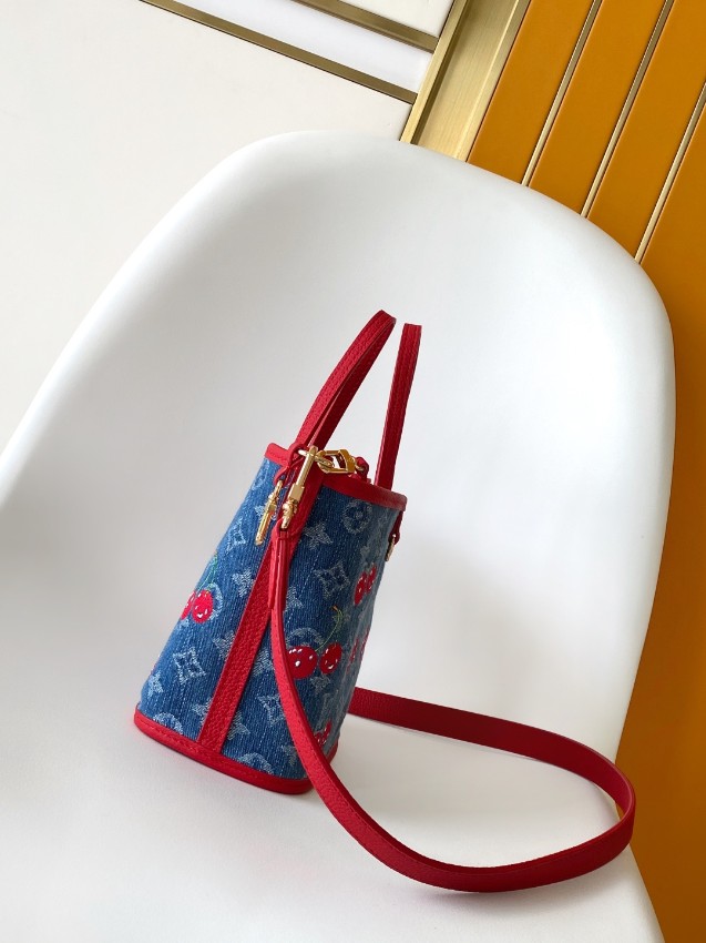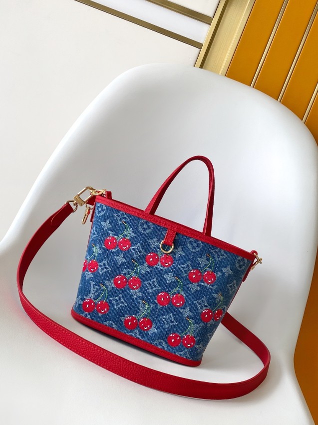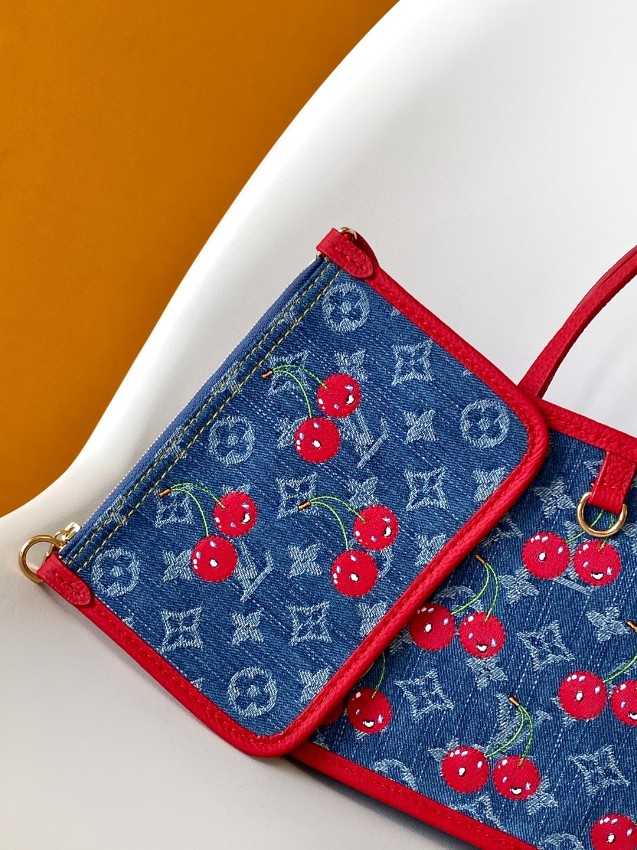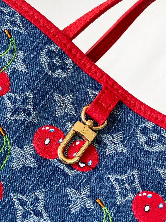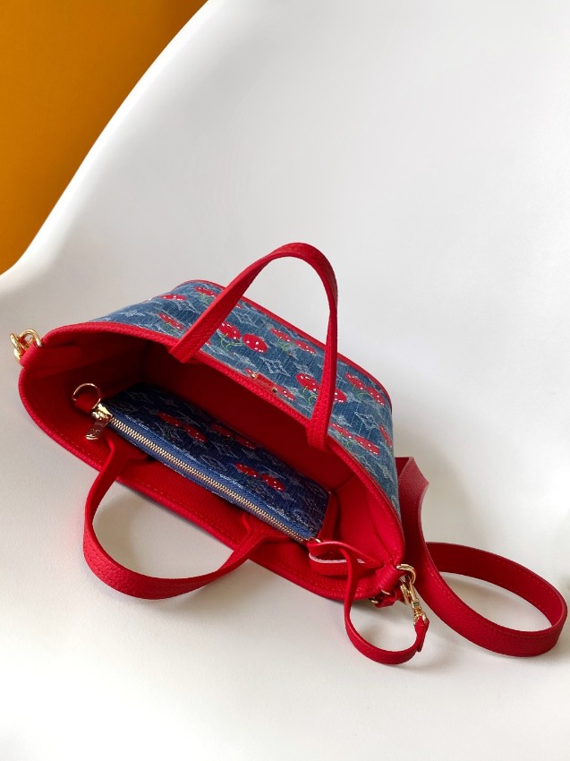 ルイヴィトンの人気シリーズ「ネヴァーフル」をモチーフにした2WAYミニバッグは、デニム素材にチェリー柄をあしらった遊び心あふれるデザインが魅力です。ブルーデニムに赤いトリミングを組み合わせることで、カジュアルながらも存在感のある仕上がりに。ブランドらしいモノグラムパターンとフルーツモチーフのバランスが絶妙で、コーディネートのアクセントとして活躍します。