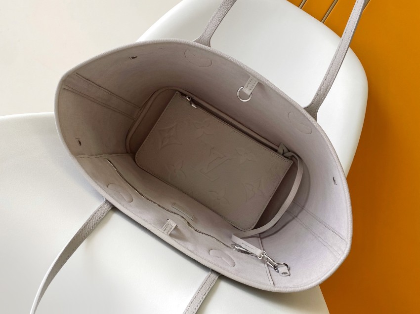 ルイヴィトンの人気シリーズ「ネヴァーフル」をベースにしたトートバッグは、清潔感あふれるホワイトカラーにエンボス加工のモノグラムを施した上品なデザインが特徴です。立体的に浮かび上がるロゴがさりげない高級感を演出し、シンプルながらも洗練された印象を与えます。ナチュラルで落ち着いたトーンは、どんなスタイルにも合わせやすく、季節を問わず活躍します。