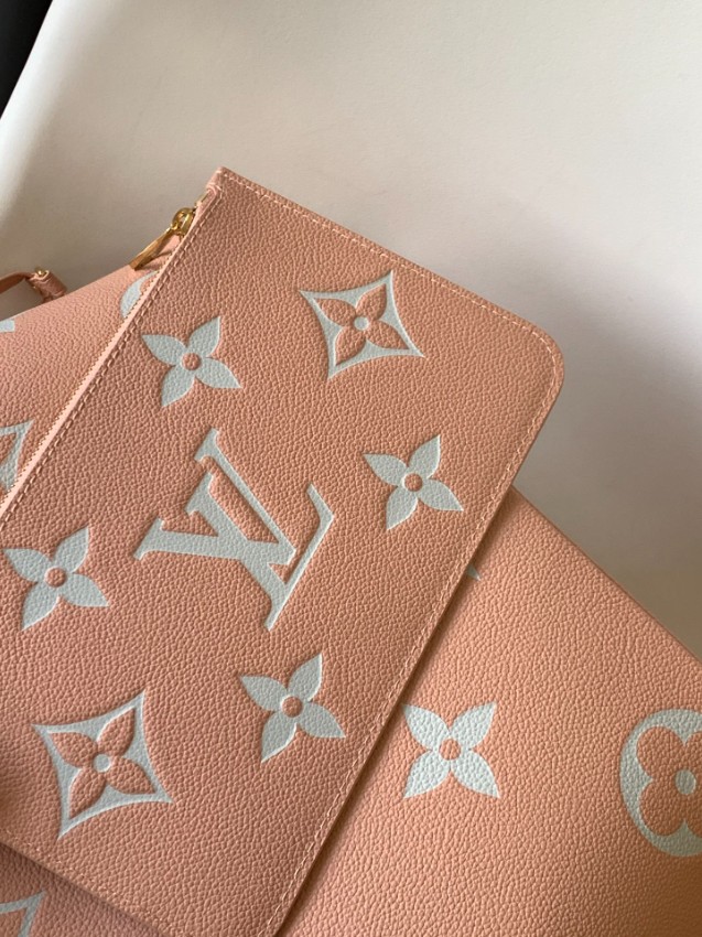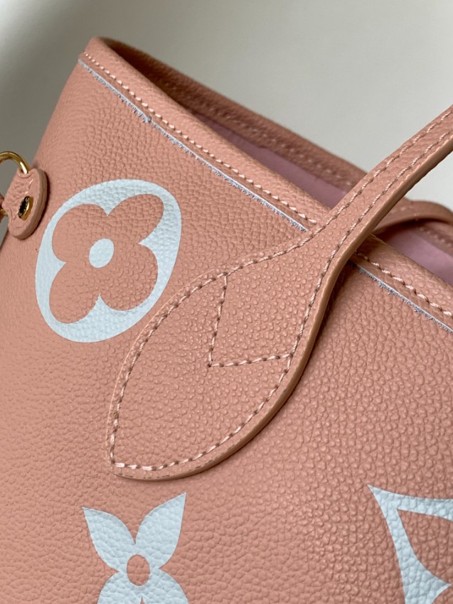 ルイヴィトンの人気シリーズ「ネヴァーフル」をベースにしたハイブランドモデル。優しいピンクカラーにホワイトのモノグラムを大胆に配置し、フェミニンで華やかな印象に仕上げられています。明るく柔らかな色合いはコーディネートのアクセントとなり、季節感のあるスタイリングにも最適です。