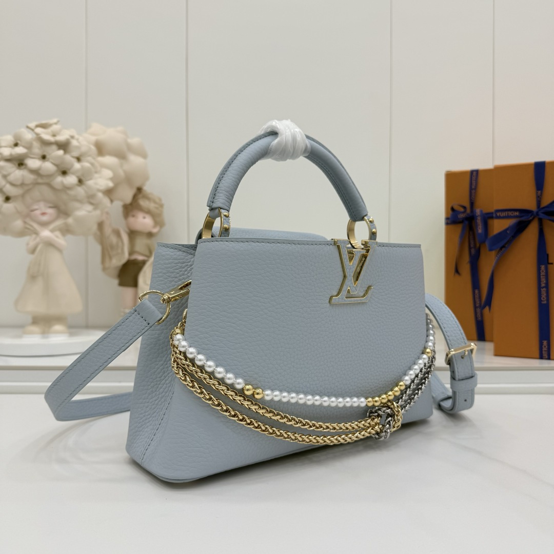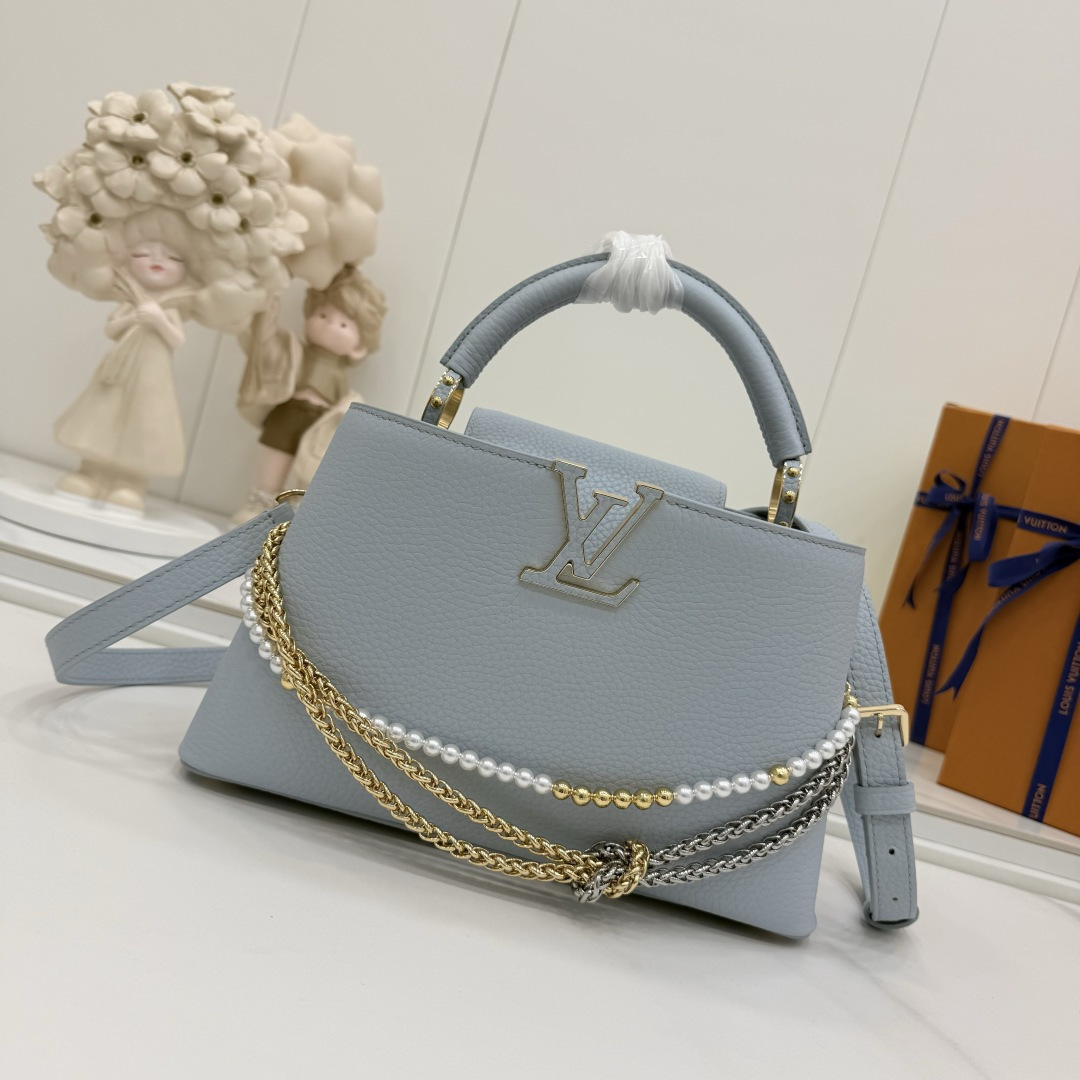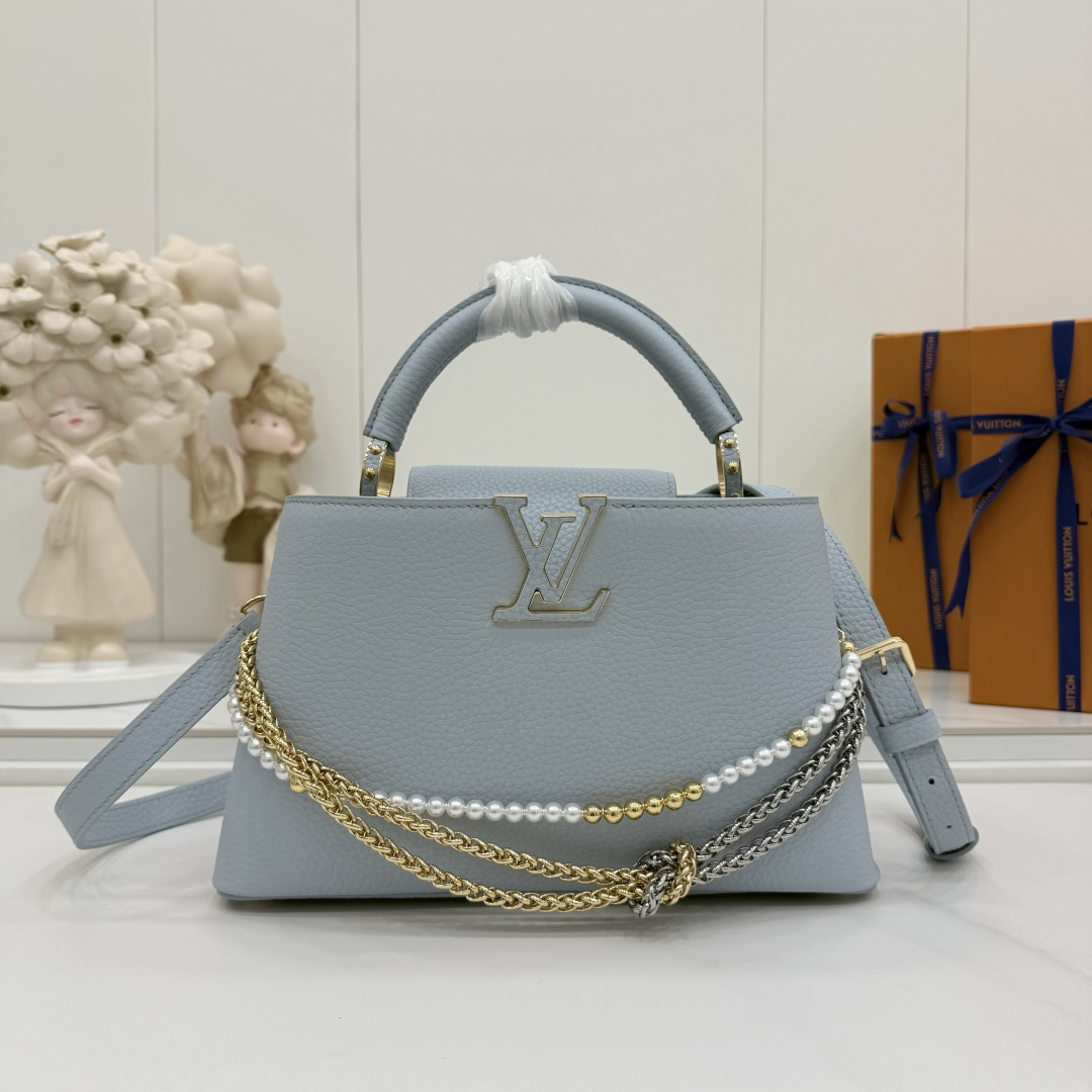 商品説明:ルイヴィトン カプシーヌシリーズのデザインを取り入れたハイブランドスタイルのミニバッグ。柔らかなシボ感のあるレザー風素材を使用し、手触りの良さと高級感をしっかり再現しています。フロントのLVロゴ金具に加え、ゴールドとシルバーのチェーン、パール装飾が絶妙に組み合わされ、シンプルながらも印象的なデザインに仕上がっています。取り外し可能なストラップ付きで、ハンドバッグとショルダーバッグの2WAYで使用可能。コンパクトながらスマートフォンや小物類をしっかり収納でき、日常使いからお出かけ、パーティーシーンまで幅広く対応します。カプシーヌ ハイブランドテイストの魅力を楽しめる、今注目のアイテムです。