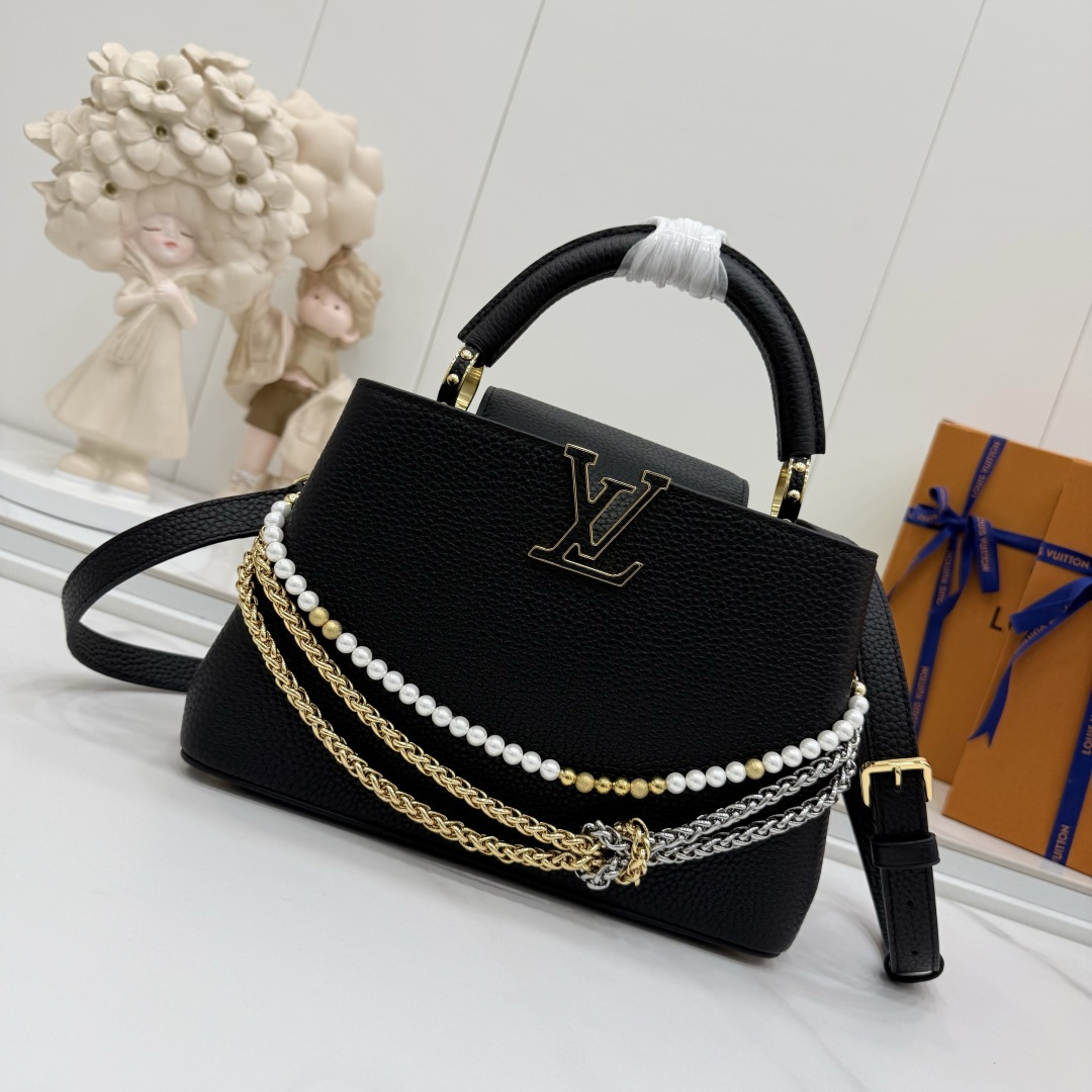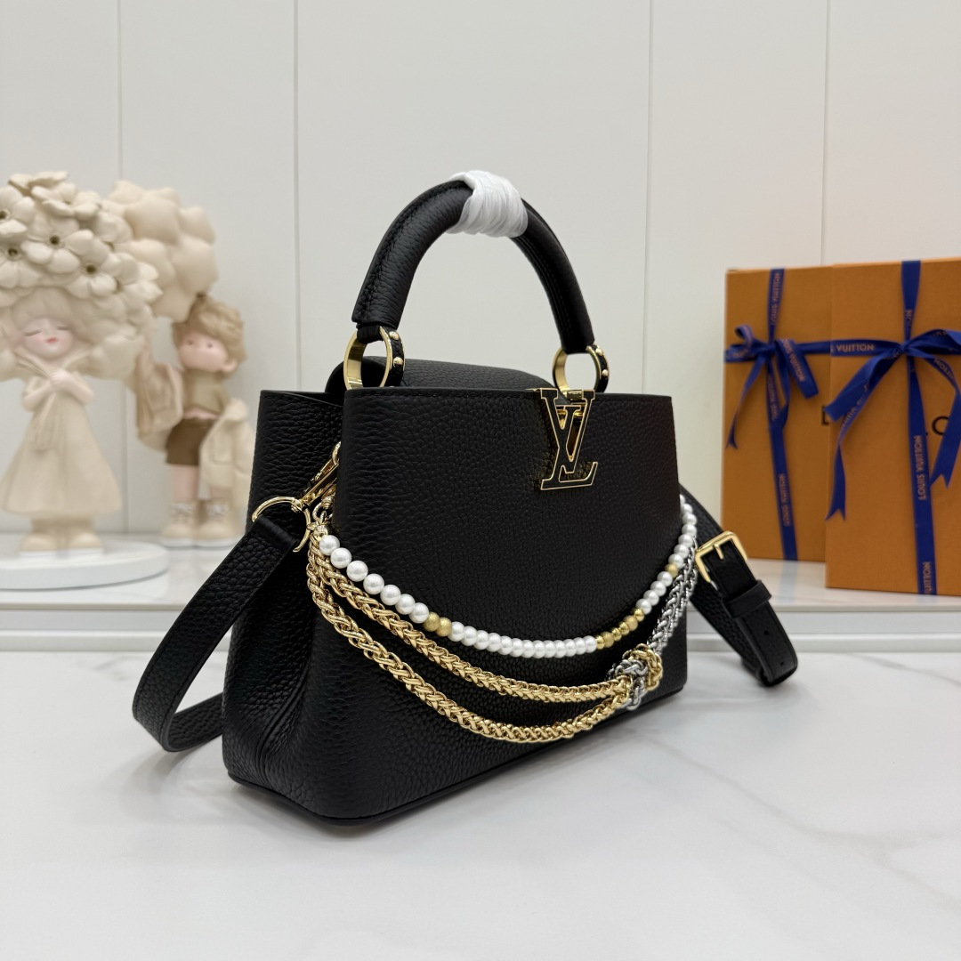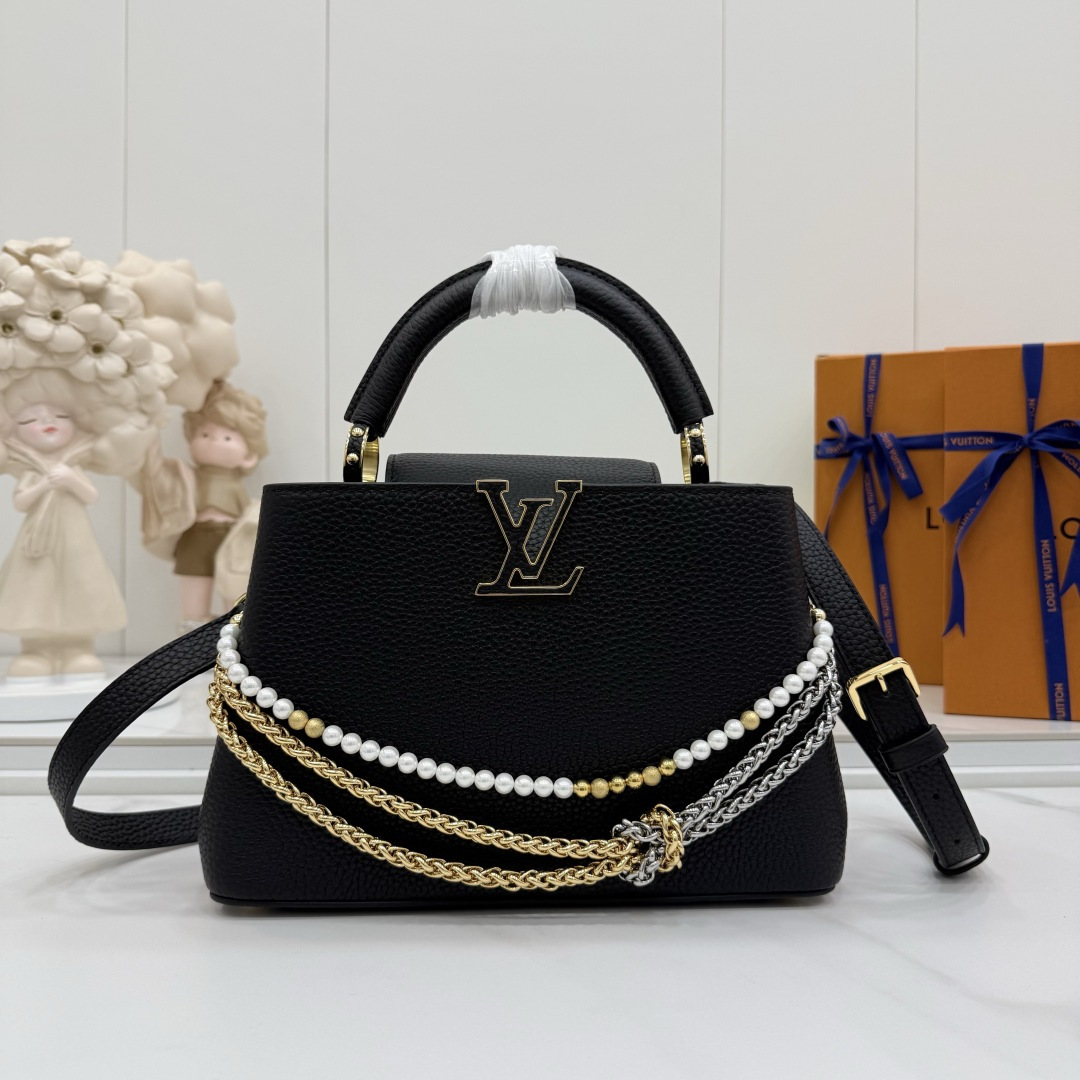商品説明:ルイヴィトン カプシーヌシリーズの魅力を落とし込んだコピー仕様のミニバッグ。細かなシボ感が特徴のレザー風素材を使用し、手触りと高級感をしっかりと再現しています。フロントのLVロゴ金具がシンプルなデザインにアクセントを加え、ゴールドとシルバーのチェーン、パール装飾が華やかな印象をプラス。取り外し可能なストラップ付きで、ハンドバッグとショルダーバッグの2WAYで使える実用的な仕様です。スマートフォンやミニウォレットなどの必需品をコンパクトに収納でき、デイリーからお出かけ、フォーマルシーンまで幅広く活躍。カプシーヌ コピーとして、スタイルを格上げする定番人気のアイテムです。