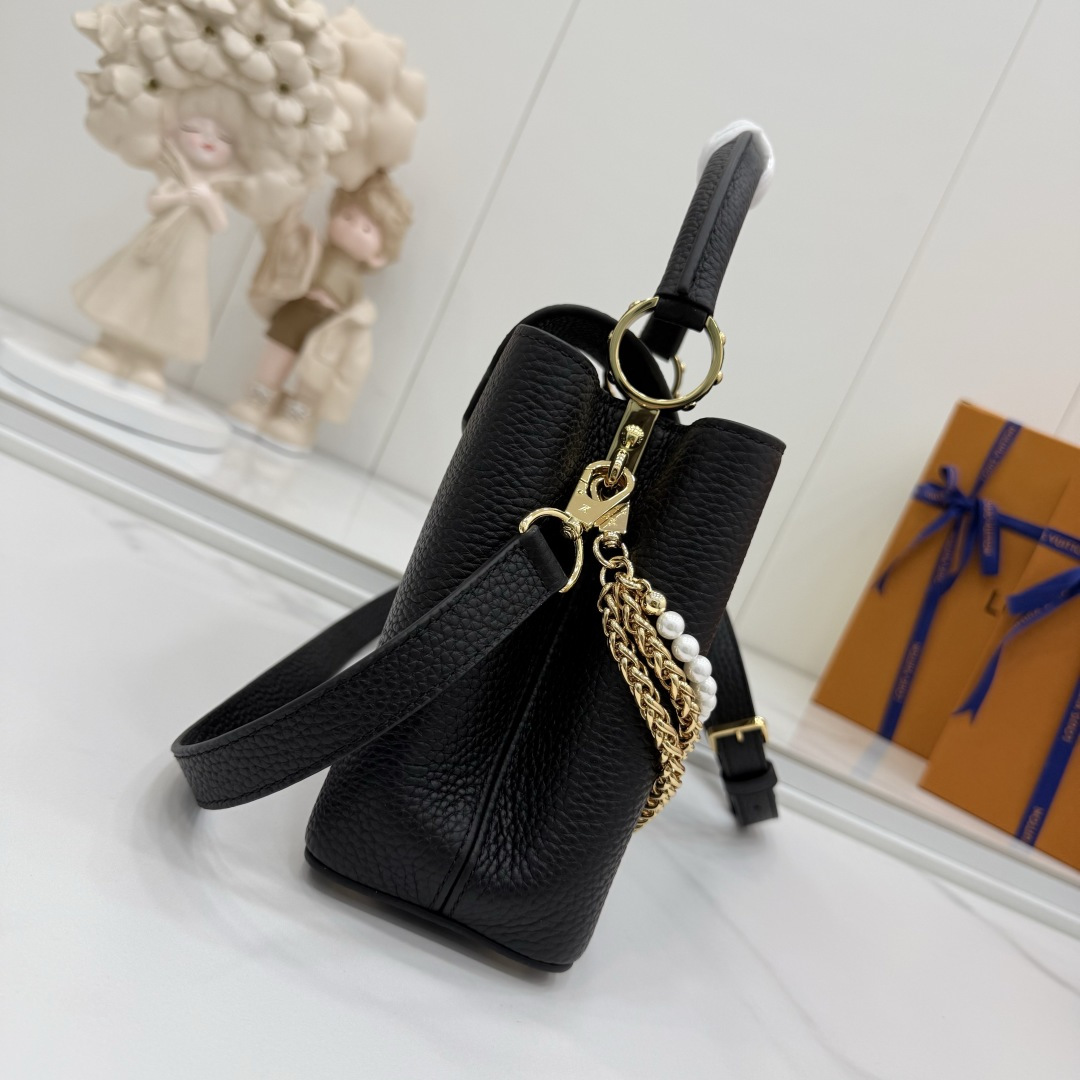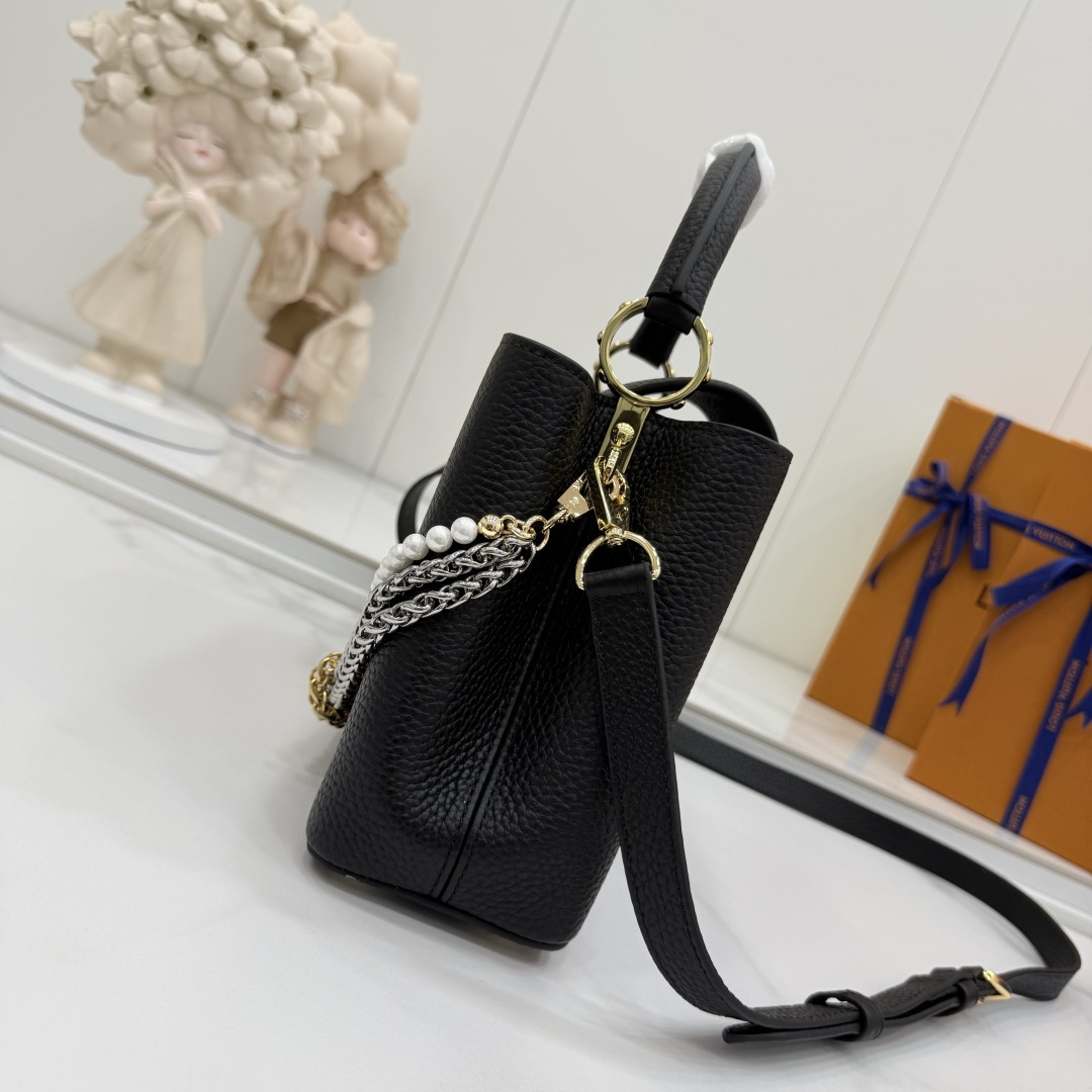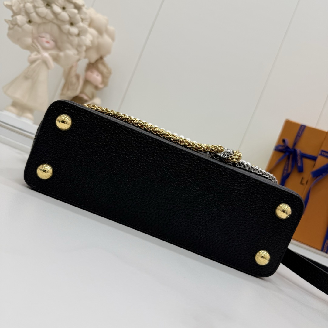 商品説明:ルイヴィトン カプシーヌシリーズの魅力を落とし込んだコピー仕様のミニバッグ。細かなシボ感が特徴のレザー風素材を使用し、手触りと高級感をしっかりと再現しています。フロントのLVロゴ金具がシンプルなデザインにアクセントを加え、ゴールドとシルバーのチェーン、パール装飾が華やかな印象をプラス。取り外し可能なストラップ付きで、ハンドバッグとショルダーバッグの2WAYで使える実用的な仕様です。スマートフォンやミニウォレットなどの必需品をコンパクトに収納でき、デイリーからお出かけ、フォーマルシーンまで幅広く活躍。カプシーヌ コピーとして、スタイルを格上げする定番人気のアイテムです。