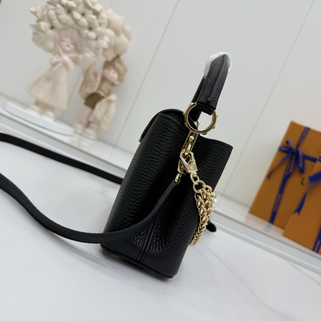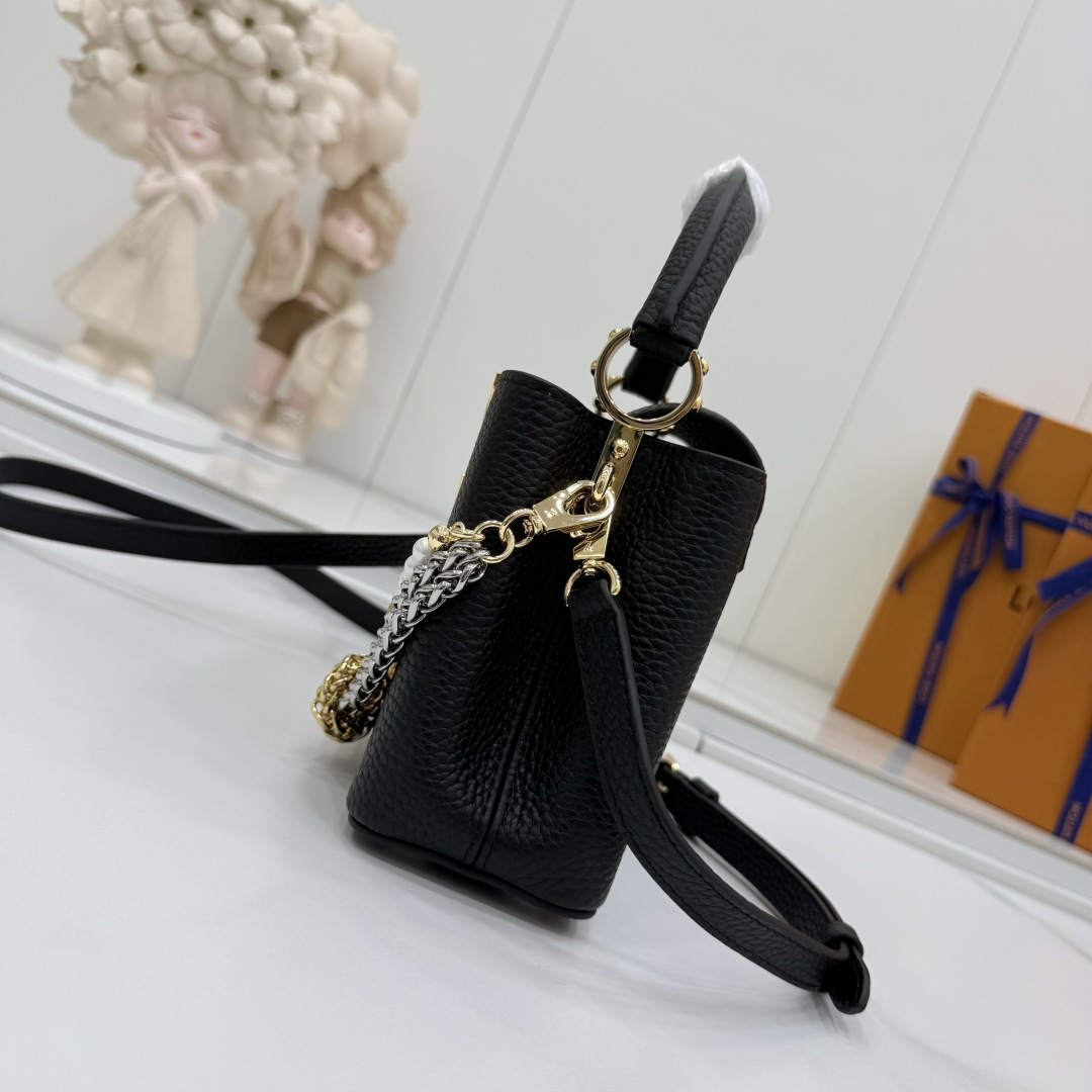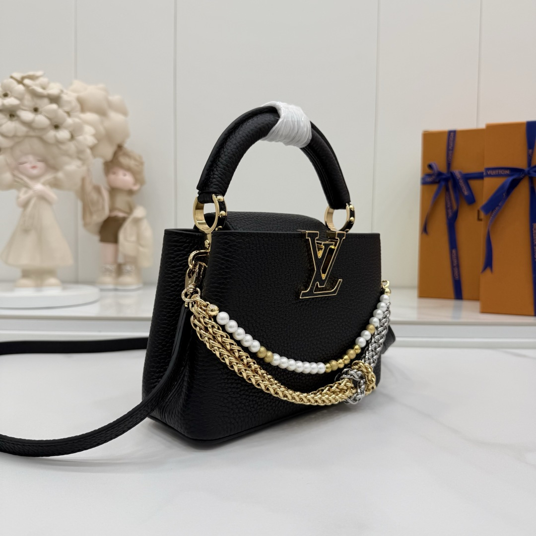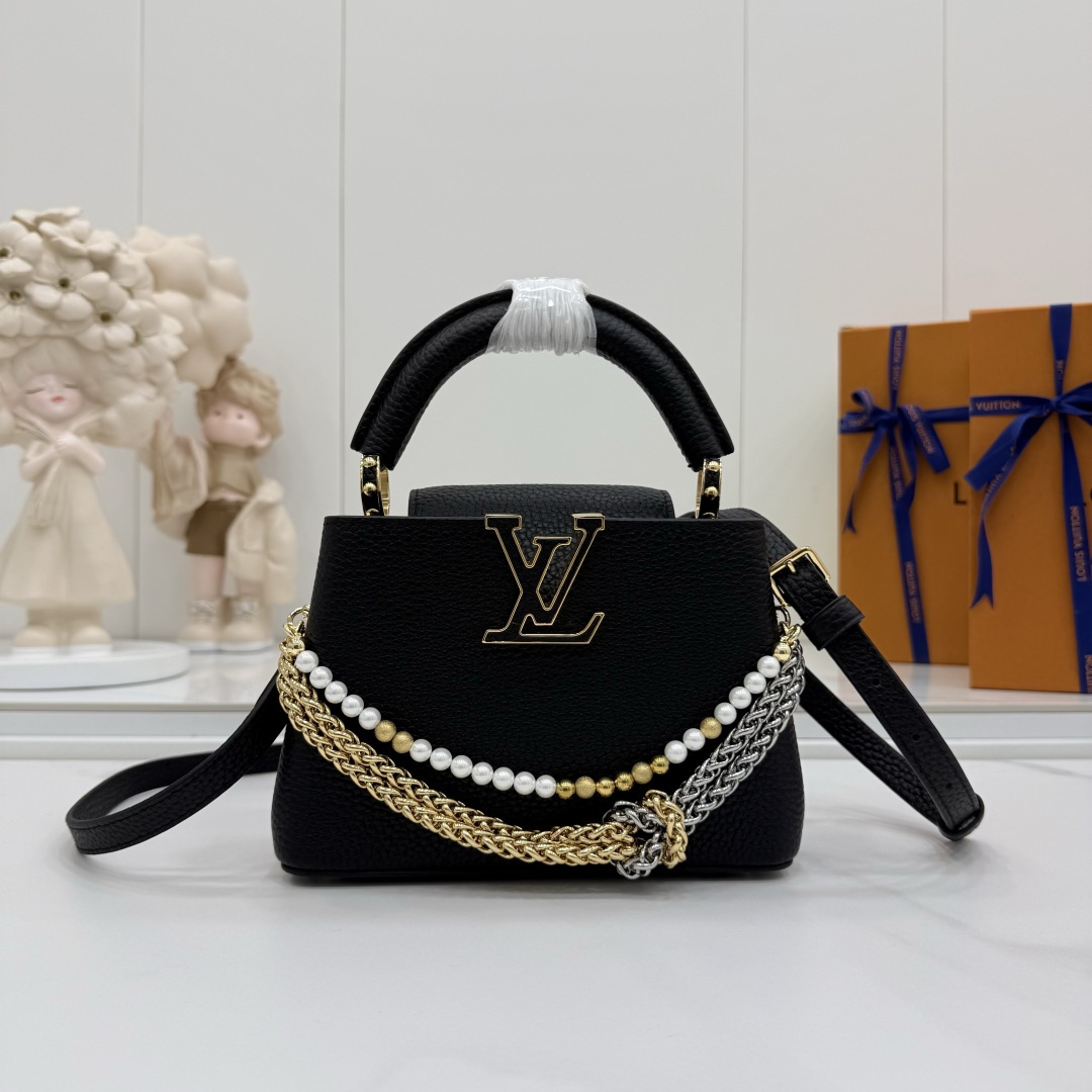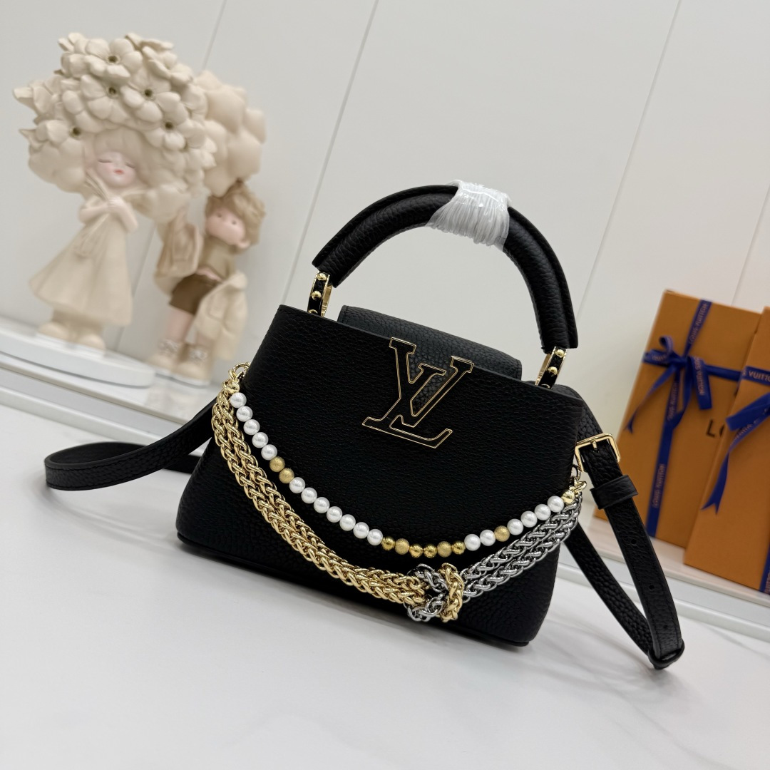 商品説明:ルイヴィトン カプシーヌシリーズの魅力を表現したスーパーコピー 届く仕様の2WAYミニバッグ。細かなシボ感のあるレザー風素材を使用し、手触りと高級感を兼ね備えた仕上がりです。フロントのLVロゴ金具がシンプルなフォルムにアクセントを加え、さらにゴールドとシルバーのチェーン、パール装飾が華やかさを引き立てます。取り外し可能なストラップ付きで、ハンドバッグとしてもショルダーバッグとしても使用可能。スマートフォンやミニウォレットなど必要なアイテムをしっかり収納でき、日常使いからお出かけ、フォーマルシーンまで幅広く対応します。カプシーヌ スーパーコピー 届くとして、実用性とデザイン性を兼ね備えた売れ筋アイテムです。