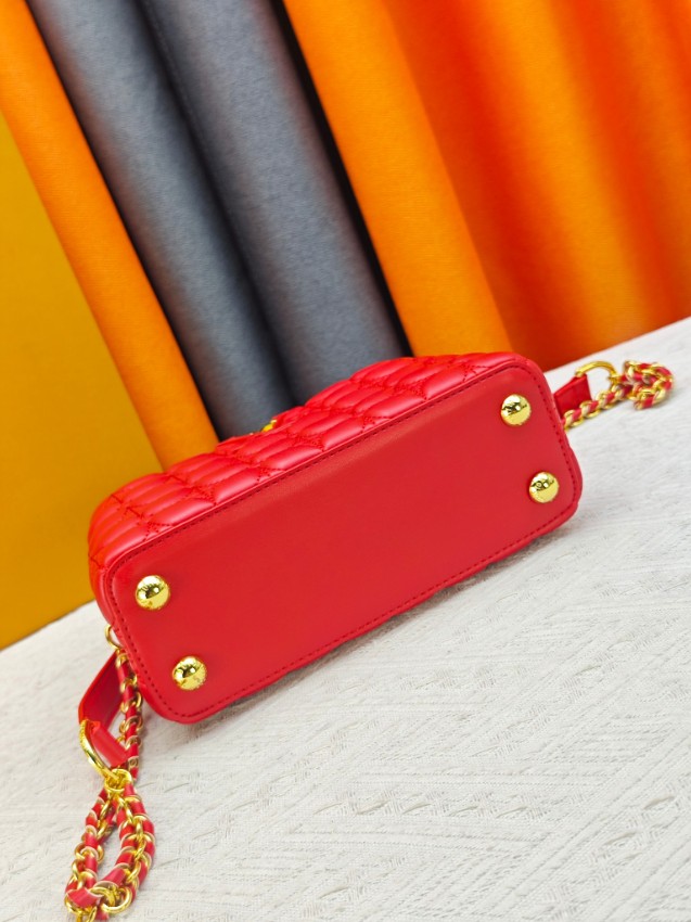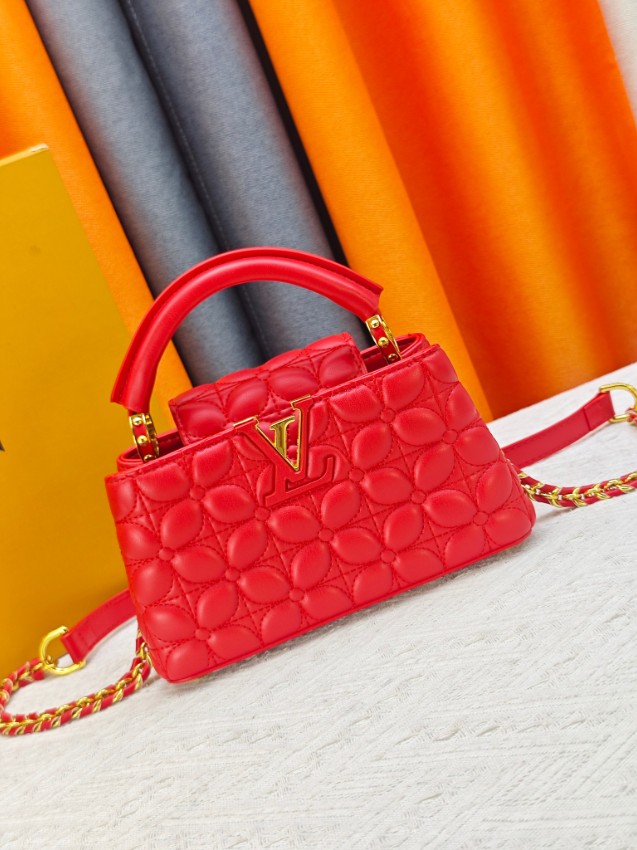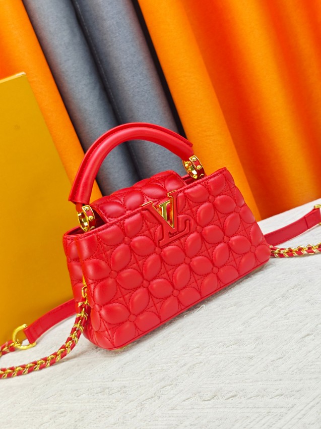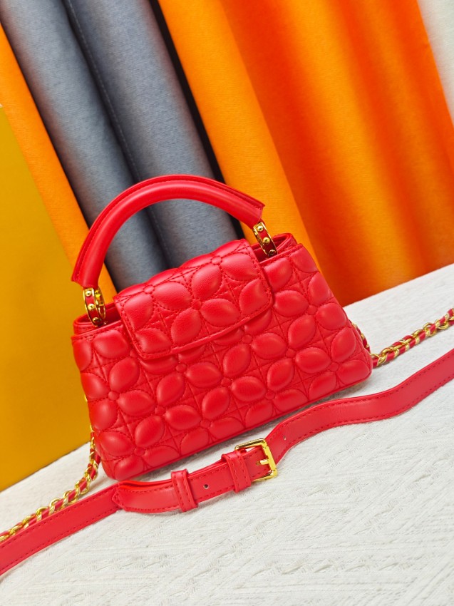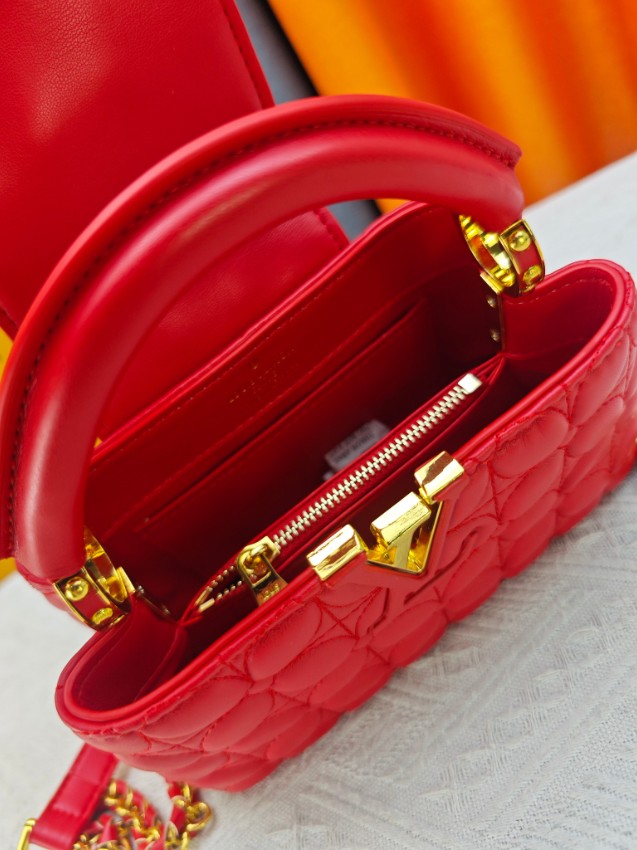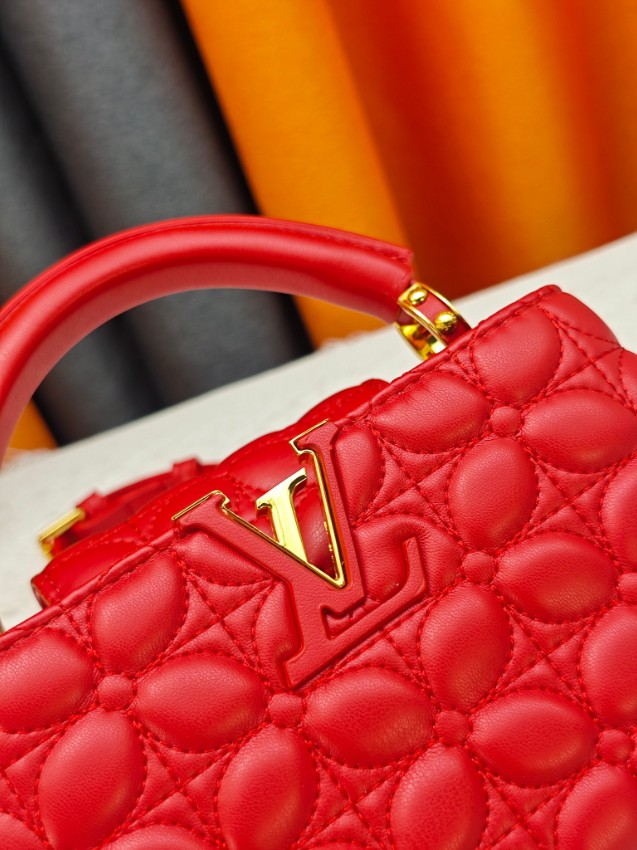 商品説明:ルイヴィトン カプシーヌシリーズの魅力を取り入れたハイブランドスタイルの2WAYミニバッグ。立体感のあるキルティング風加工が施されたレザー風素材を使用し、柔らかな質感と高級感を兼ね備えた仕上がりです。フロントのLVロゴ金具がデザインのアクセントとなり、鮮やかなレッドカラーと相まって印象的な雰囲気を演出。取り外し可能なストラップ付きで、ハンドバッグとしてもショルダーバッグとしても使用できる実用的な仕様です。コンパクトなサイズながらスマートフォンやミニウォレットなどの必需品をしっかり収納でき、デイリーコーデからお出かけ、パーティーシーンまで幅広く活躍。カプシーヌ ハイブランドとして、スタイルを引き立てる新作アイテムです。
