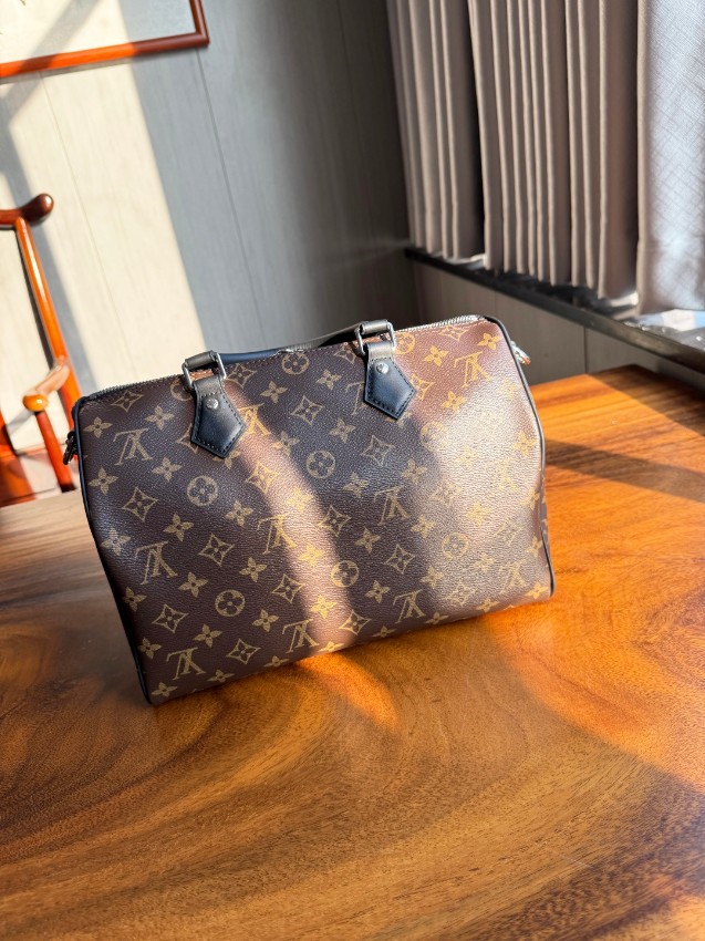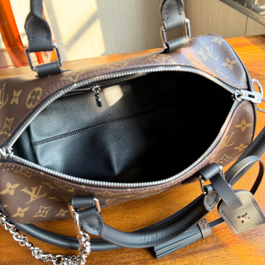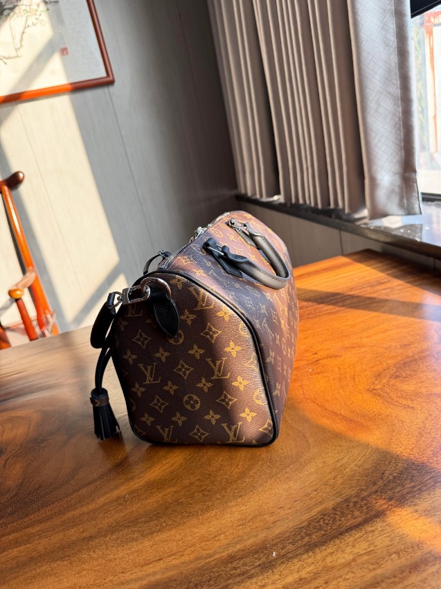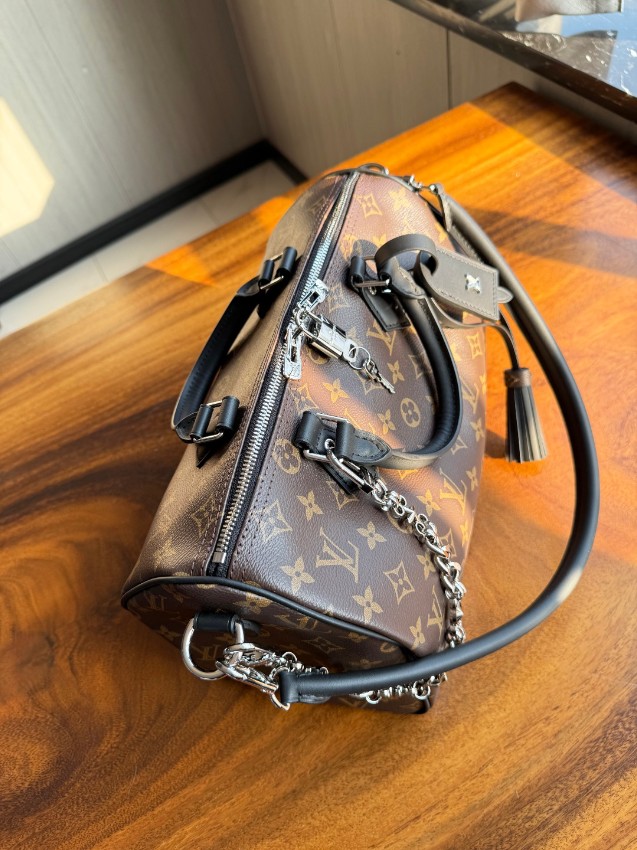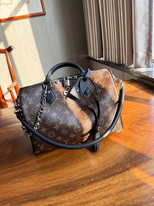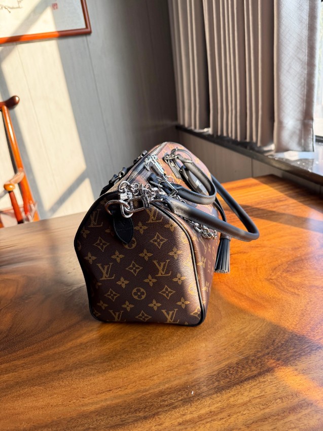 ルイヴィトン ナノスピーディのクラシックなモノグラムキャンバスに、ブラックレザーのハンドルやディテールを組み合わせたハイブランドテイストのモデル。ブラウンとブラックのコントラストがスタイリッシュで、大人の洗練された雰囲気を引き立てます。さらにチェーンディテールやタッセルがアクセントとなり、シンプルながらも個性を感じさせるデザインに仕上がっています。2WAYハンドバッグ仕様で、手持ちとショルダーの両方に対応し、シーンに応じた使い分けが可能。収納力もあり、スマートフォンやミニウォレットなど日常必需品をしっかり収納できます。ハイブランドの雰囲気を気軽に楽しめる一品として、ナノスピーディならではの美しいフォルムと実用性を兼ね備えたおすすめモデルです。