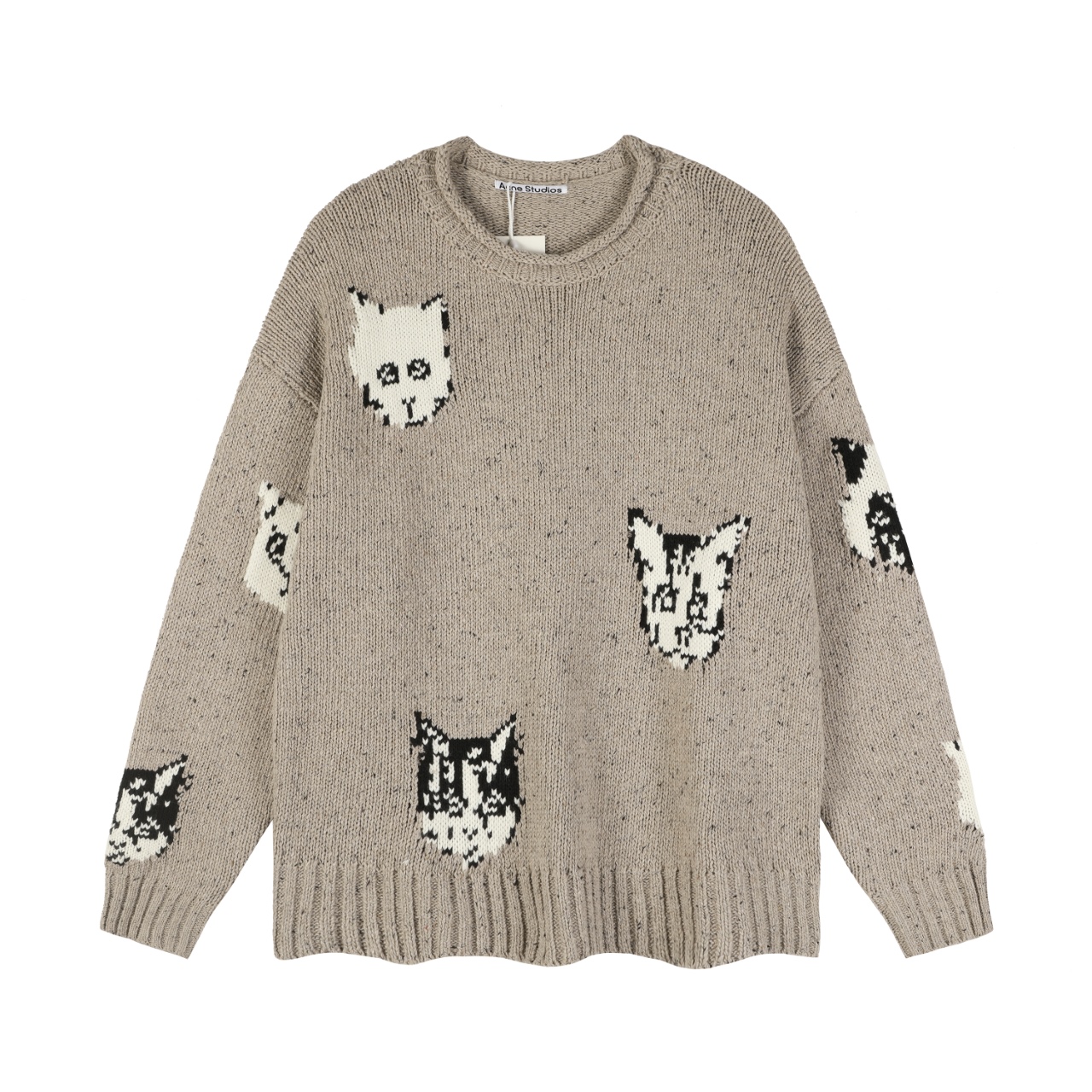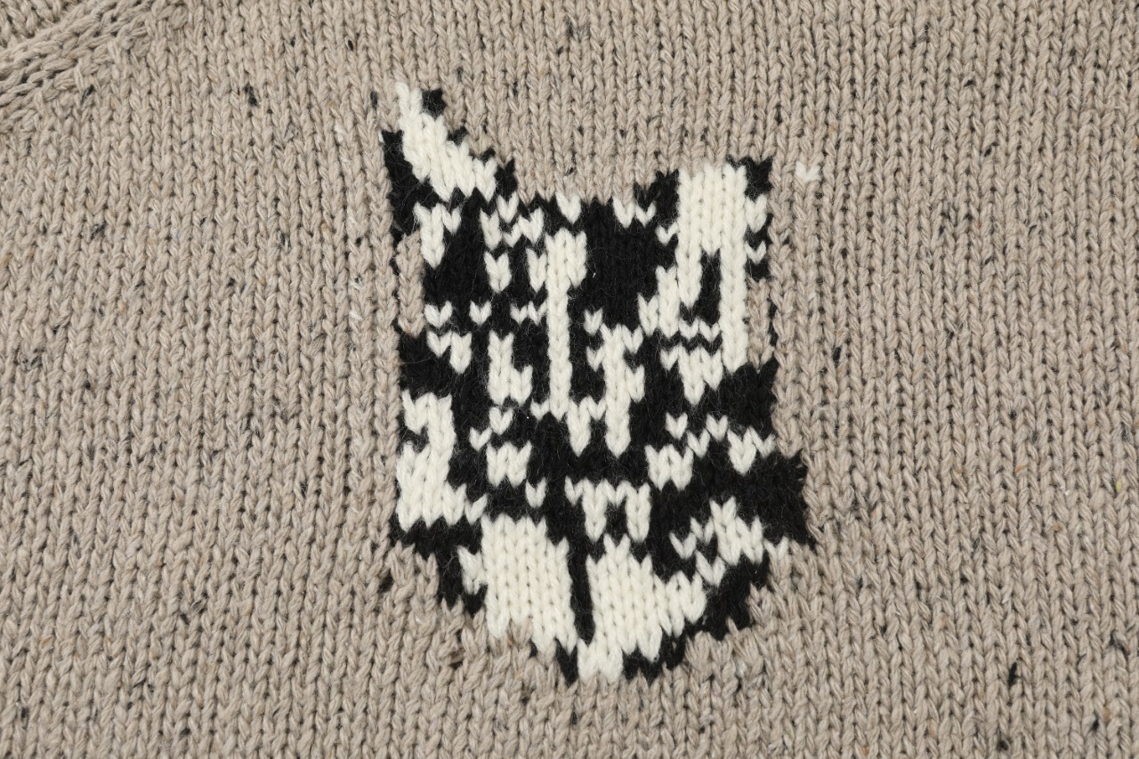 アクネ ストゥディオズ(Acne Studios)らしいユニークな表情の猫を散りばめた、存在感のあるジャカードニット。さりげなくムラ感のあるベージュベースは、落ち着いた印象を持ちながらもキャッチーなデザインを引き立てます。猫の表情ごとに編み目を変えることで立体的な見え方になっており、ブランド コピーとは思えない丁寧な作りが魅力。ややゆったりめのシルエットは着回しやすく、デニムはもちろんスラックスとも好相性。程よい厚みで秋冬のデイリーにも最適です。デザイン性と実用性のバランスが良く、ファッション感度の高いユーザーから高く支持される一枚です。