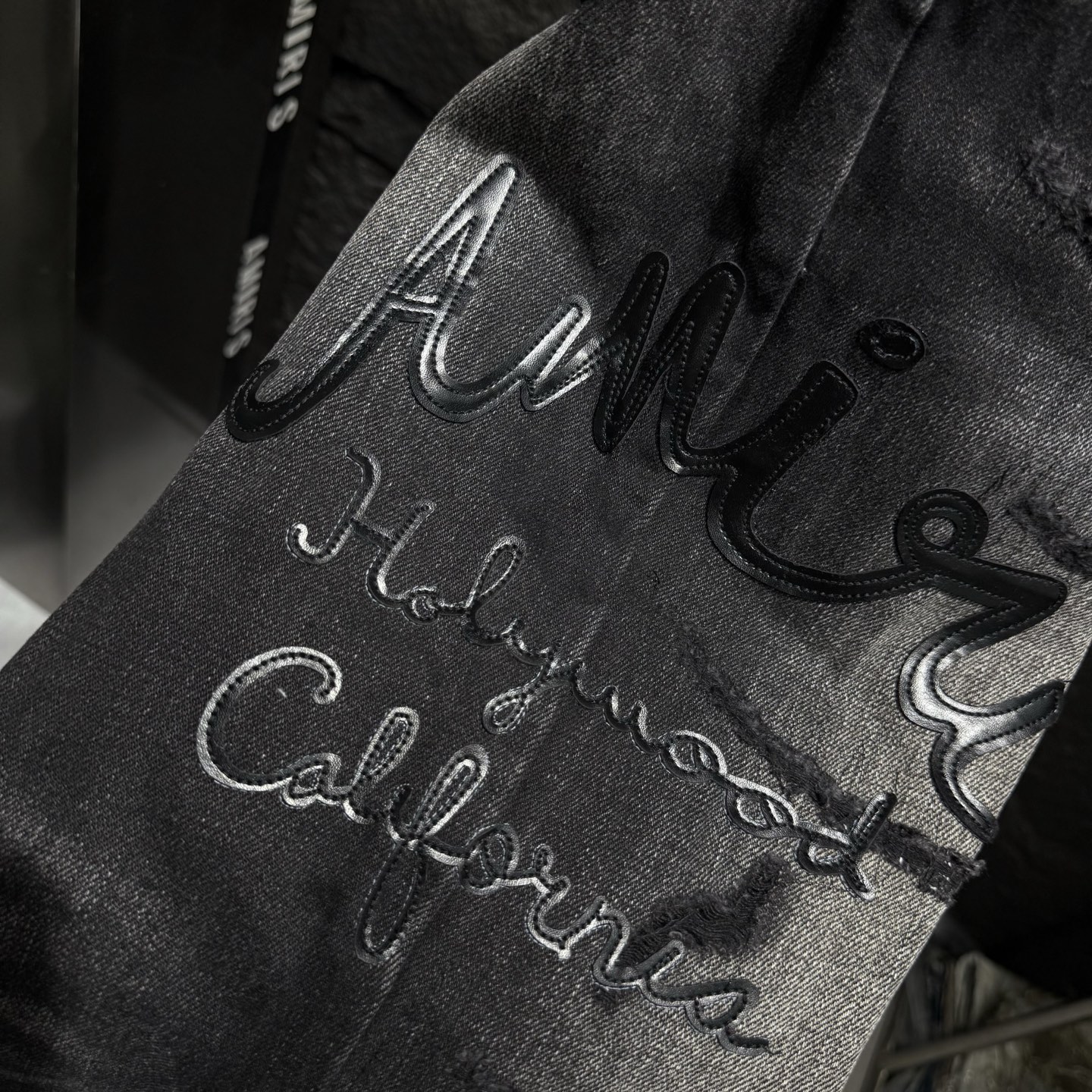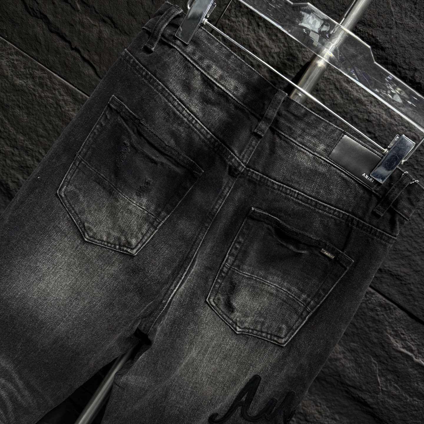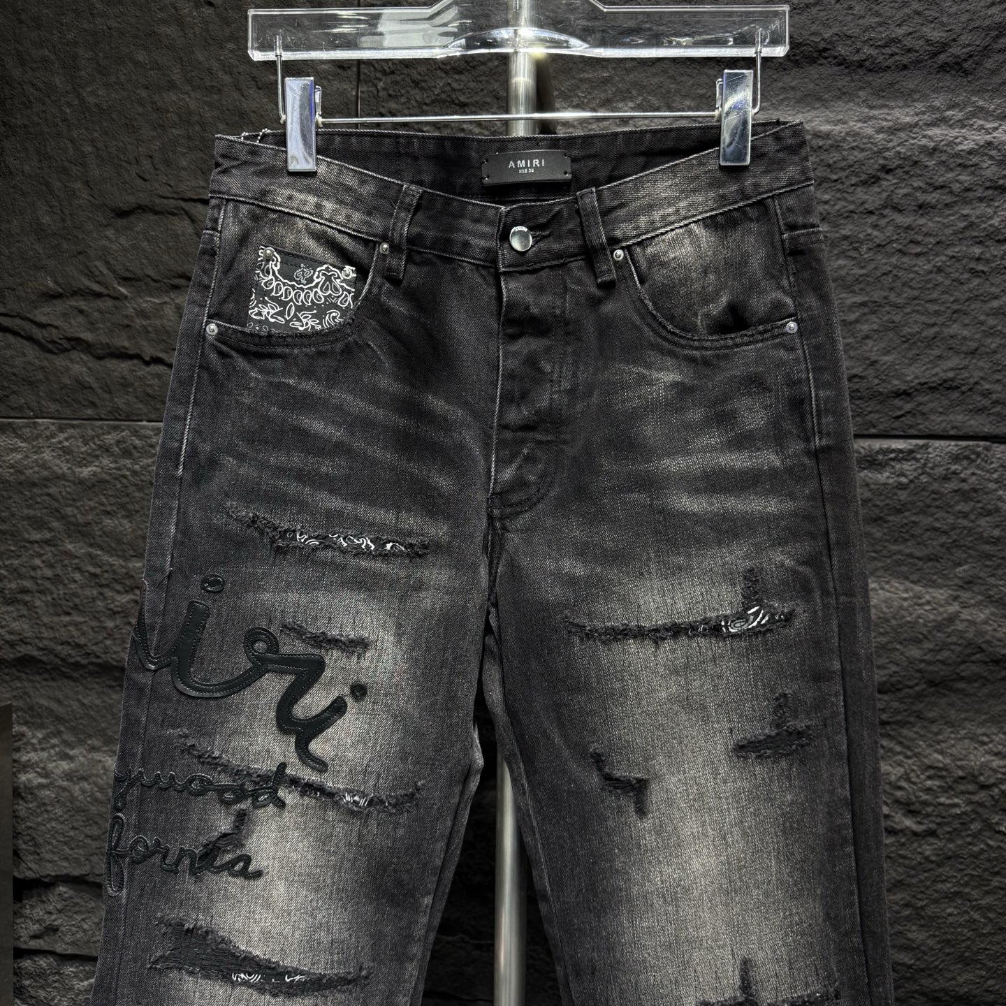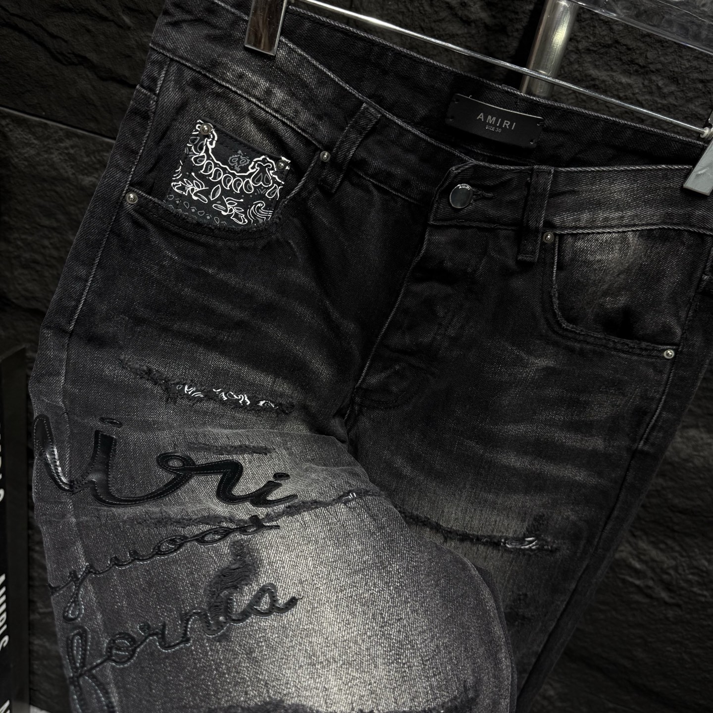 アミリ ブランド コピー ブラックデニム ダメージ加工 刺繍デザイン モード系モデル