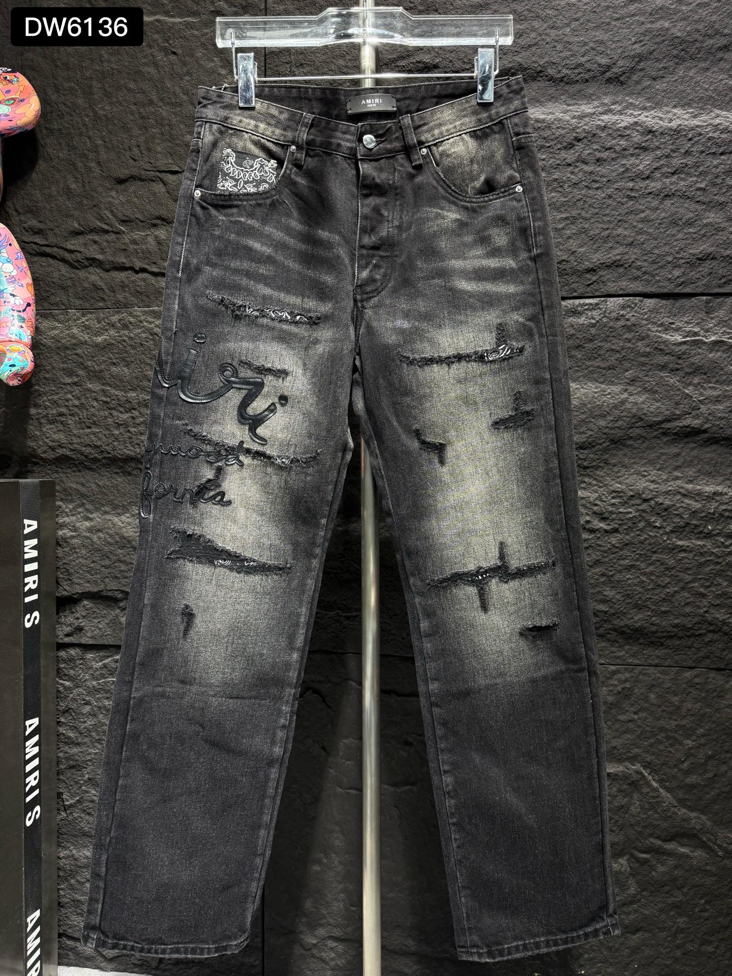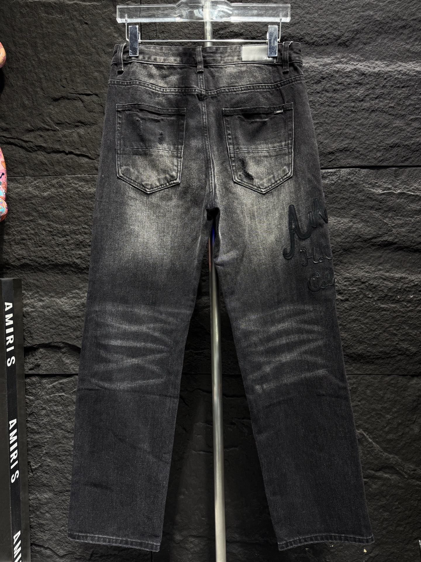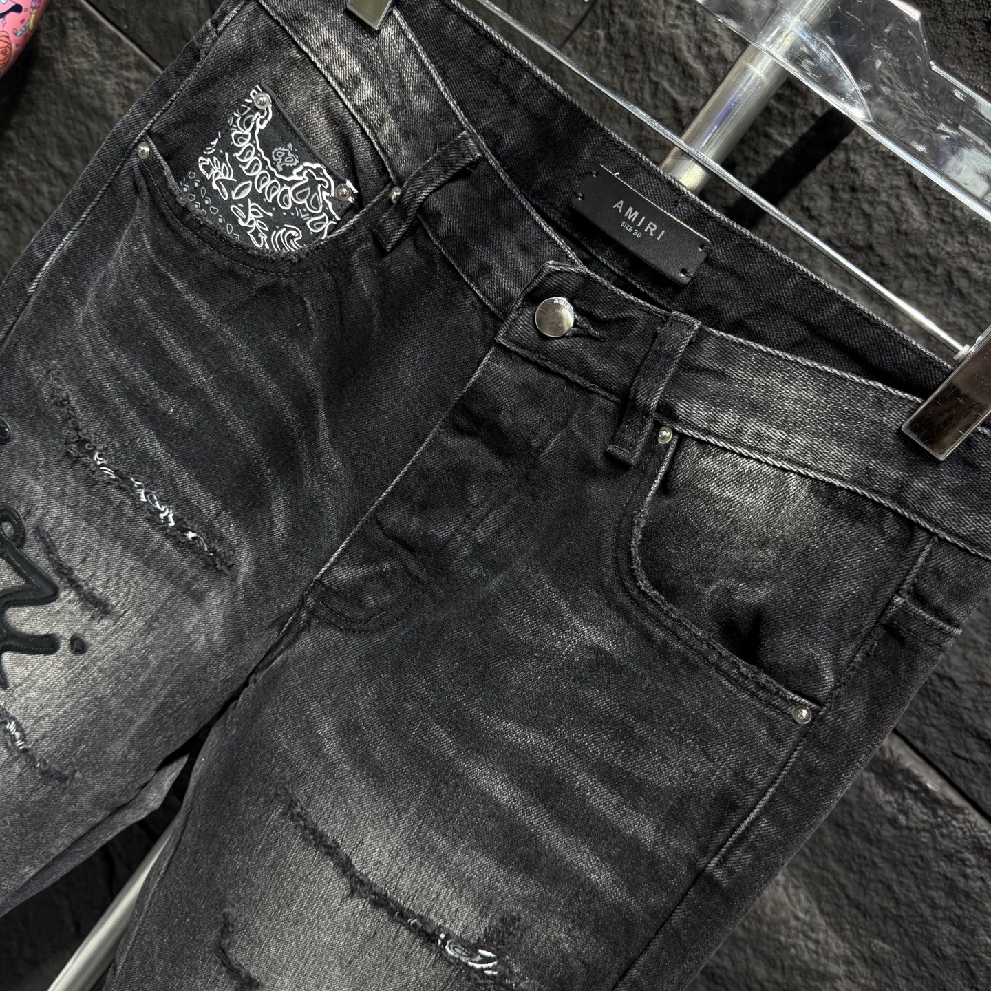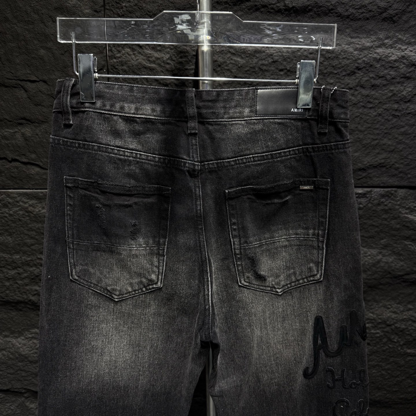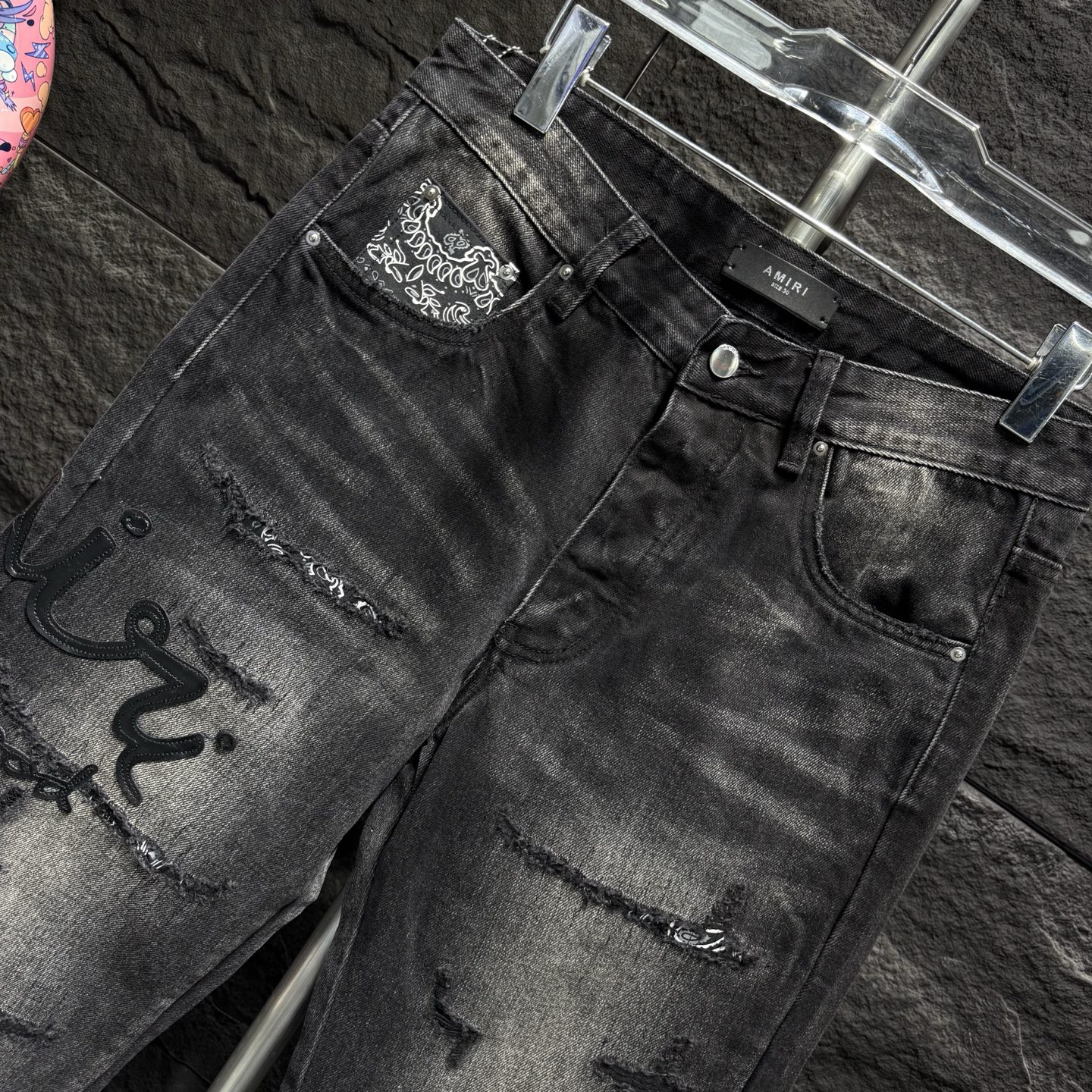 アミリ ブランド コピー ブラックデニム ダメージ加工 刺繍デザイン モード系モデル
