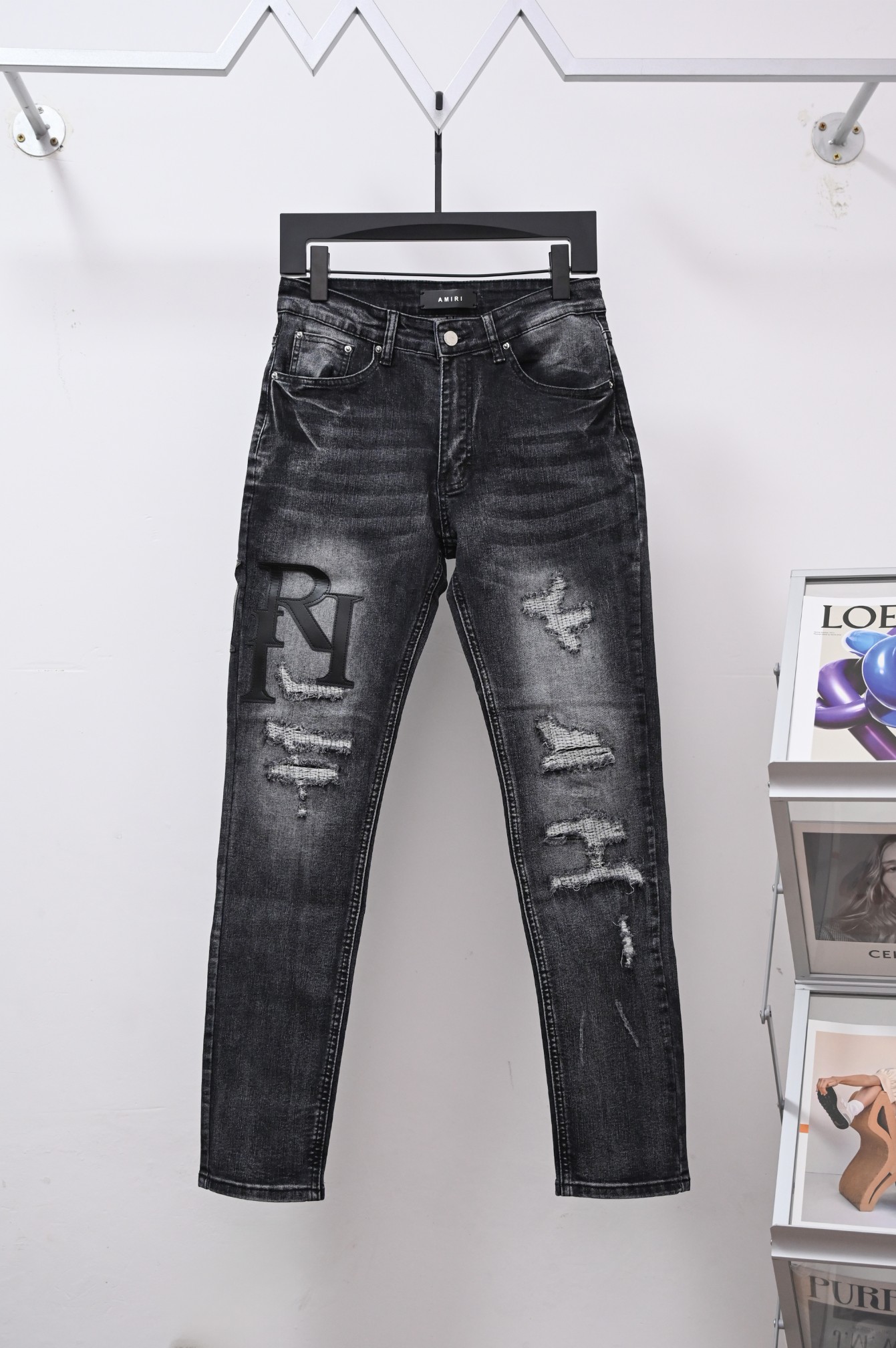 ブラックデニムをベースにダメージ加工を施したAMIRI風デニムパンツです。ヴィンテージ感のあるウォッシュ加工と立体的なダメージディテールが特徴で、ストリート感のあるスタイルを演出します。フロントにはブランド風ロゴを配置し、シンプルながらも存在感のあるデザインに仕上がっています。スリムフィットのシルエットで脚のラインを綺麗に見せ、カジュアルコーデやストリートファッションにおすすめの一本です。