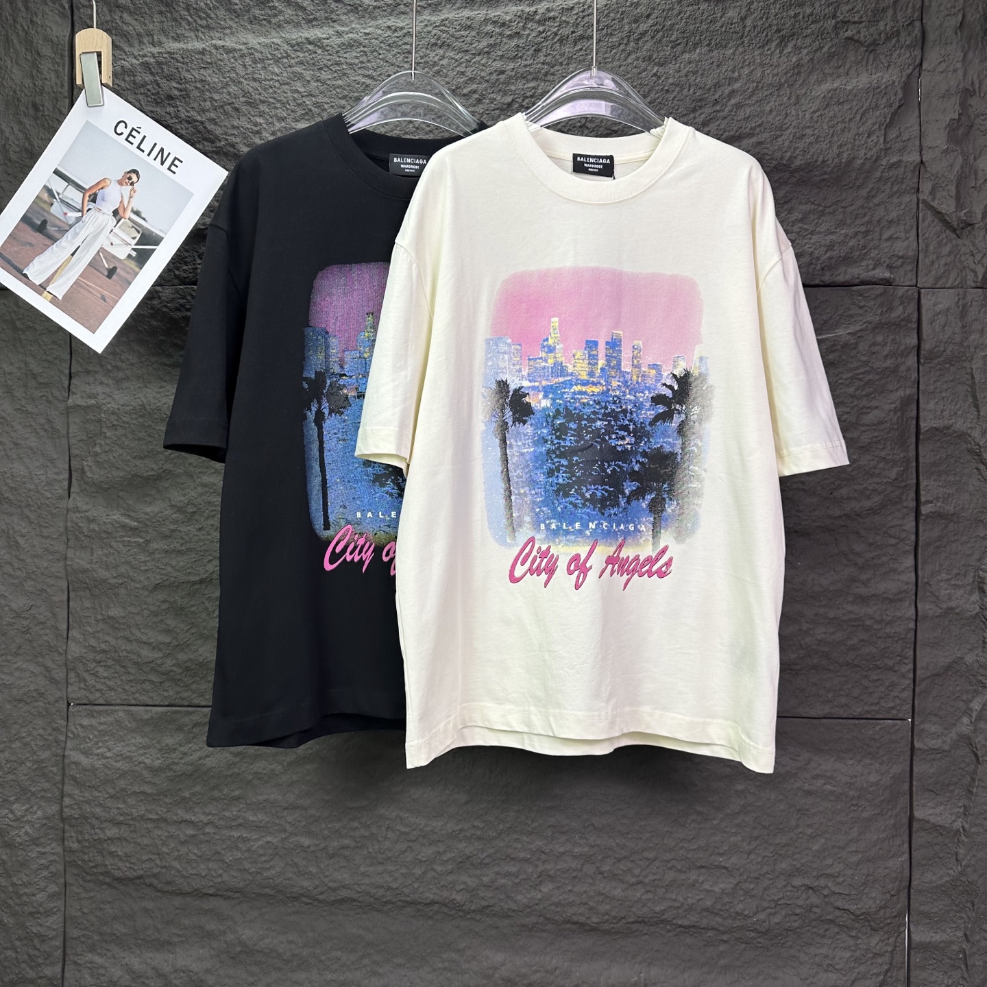 このバレンシアガ Tシャツは、フロント全面に広がるロサンゼルスの夜景プリントが圧巻で、夕暮れのようなピンクから深いブルーへのグラデーション空に高層ビル群が輝き、ヤシの木のシルエットが南カリフォルニアの開放感をそのまま表現しています。下部に施されたピンクの「City of Angels」文字は手書きのような柔らかいフォントで、全体にノスタルジックで少しレトロな雰囲気を加えています。オフホワイトのボディカラーがプリントの鮮やかさを優しく包み込み、ヴィンテージ加工のような自然な色落ち感がこなれた印象を与えます。オーバーサイズのシルエットは肩を大きく落として着るとルーズで今っぽく、袖のドロップ感と裾の自然な落ち具合がストリートらしい抜け感を演出。素材は軽やかで柔らかく、通気性が高いため汗ばむ夏の日でも快適に過ごせ、首元のリブも適度な伸縮性で着脱しやすいです。プリントは多色レイヤーながら色褪せしにくく、耐久性も十分。デニムショーツやワイドパンツと合わせてリゾート風カジュアルに、サンダルやスニーカーで合わせると一気に夏らしいムードに早変わりします。スーパーコピーとして提供していますが、グラデーションのニュアンスやヤシの木の配置、文字の質感まで本物に極めて忠実に再現したアイテムで、着るたびに旅気分を味わえる一枚です。優良サイトから追跡付きで丁寧に梱包・発送いたしますので、安心してお求めください。
