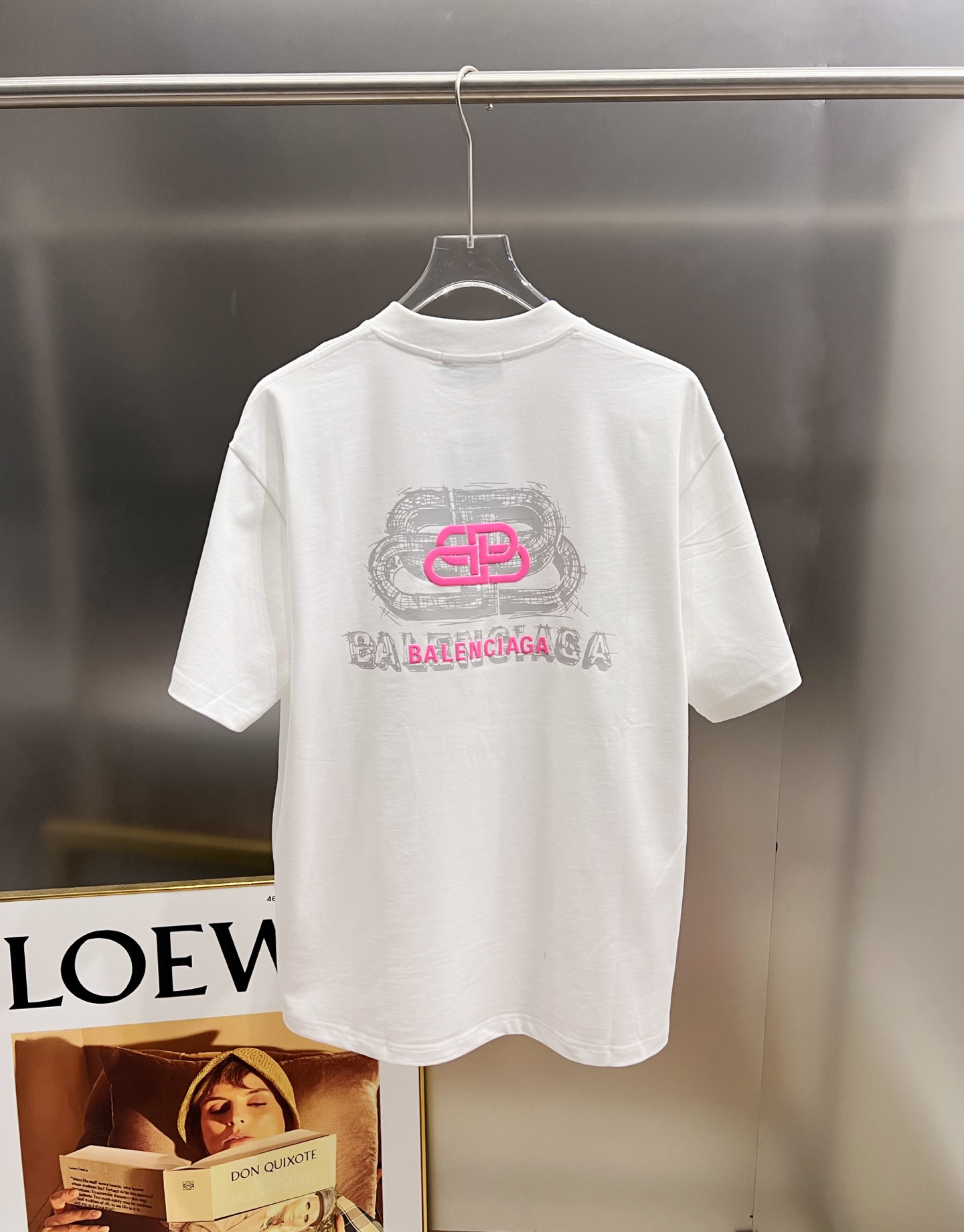 背面に大きく描かれたバレンシアガ(Balenciaga)のピンクBBロゴが印象的なこのTシャツは、爽やかなホワイトのボディに映えるカラーアクセントが魅力です。プリントは掠れ風のタッチを残しつつ立体感も感じられる仕上がりで、スーパーコピーとは思えない細部の再現度を追求。
