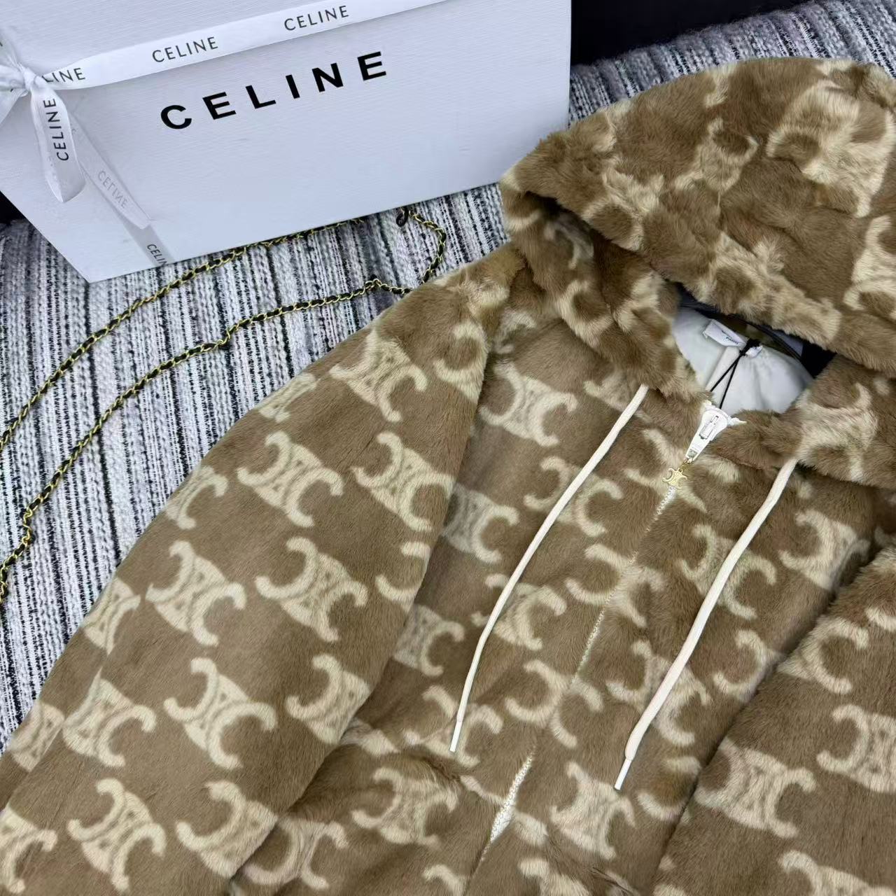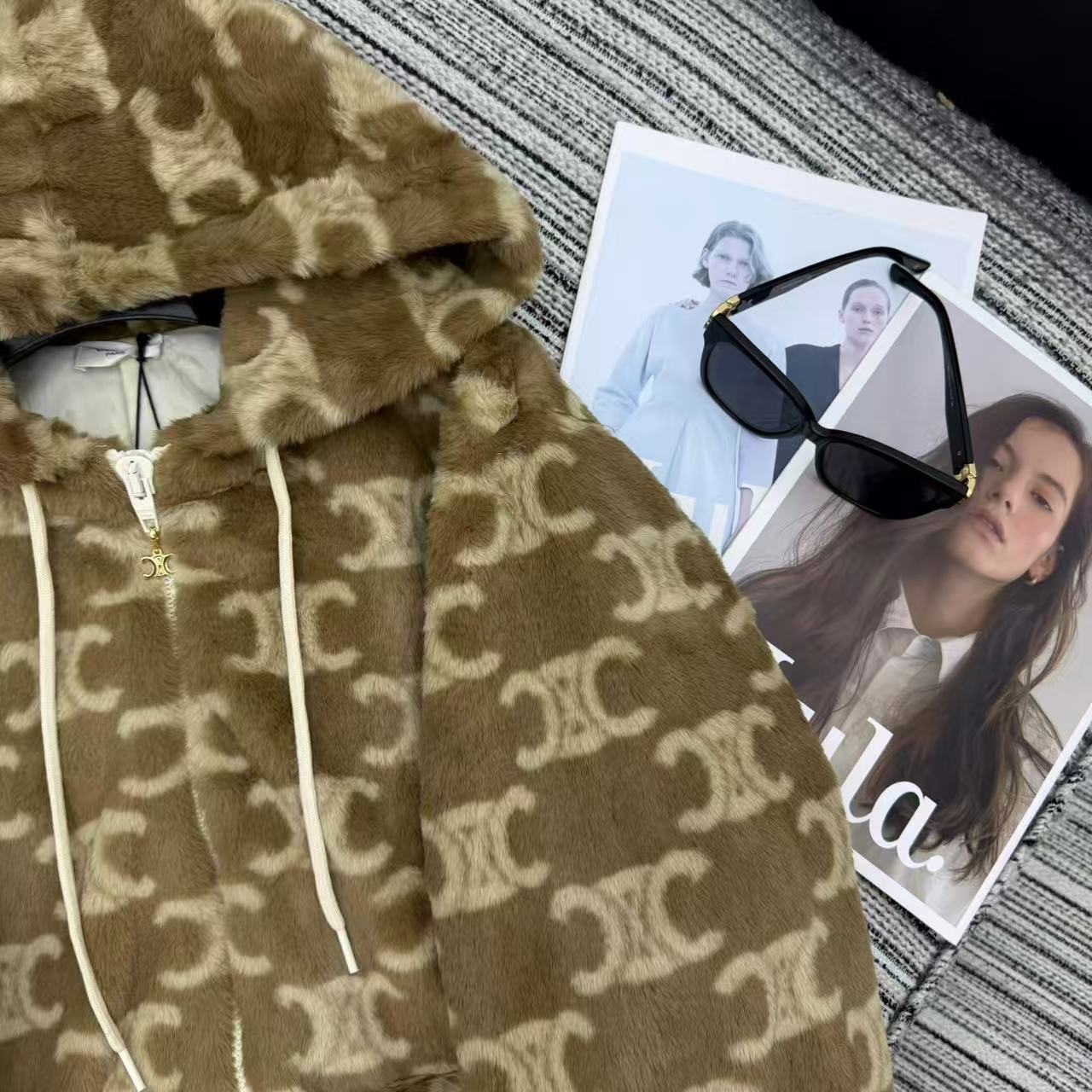 セリーヌ(Celine)のこのトリオンフ総柄ボアジャケットは、その大胆なデザインと上質感あふれる素材使いで、多くのファッションインフルエンサーに支持されている人気モデルです。ブラウンとベージュの落ち着いた配色が、派手になりすぎず洗練された印象を与えます。