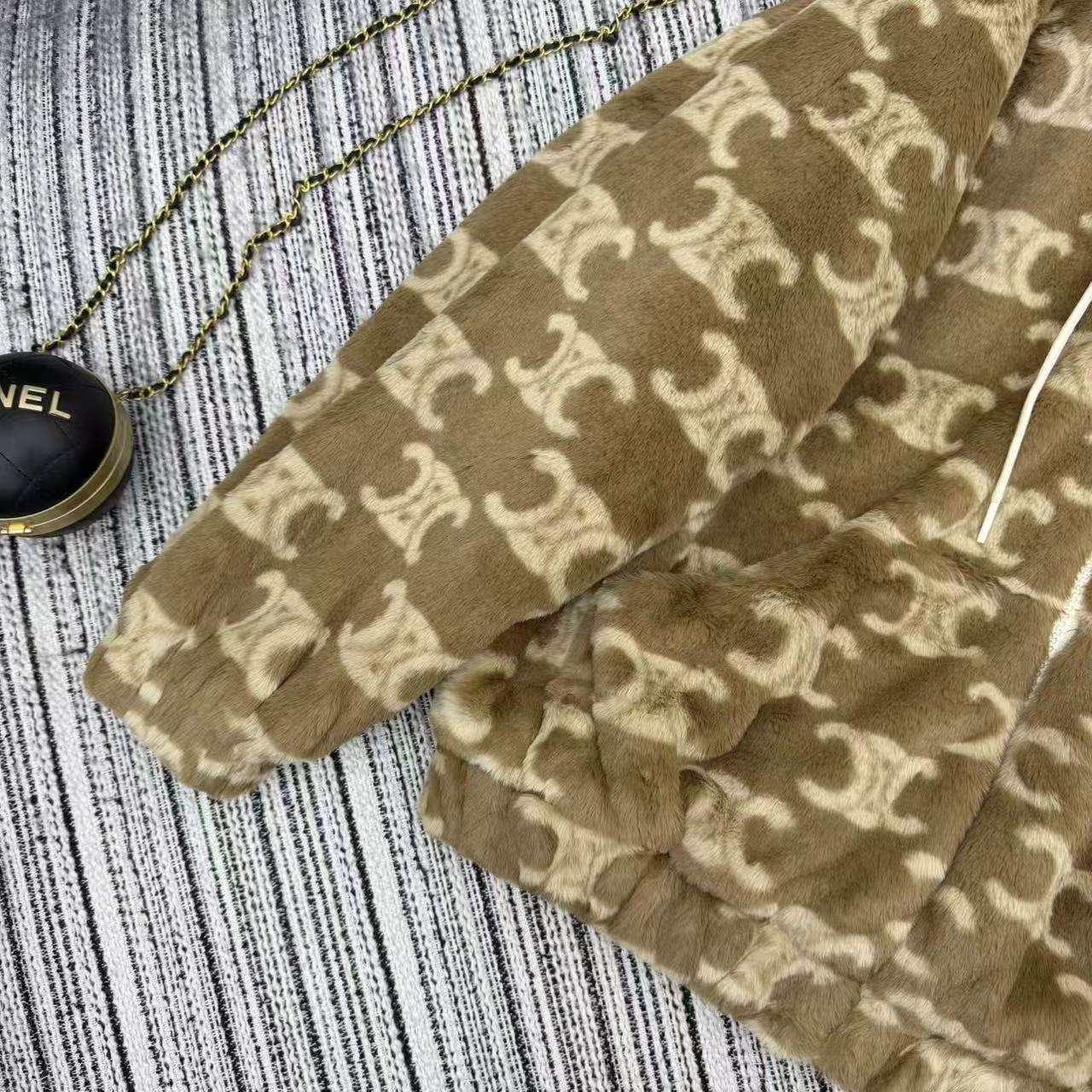 セリーヌ(Celine)のこのトリオンフ総柄ボアジャケットは、その大胆なデザインと上質感あふれる素材使いで、多くのファッションインフルエンサーに支持されている人気モデルです。ブラウンとベージュの落ち着いた配色が、派手になりすぎず洗練された印象を与えます。