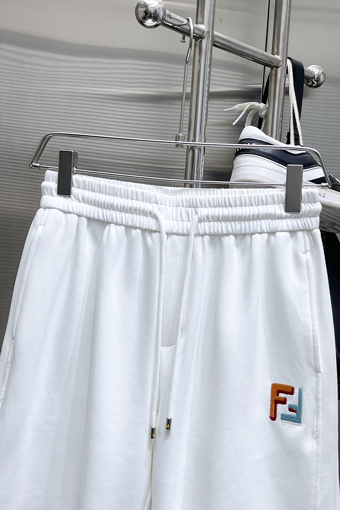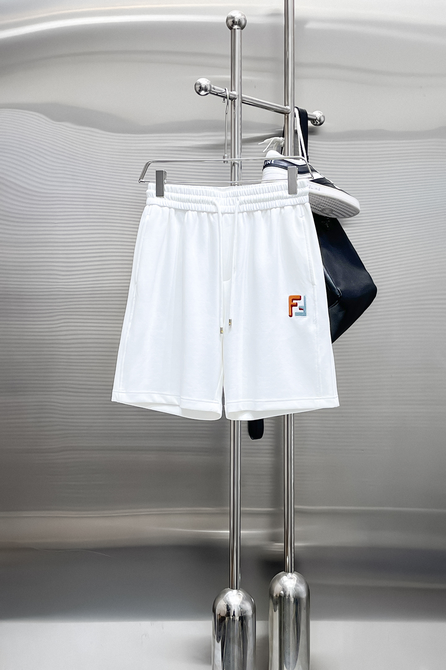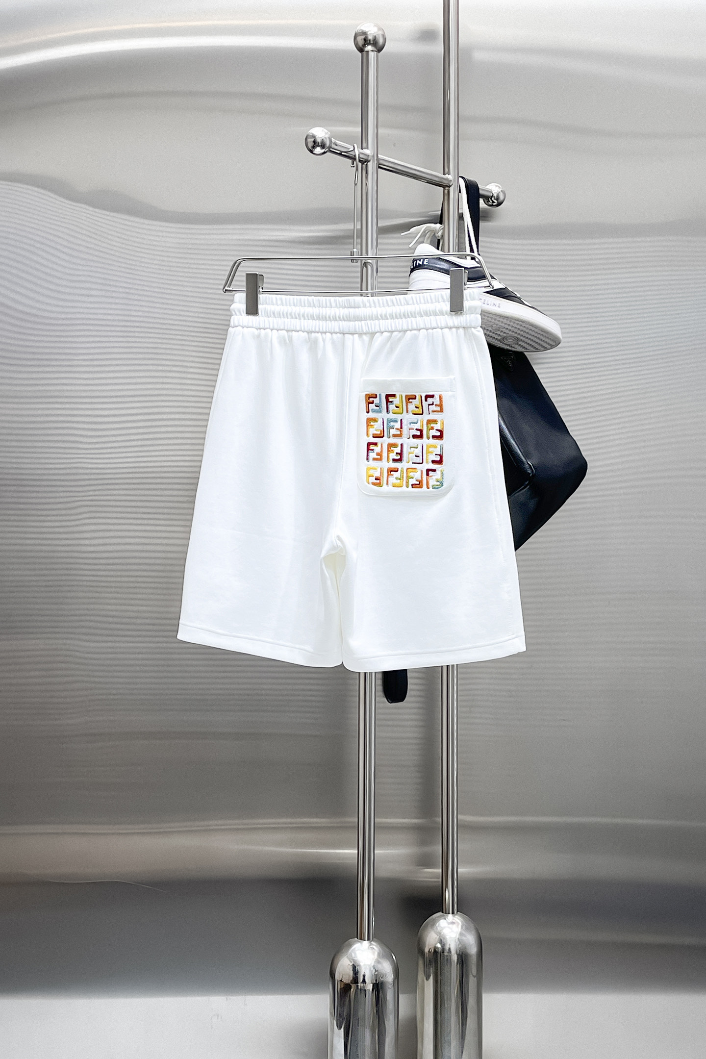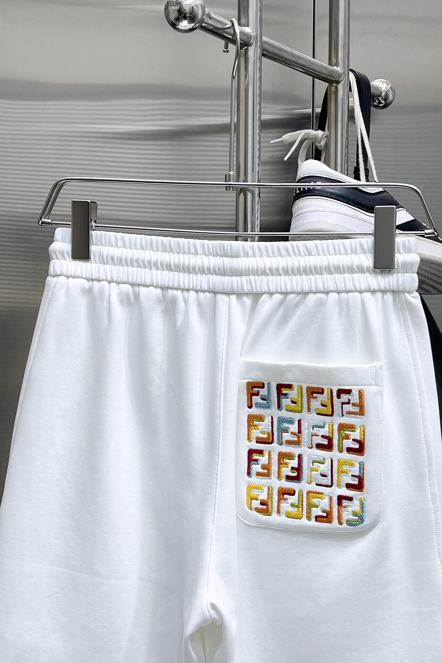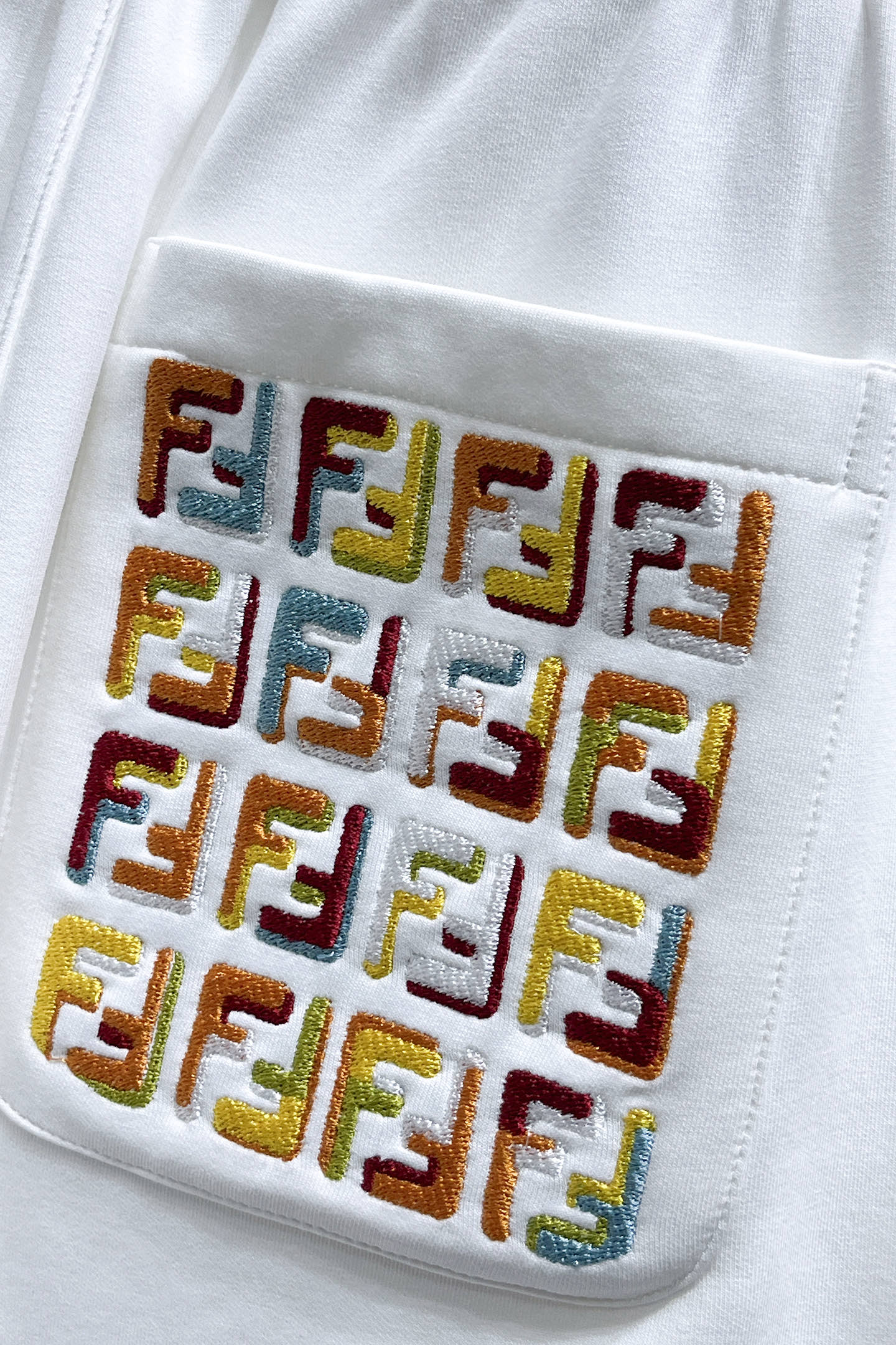 フェンディ(Fendi)の遊び心あるショーツ、見分けがつかないホワイトはポケットのカラフルロゴが最大の魅力です。左側に重ねられた「FENDI」のマルチカラー刺繍がポップに輝き、右ポケットの小さな「FJ」がさりげないアクセント。ウエストのドローコードでフィット感を自由に調整できます。