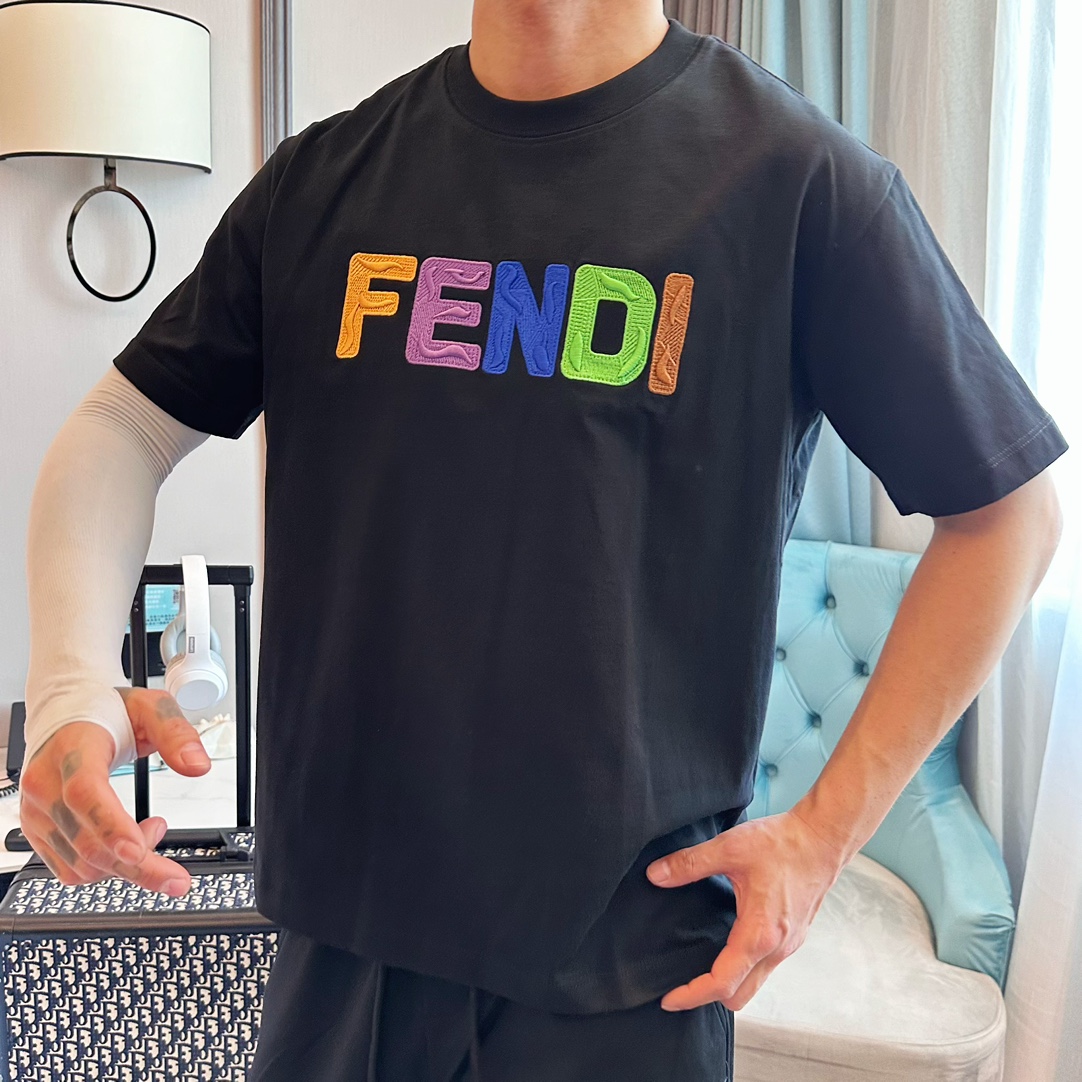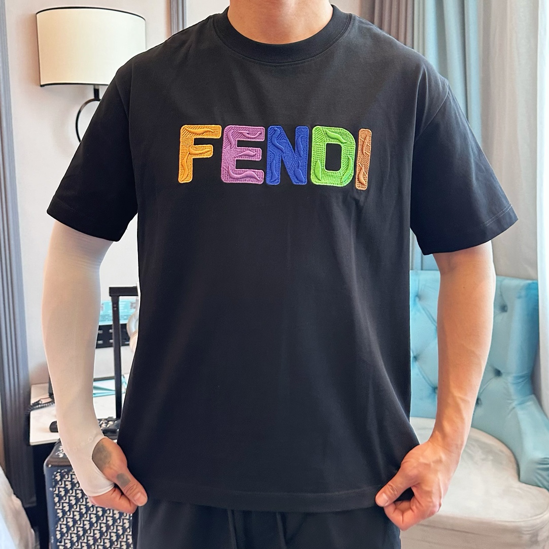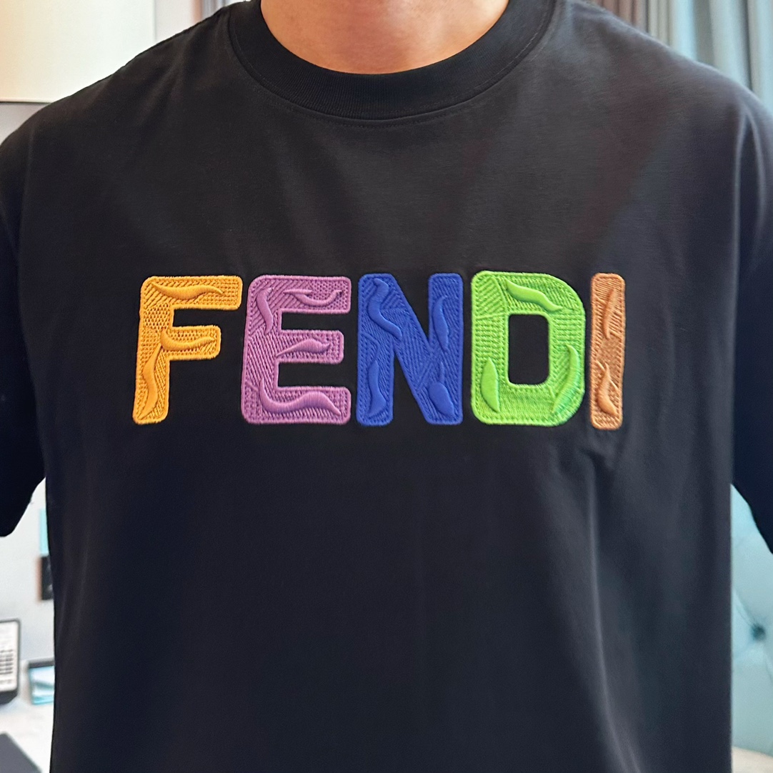 フェンディ(Fendi)のカラフルロゴTシャツ、見分けがつかないブラックはフロントの「FENDI」が虹のように色鮮やかで、ブランドの遊び心を最大限に発揮したデザインです。各文字に異なるカラーとテクスチャーを施した刺繍風プリントが、遠くからでも目を引くインパクトを与えます。