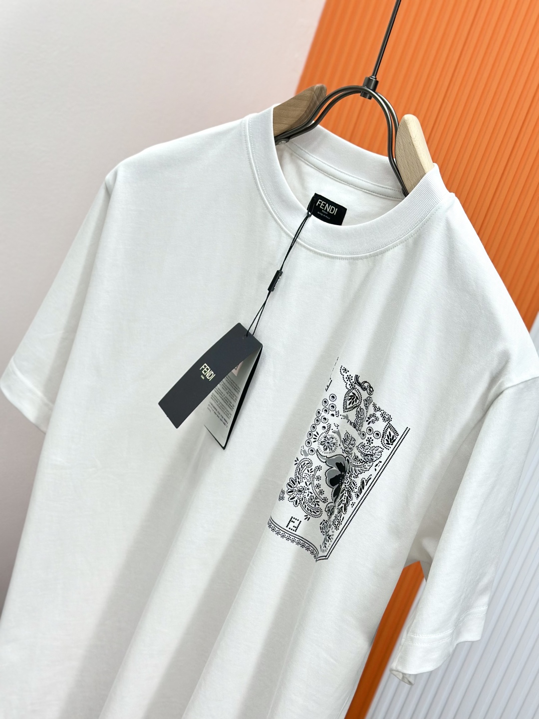 フェンディ(FENDI)のn級コピー Tシャツは、クリーンなホワイトベースに繊細なポケット柄プリントを配置し、シンプルながら印象に残るデザイン。軽やかなコットン地は通気性に優れ、汗ばむ季節もさらりと快適です。適度なゆとりのあるシルエットで単体でもレイヤードでもバランスよく決まり、デニムやショーツと合わせるだけで上品なカジュアルが完成。プリントの線画表現やタグまわりの仕立ても丁寧で、日常のワードローブに取り入れやすい一枚です。
