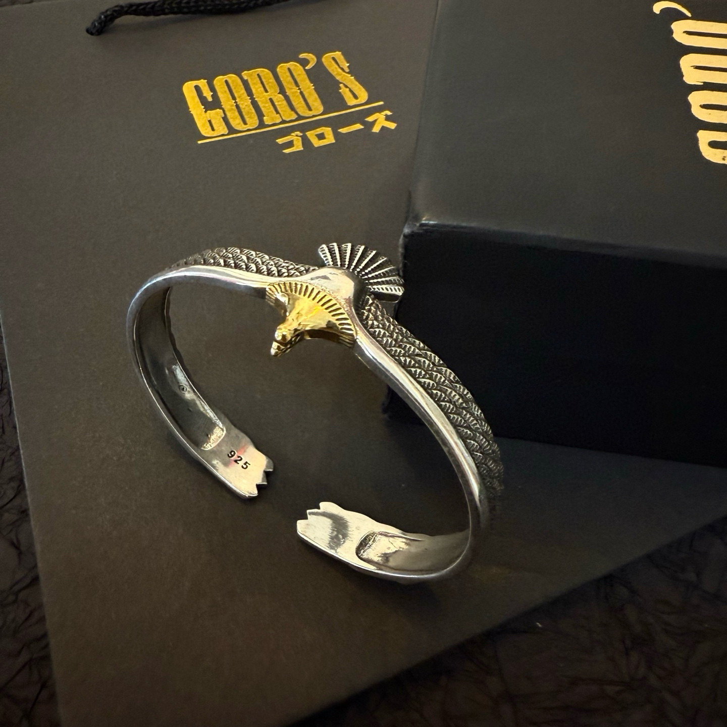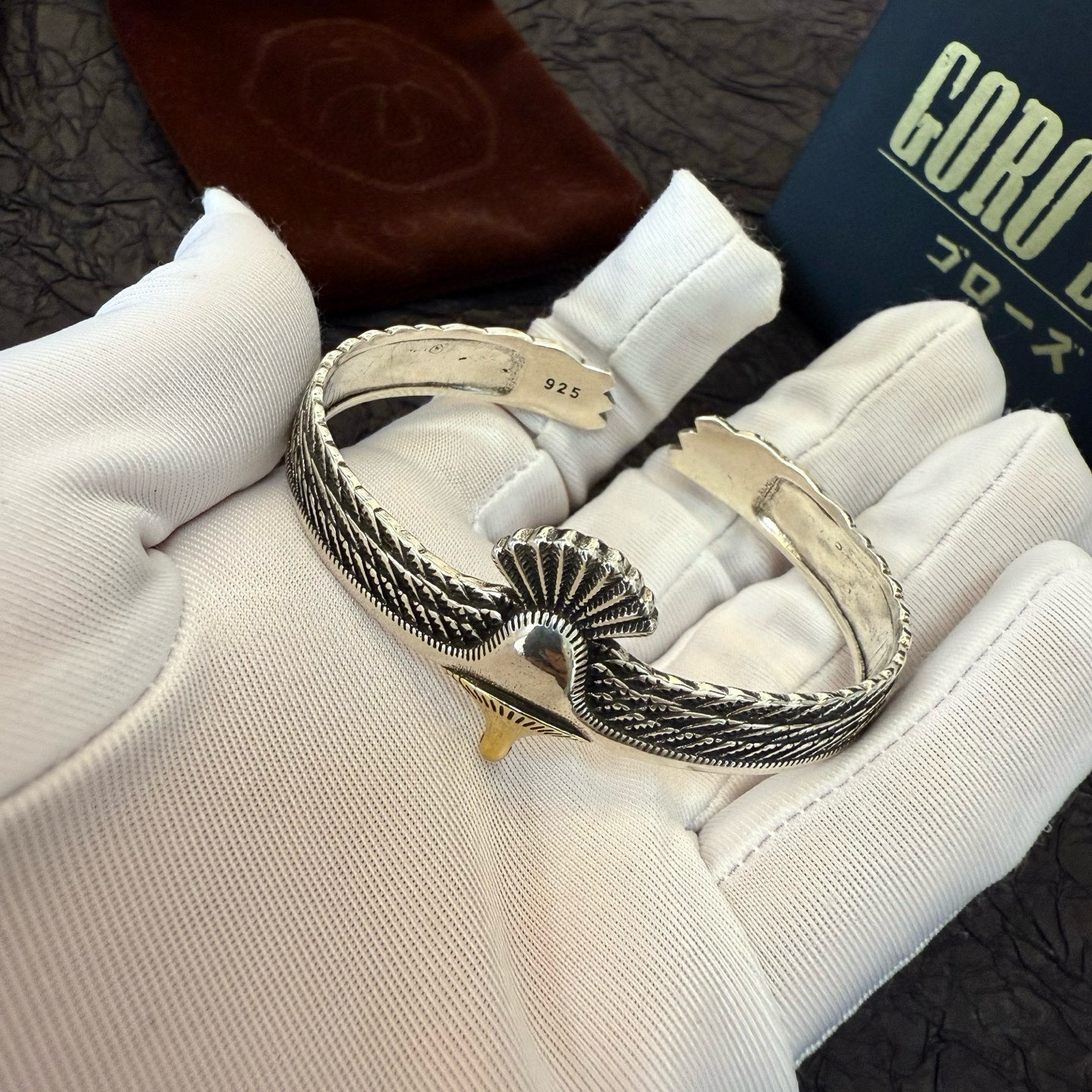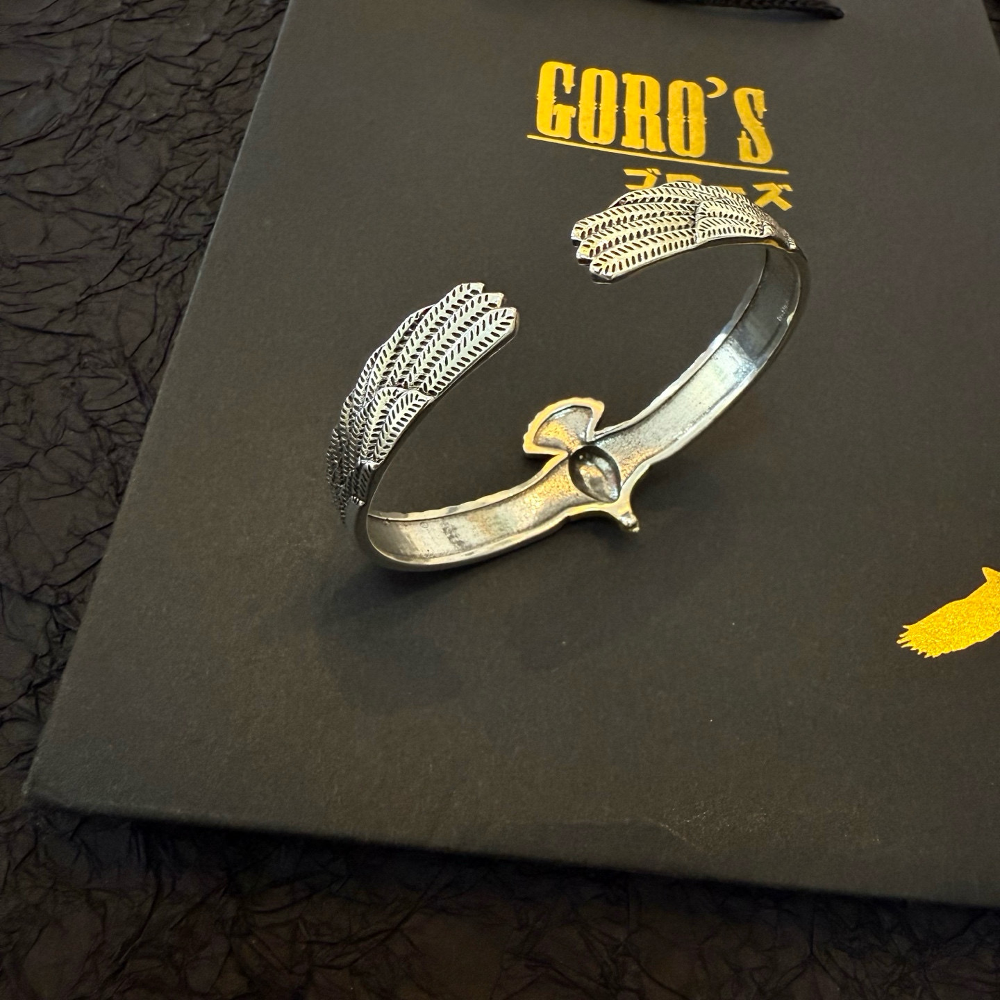 ゴローズ(Goro’s)の芸能人偽物 イーグルウィングバングルは、両翼を広げたようなダイナミックなフォルムと繊細な彫刻が印象的。立体的に彫り込まれた羽のラインが光を受けて陰影を生み、手首に高級感を演出します。中央には鷲の頭を模した装飾があり、力強さと優雅さを融合した仕上がり。芸能人偽物 モデルながらディテールの完成度が非常に高く、存在感のあるアクセサリーとしてファッション愛好家にも人気。着用するだけでスタイル全体を格上げする逸品です。