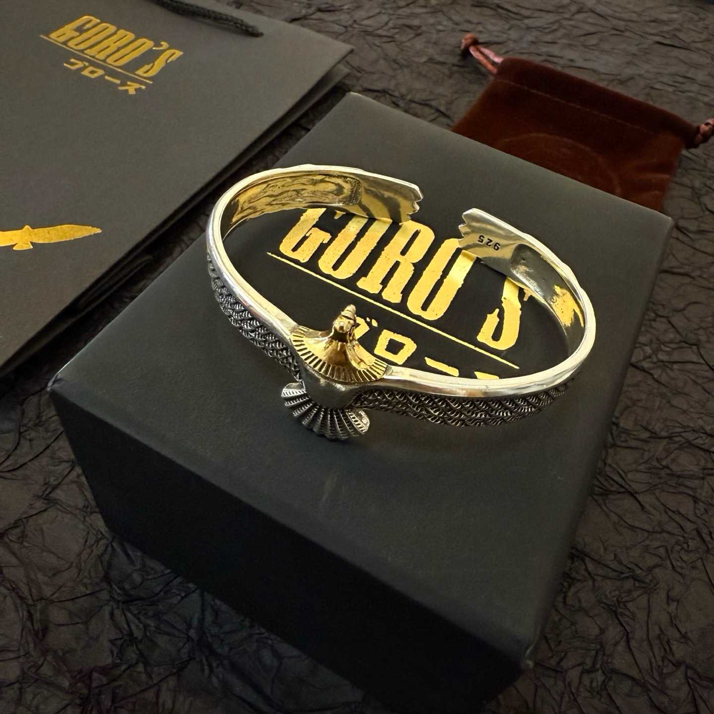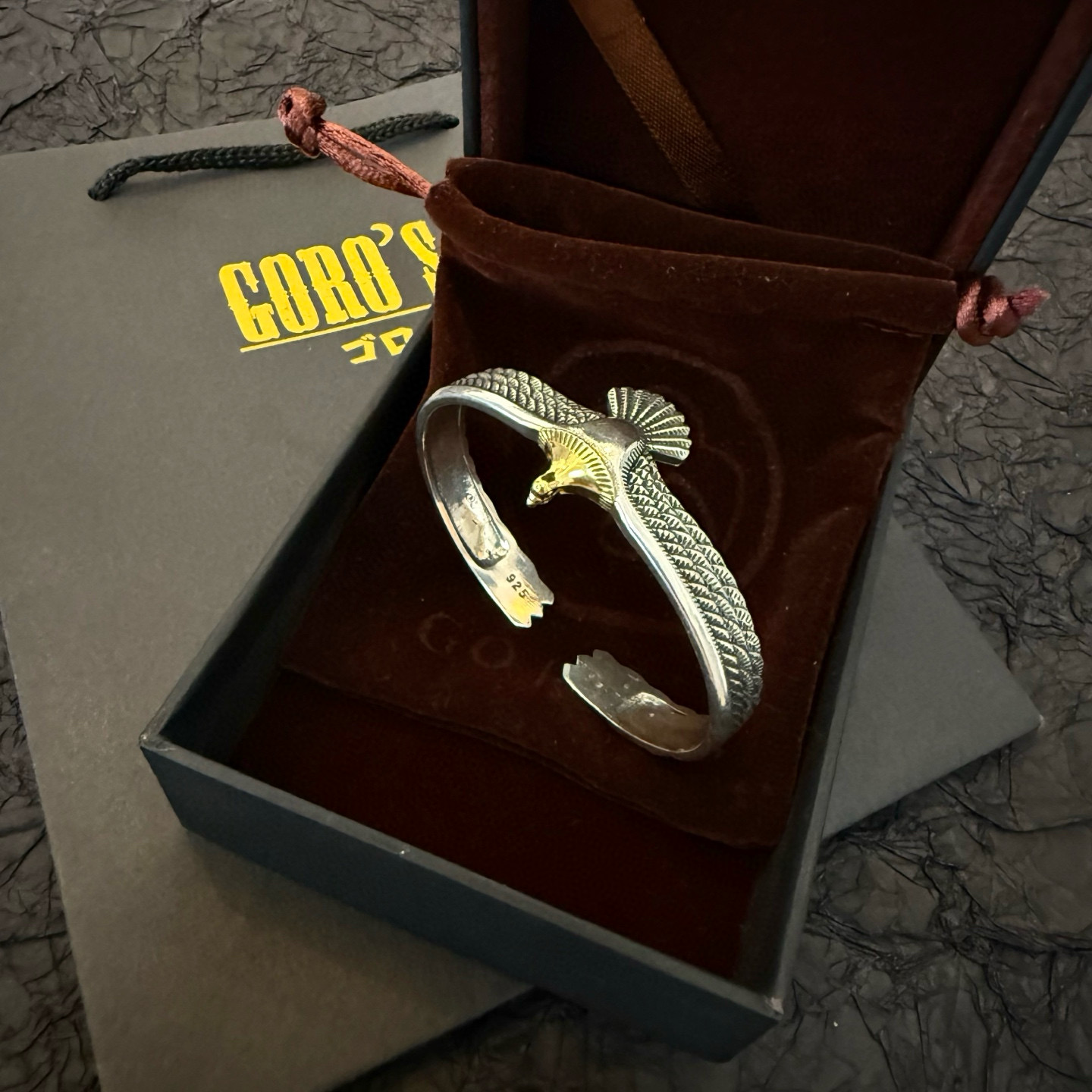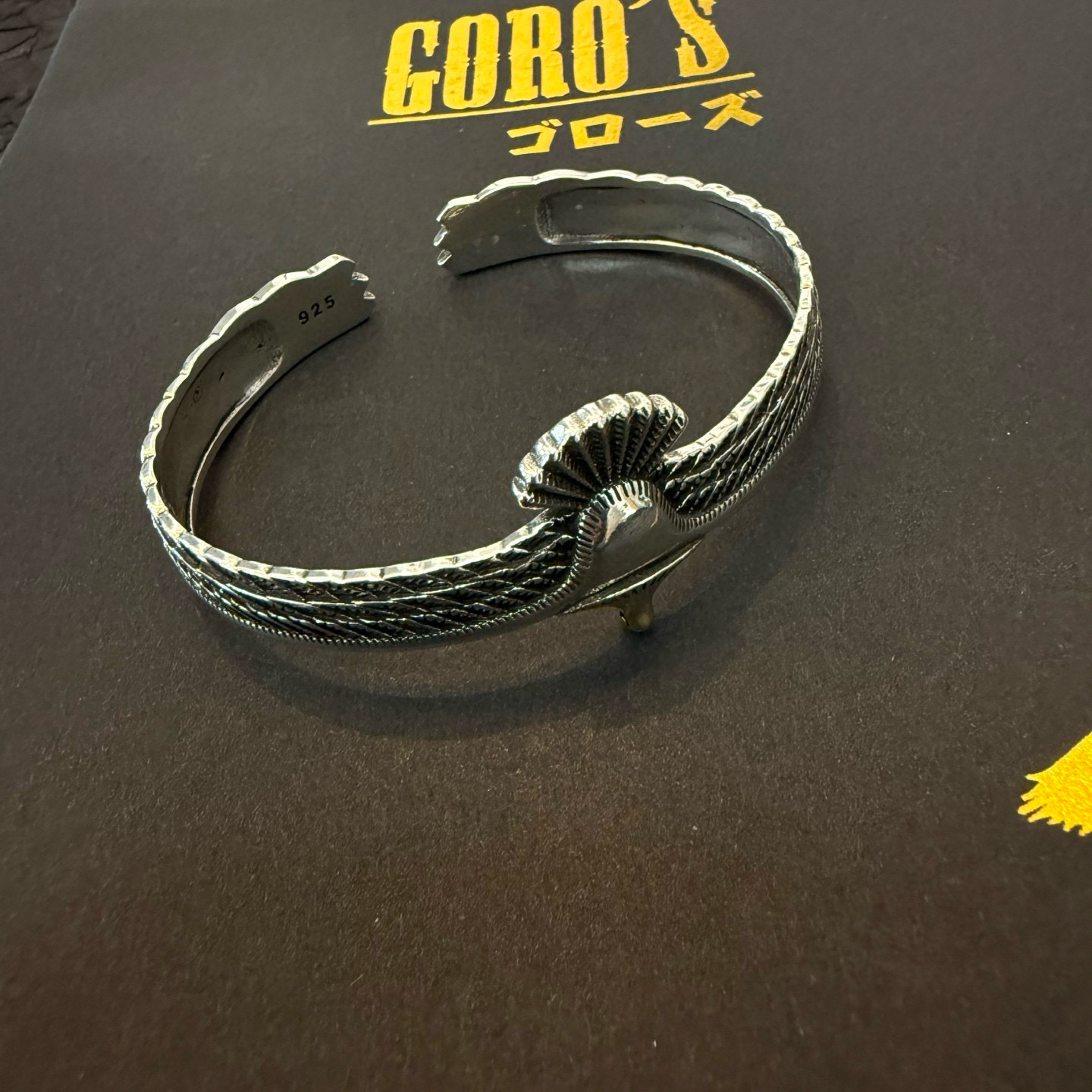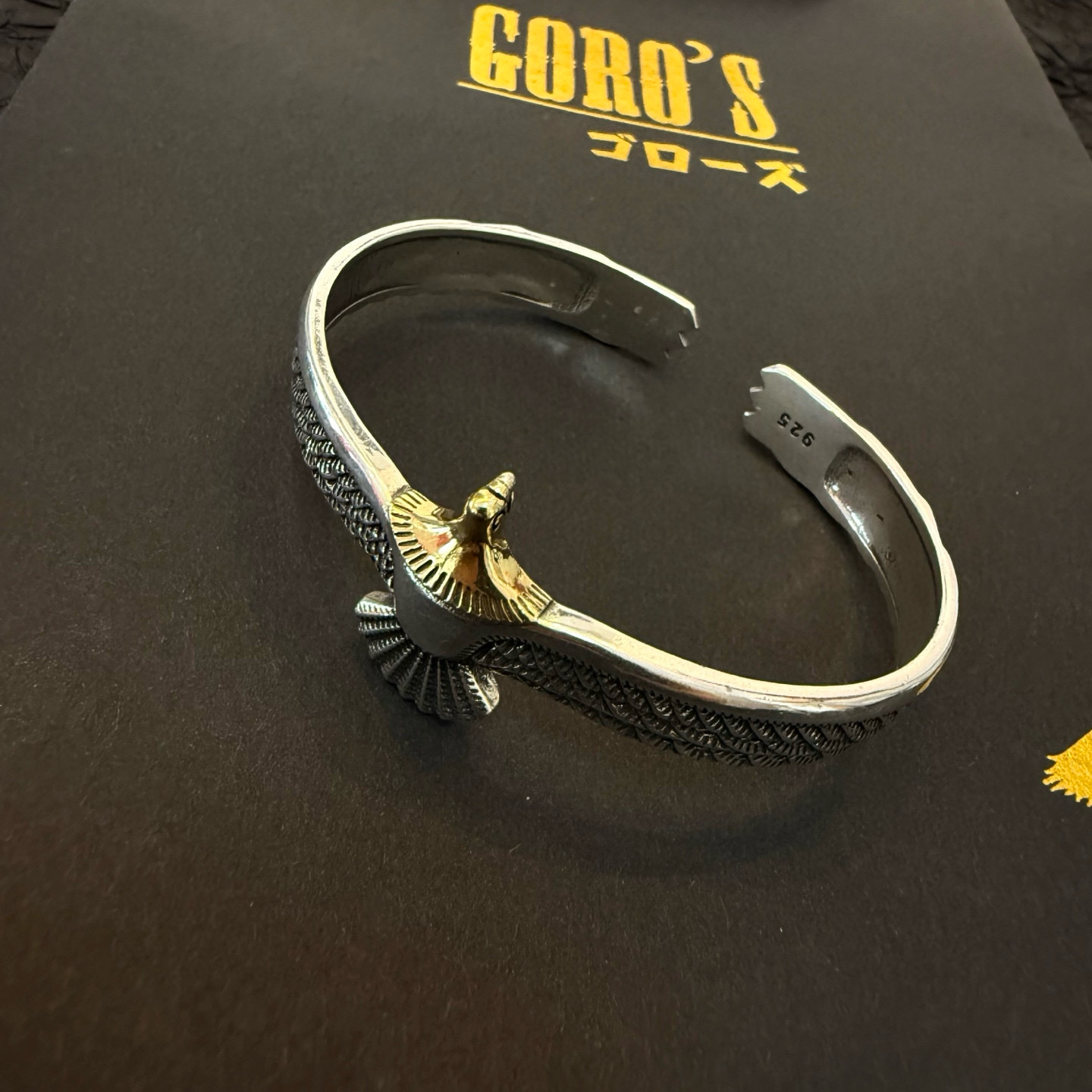 ゴローズ(Goro’s)の芸能人偽物 イーグルウィングバングルは、両翼を広げたようなダイナミックなフォルムと繊細な彫刻が印象的。立体的に彫り込まれた羽のラインが光を受けて陰影を生み、手首に高級感を演出します。中央には鷲の頭を模した装飾があり、力強さと優雅さを融合した仕上がり。芸能人偽物 モデルながらディテールの完成度が非常に高く、存在感のあるアクセサリーとしてファッション愛好家にも人気。着用するだけでスタイル全体を格上げする逸品です。