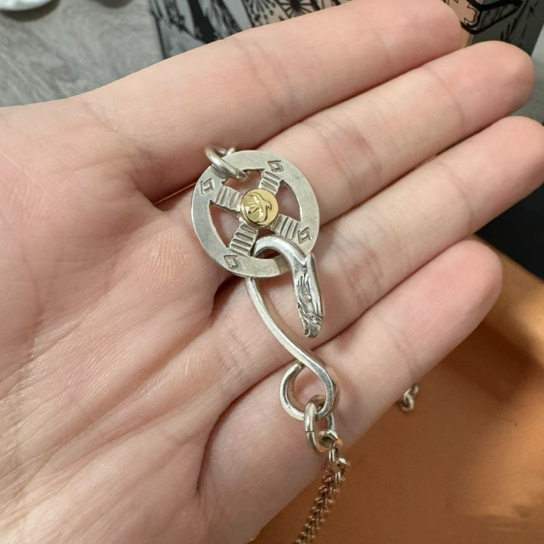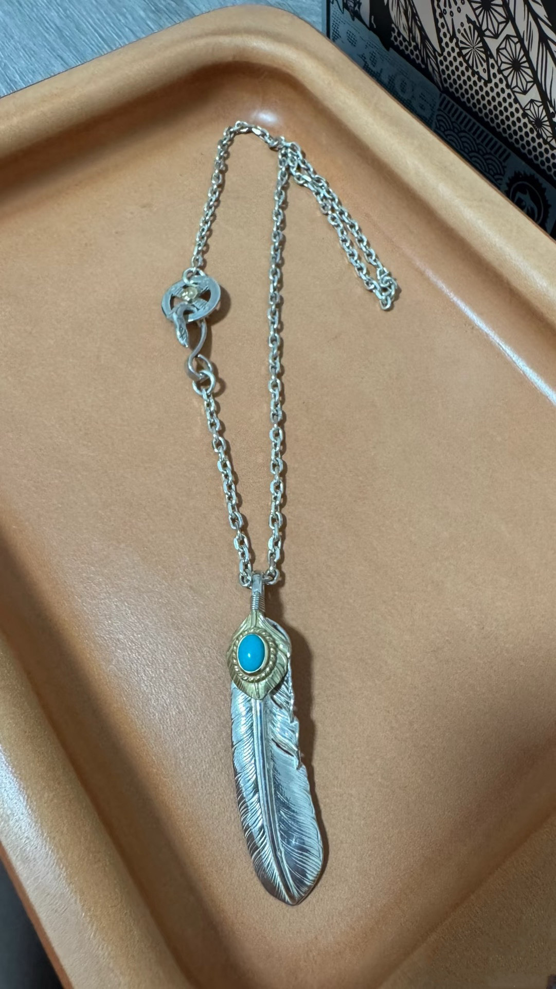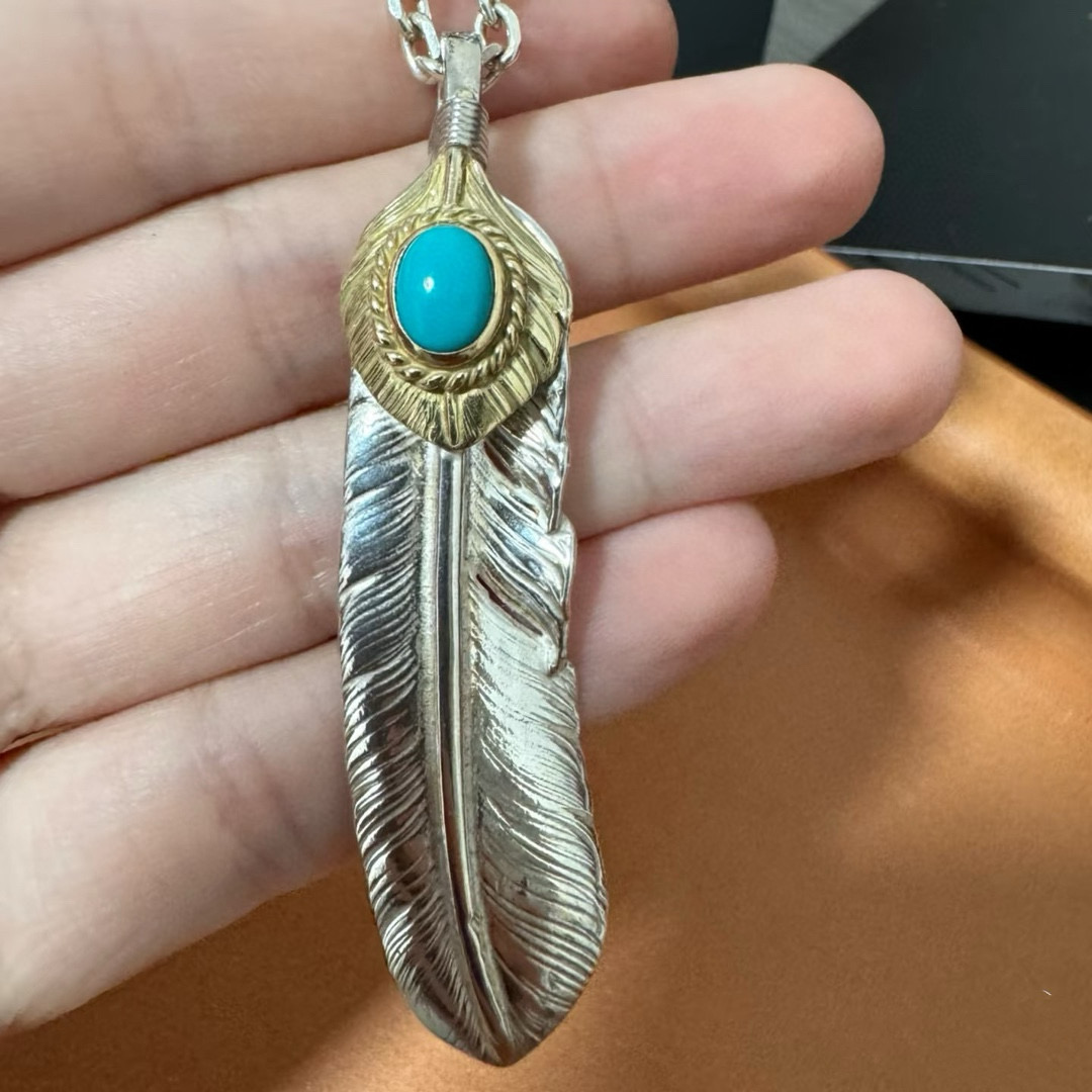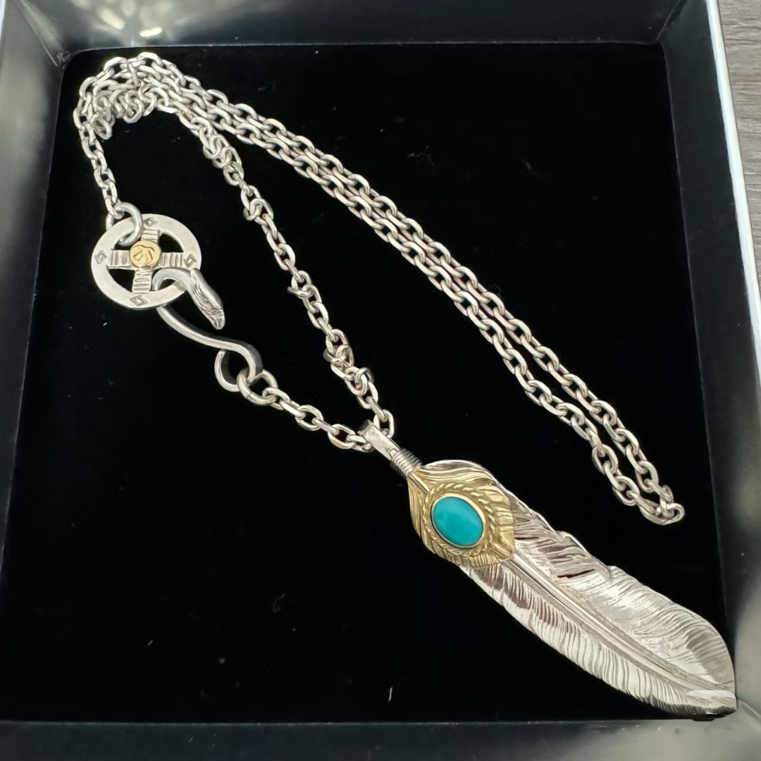 ゴローズ(Goro’s)の激安通販 ターコイズフェザーネックレスは、天然石ターコイズのブルーが映える美しいデザイン。羽根の繊細な彫刻と中央に配されたストーンが見事に調和し、ブランドらしいスピリットを表現しています。シルバー925の重厚感と柔らかな光沢が首元を上品に演出。激安通販 モデルながら、チェーンやフェザーの曲線まで細部を再現し、完成度の高い仕上がりに。カジュアルにもフォーマルにも使える万能アクセサリーです。