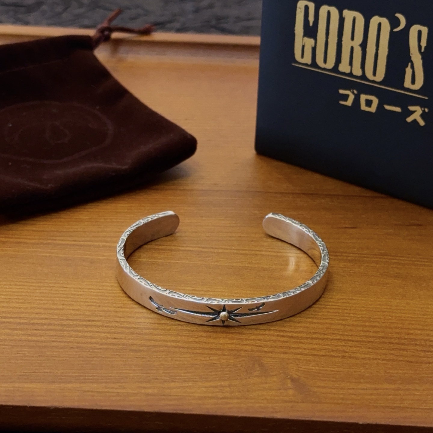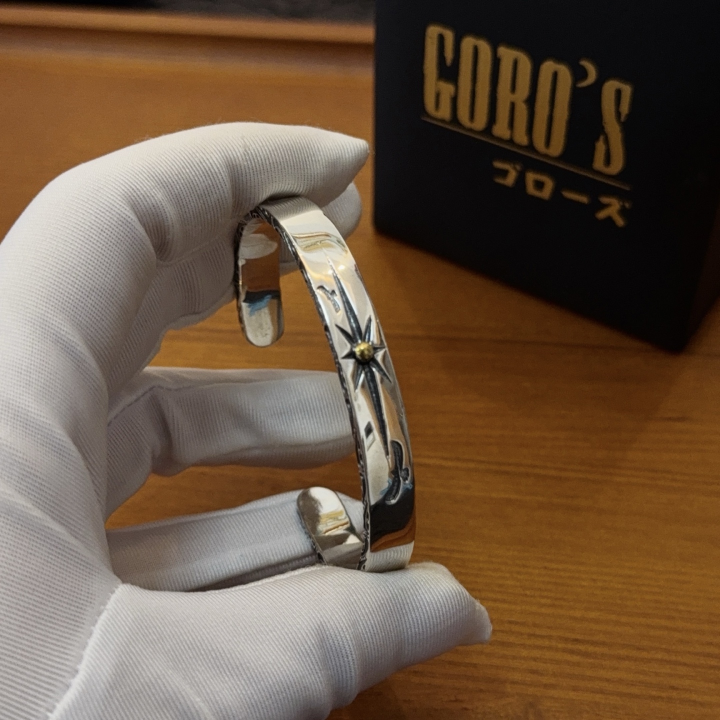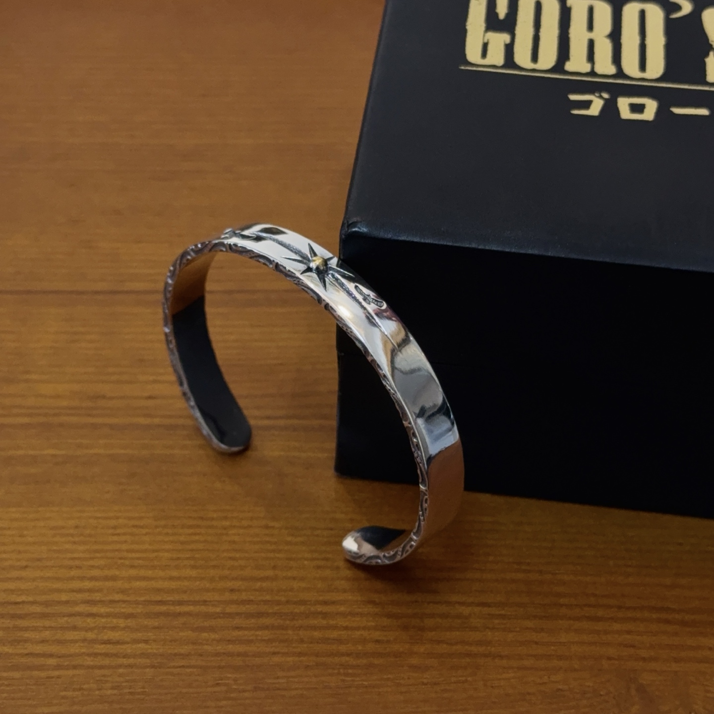 シンプルな平打ちデザインに星モチーフを組み合わせたバングルは、ゴローズの中でも人気の高い定番スタイルです。見分けがつかないレベルを意識し、表面の磨きや刻印の深さまで細かく調整。細身ながら存在感があり、時計や他のブレスレットとの重ね付けもしやすいのが魅力です。カジュアルから大人のストリートスタイルまで幅広く対応します。