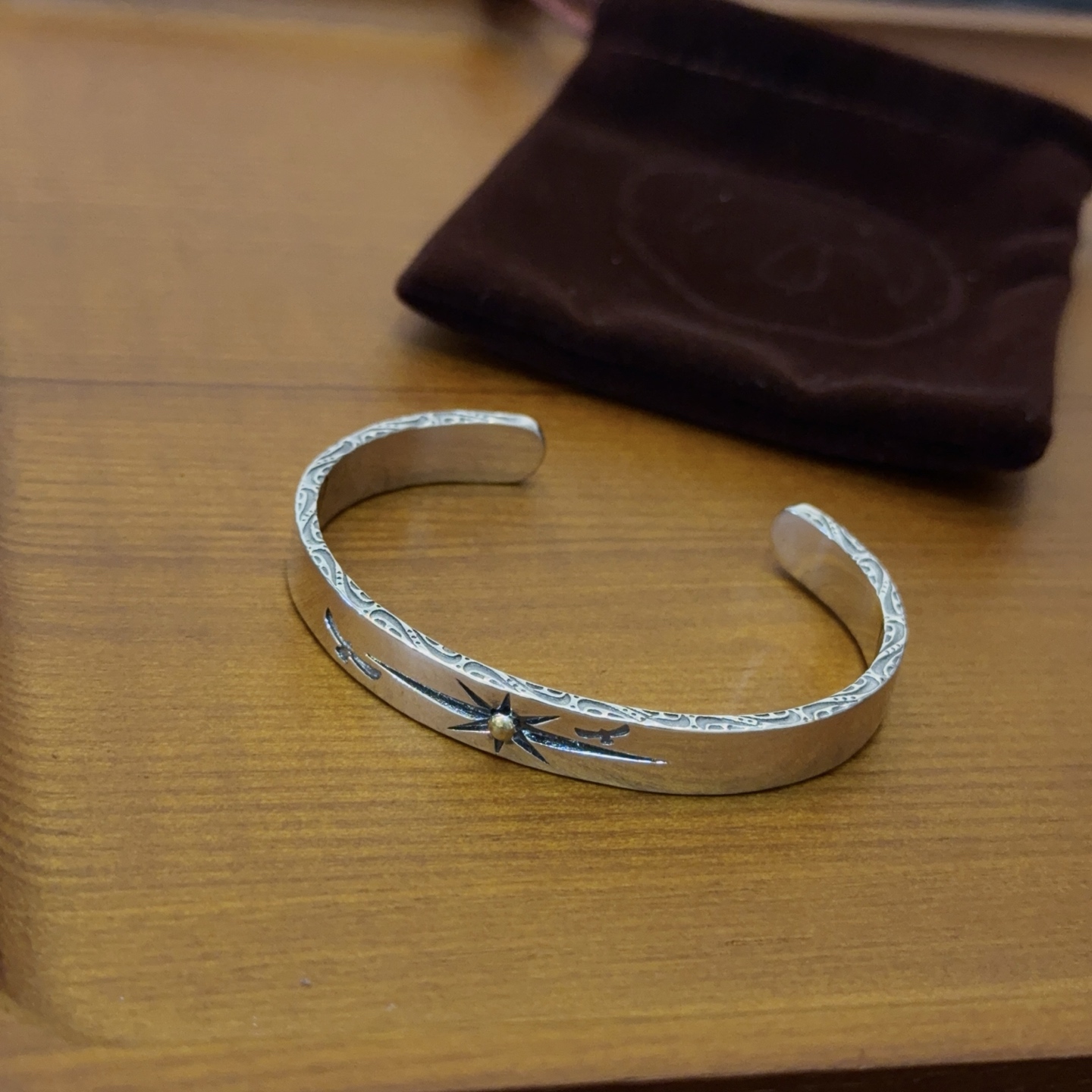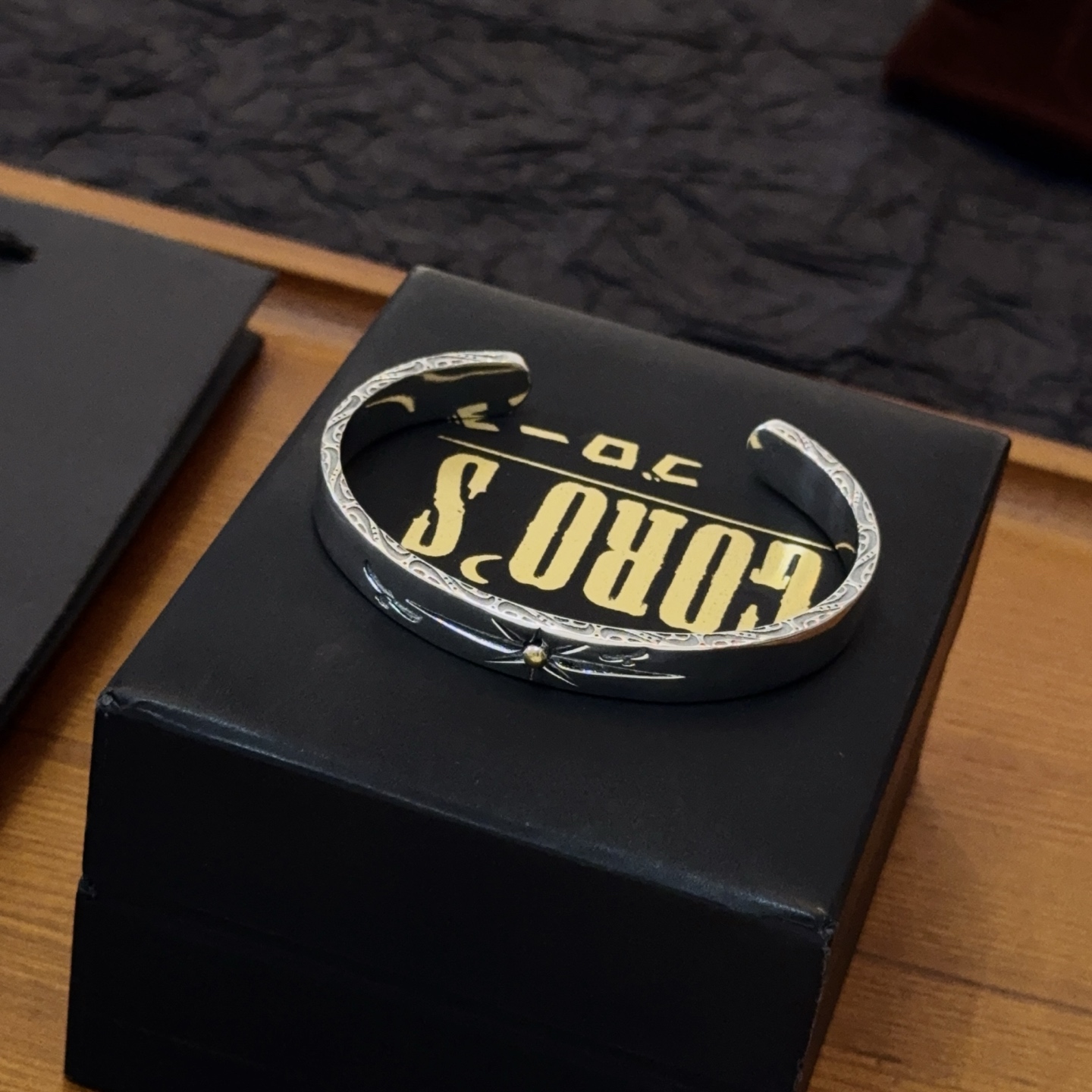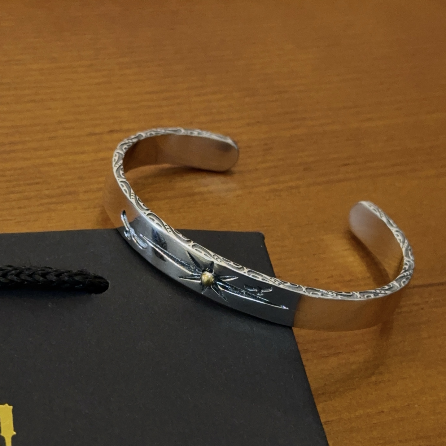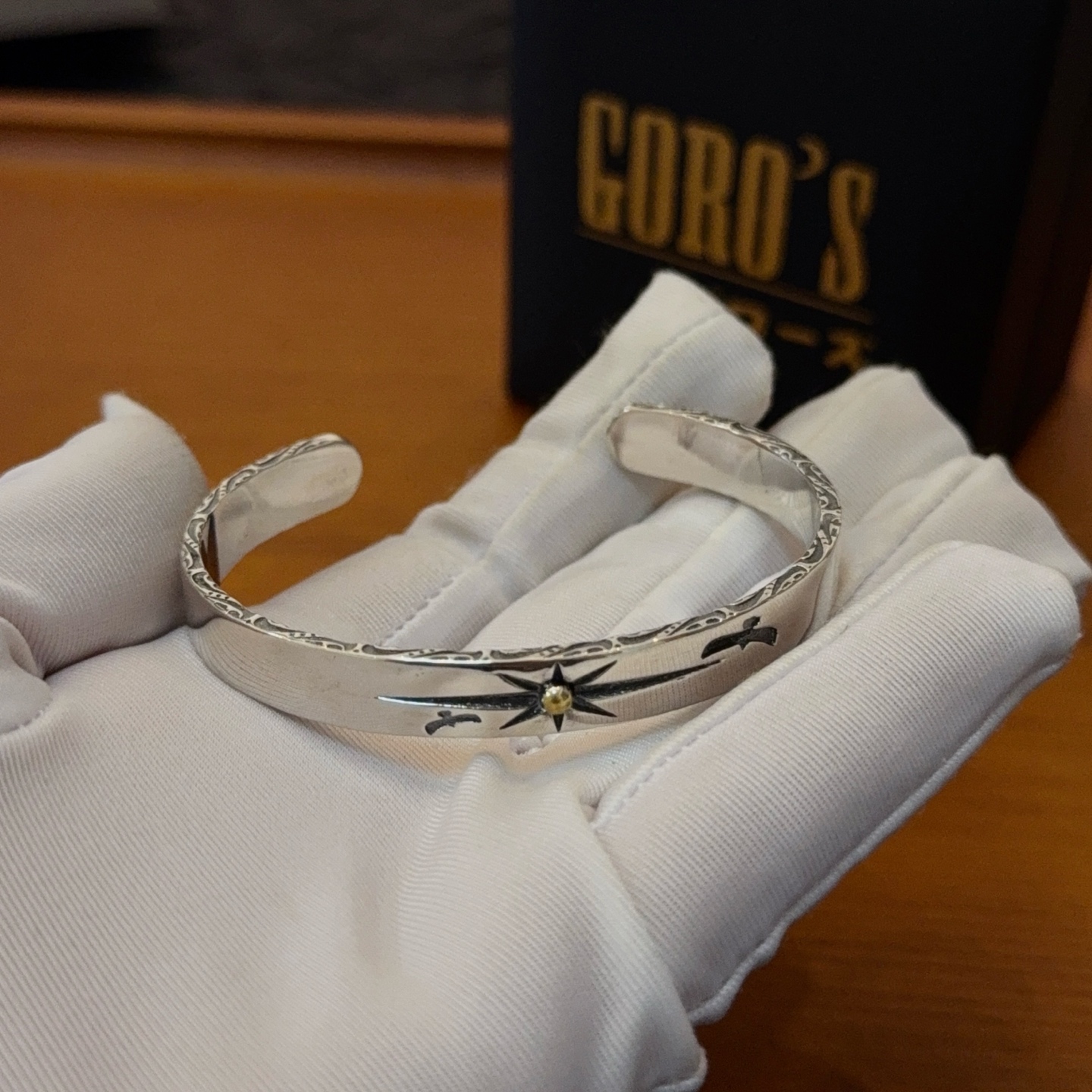 シンプルな平打ちデザインに星モチーフを組み合わせたバングルは、ゴローズの中でも人気の高い定番スタイルです。見分けがつかないレベルを意識し、表面の磨きや刻印の深さまで細かく調整。細身ながら存在感があり、時計や他のブレスレットとの重ね付けもしやすいのが魅力です。カジュアルから大人のストリートスタイルまで幅広く対応します。