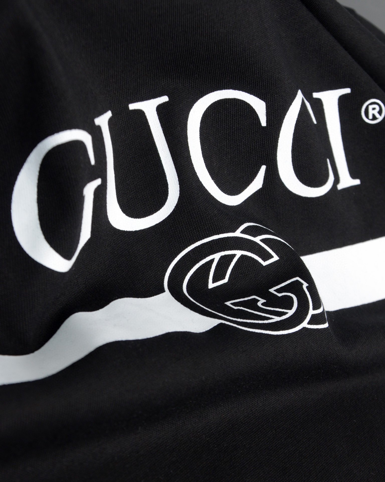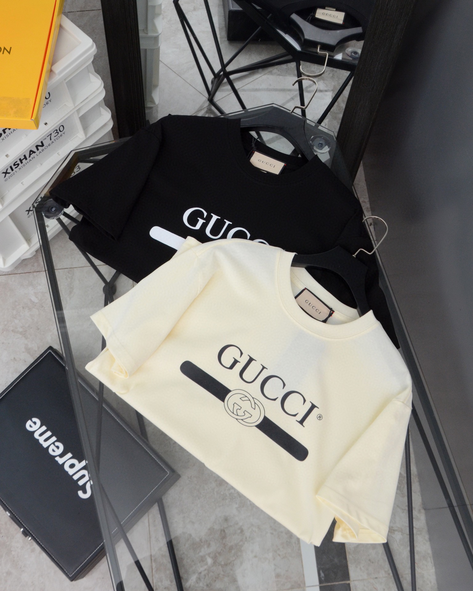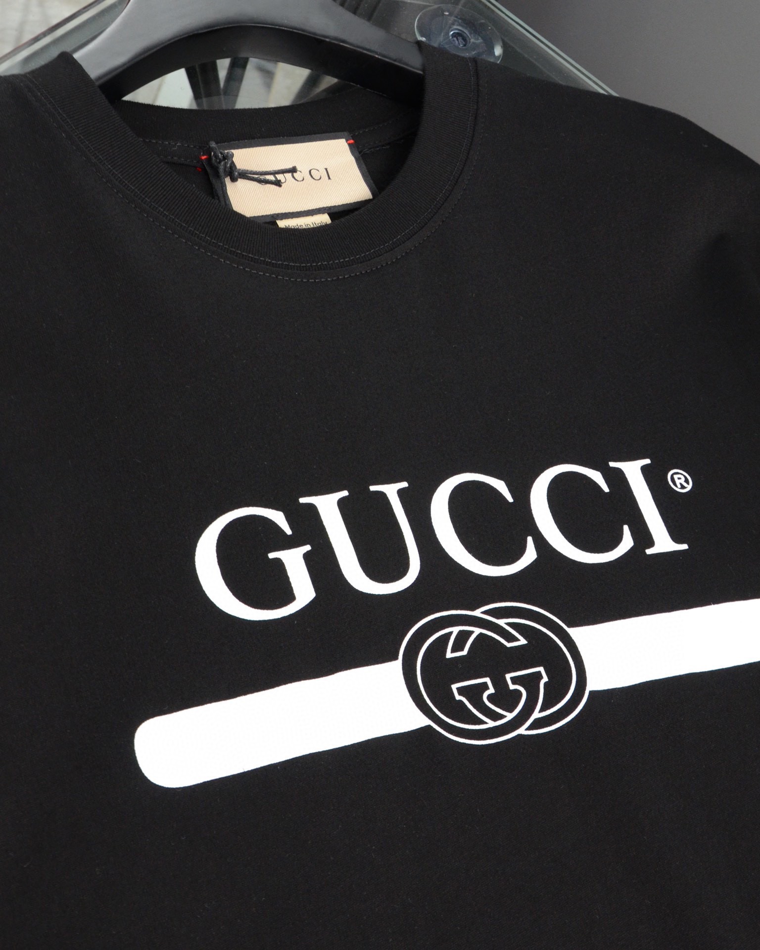 Gucci(グッチ) コピー 芸能人 ベルトロゴダブルgテーププリントラウンドネック半袖Tシャツ