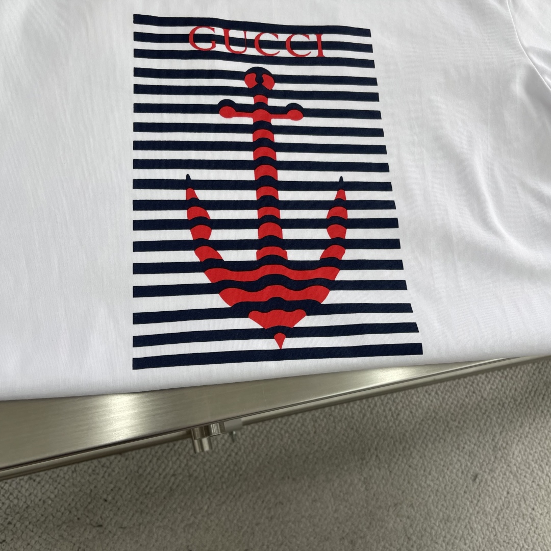 グッチ 偽物 ボーダー柄 アンカーロゴTシャツ ホワイト メンズ 夏服 カジュアル