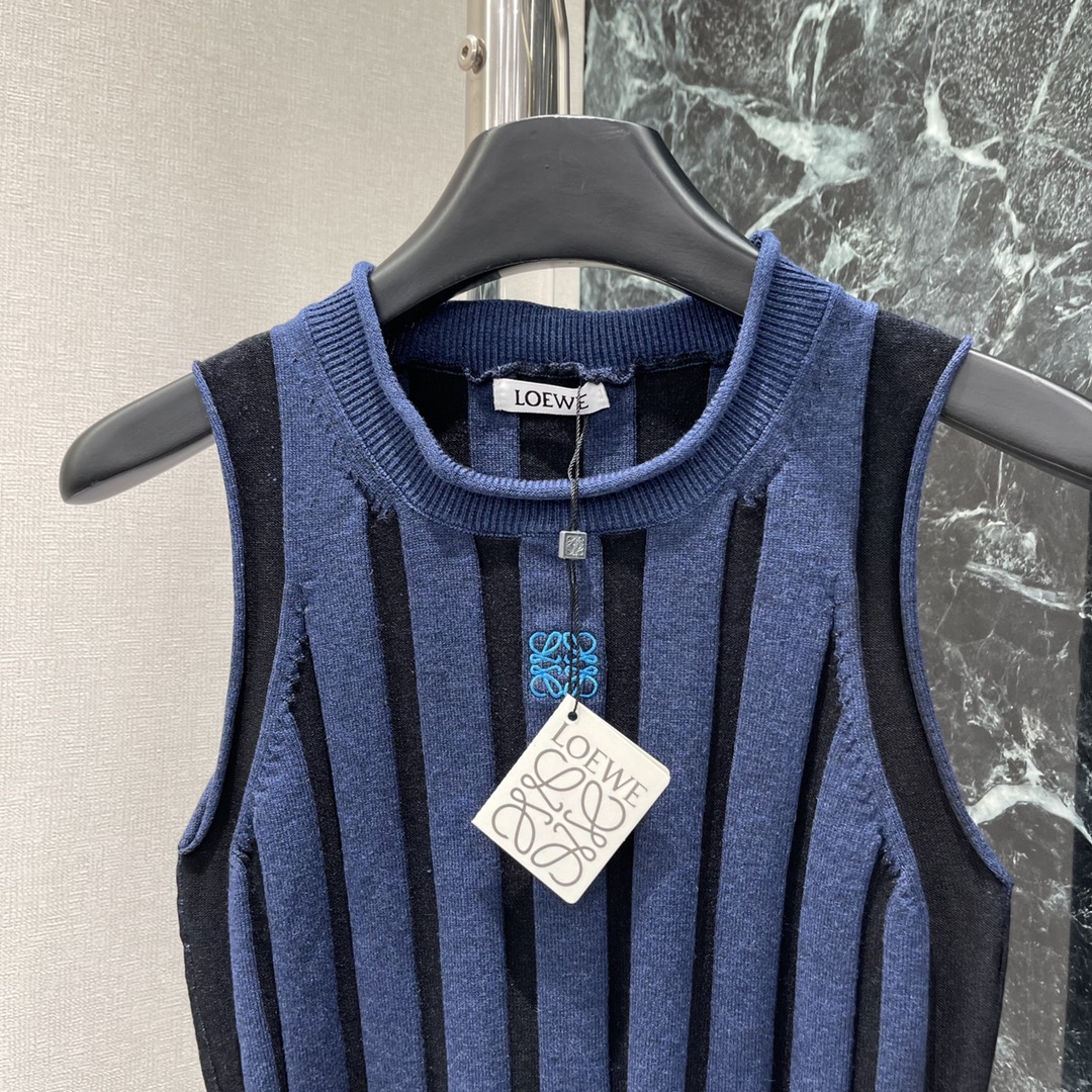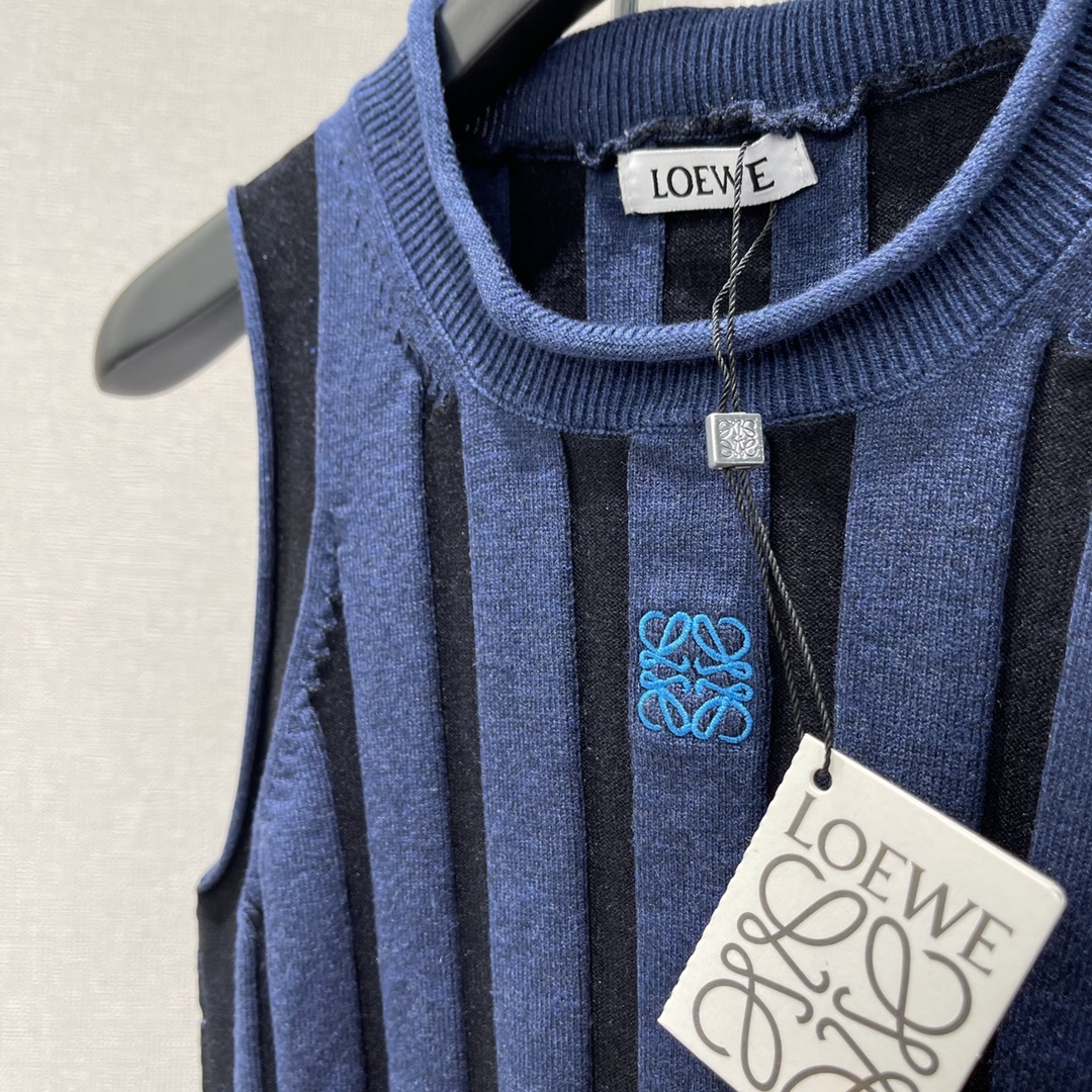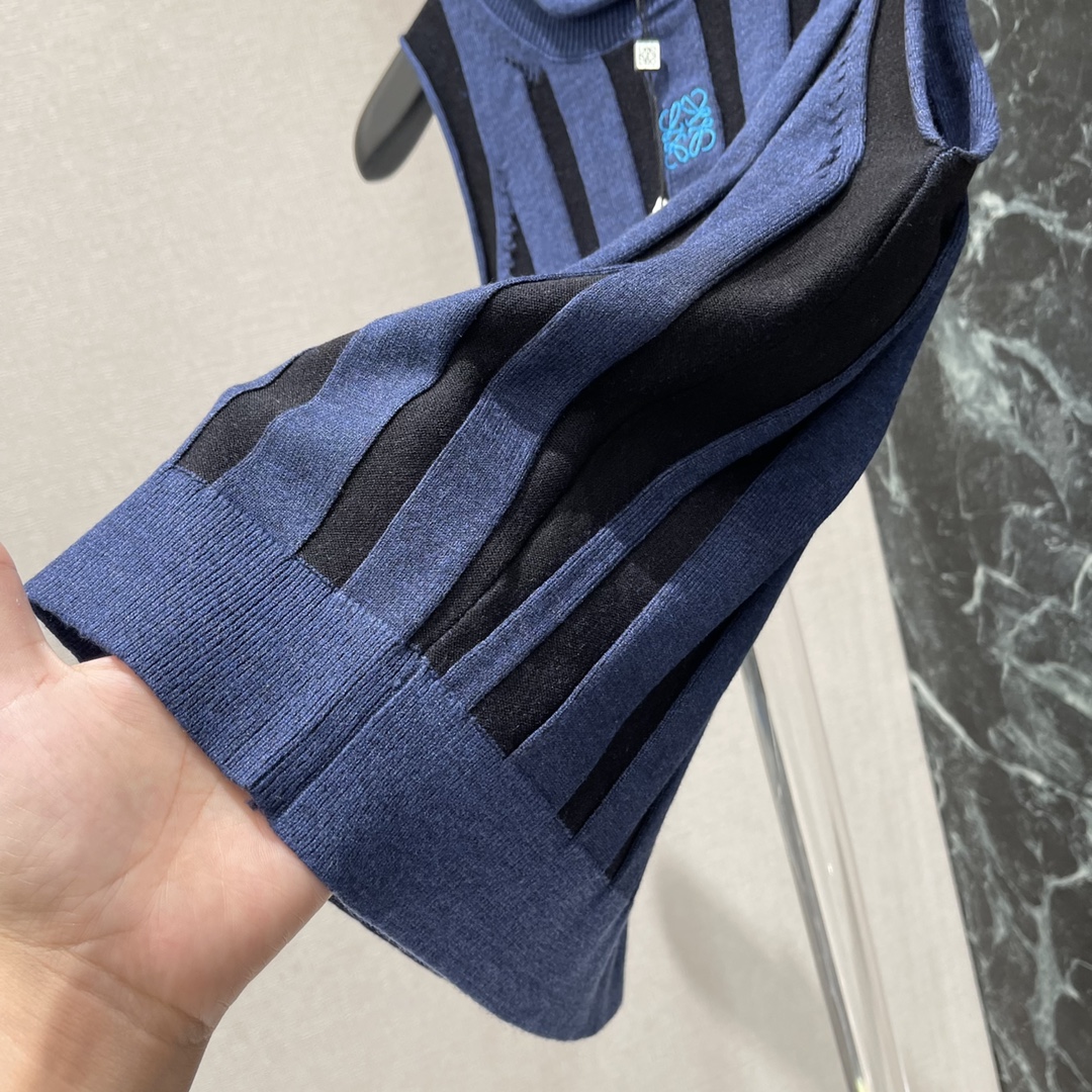 ロエベ(LOEWE)のスーパーコピー ノースリーブニットトップは、クラシックなネイビーカラーを基調にブラックのストライプを縦に配した視覚的にスタイルアップ効果のあるデザイン。首元や裾はリブ仕様で着心地がよく、シルエットはすっきりとした仕上がり。夏場は一枚で、秋冬にはジャケットのインナーとしても活躍します。丁寧な縫製と素材の質感は高級感を演出し、ラグジュアリーブランドならではの存在感を放つアイテムです。