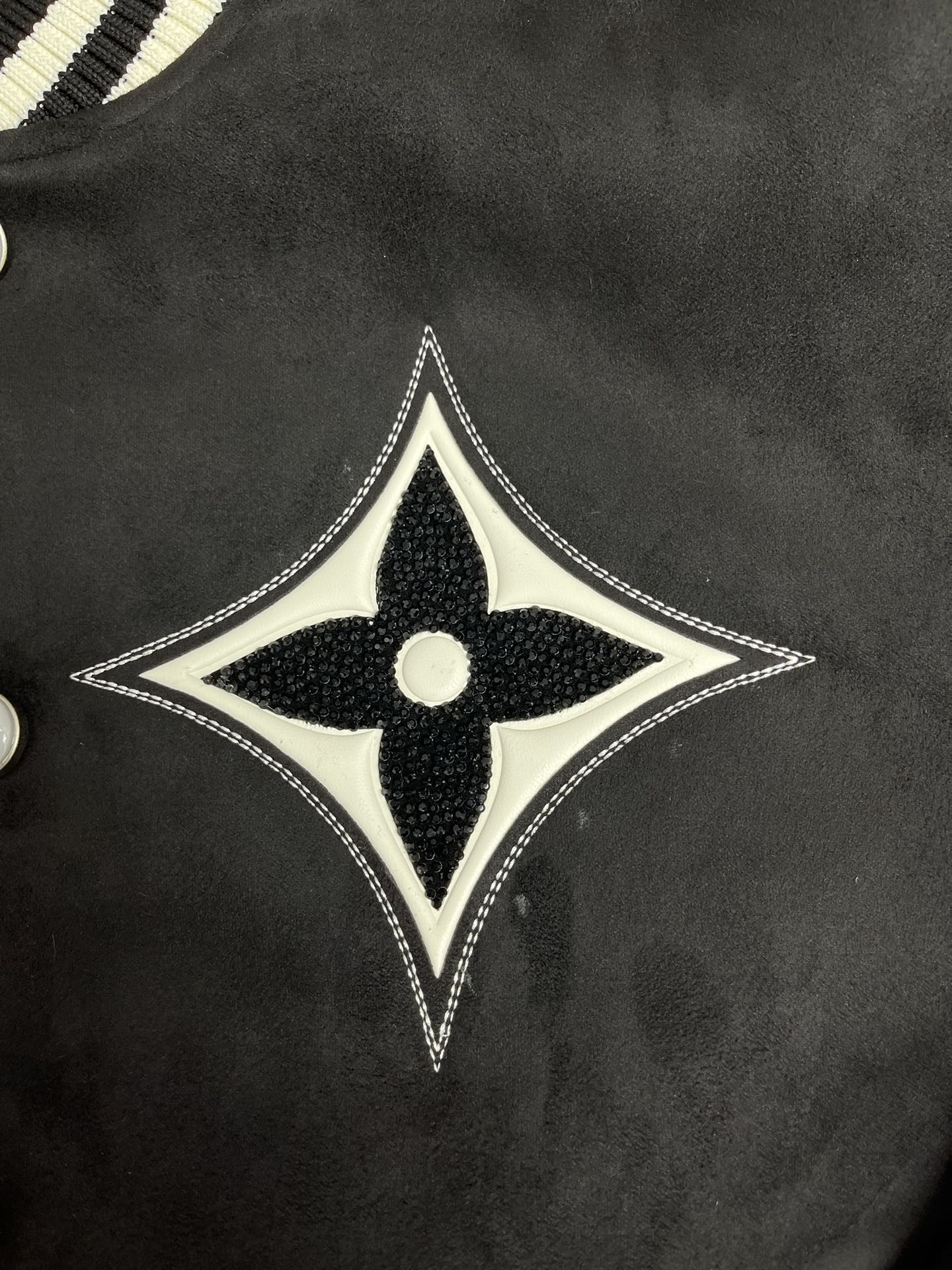 ブラックベースにホワイトの配色リブを施したルイヴィトンのスタジアムジャンパーは、クラシックな雰囲気と現代的なエッセンスを融合させた一着。胸元に大胆にあしらわれたモノグラム風ロゴワッペンがアクセントとなり、着るだけで視線を引く存在感を放ちます。見分けがつかないほどの丁寧な作り込みと、しっかりとした厚みのある生地感が魅力。カジュアルからストリート、モードまで幅広いコーディネートにマッチします。秋冬の主役アウターとしておすすめ。