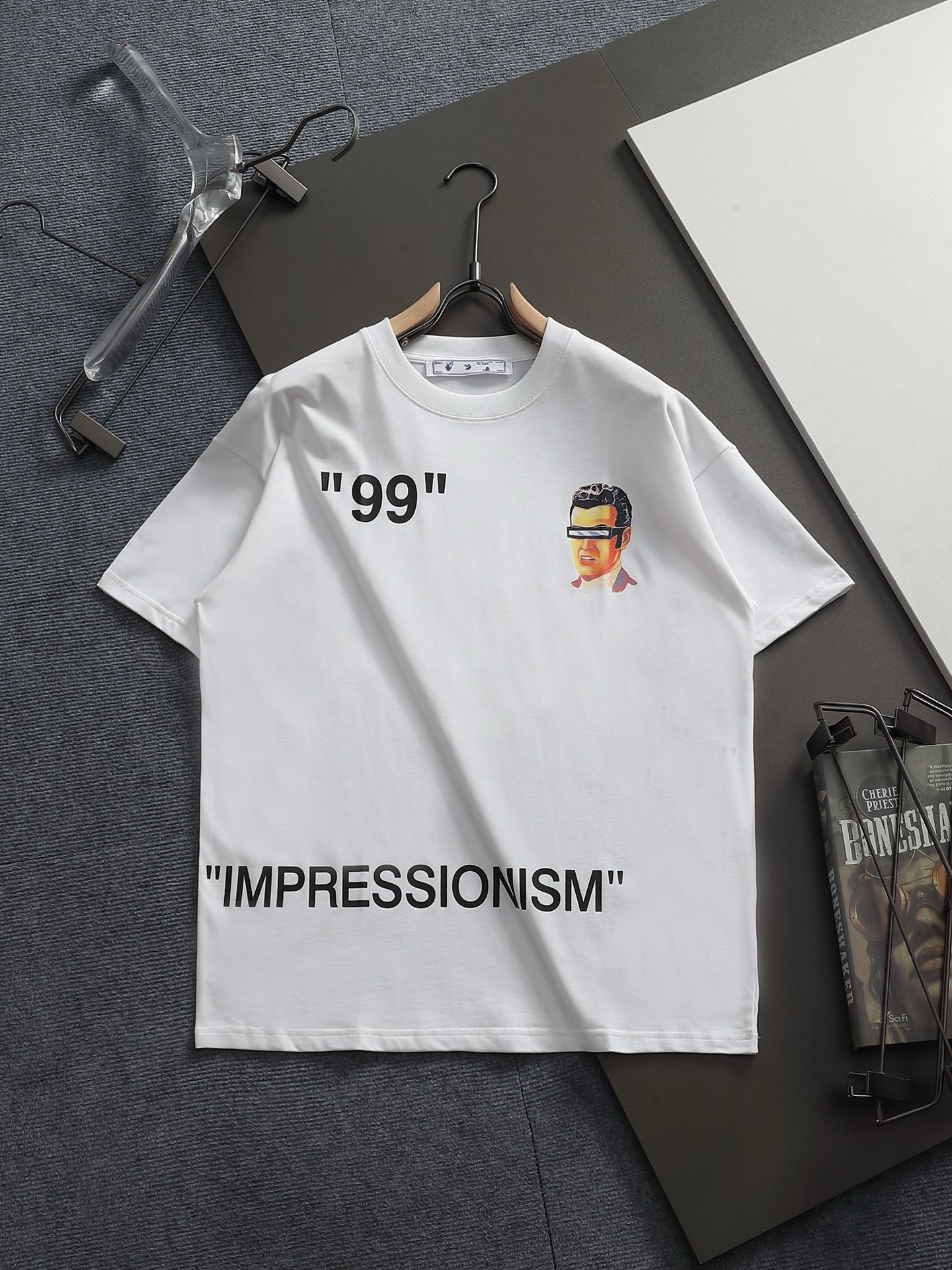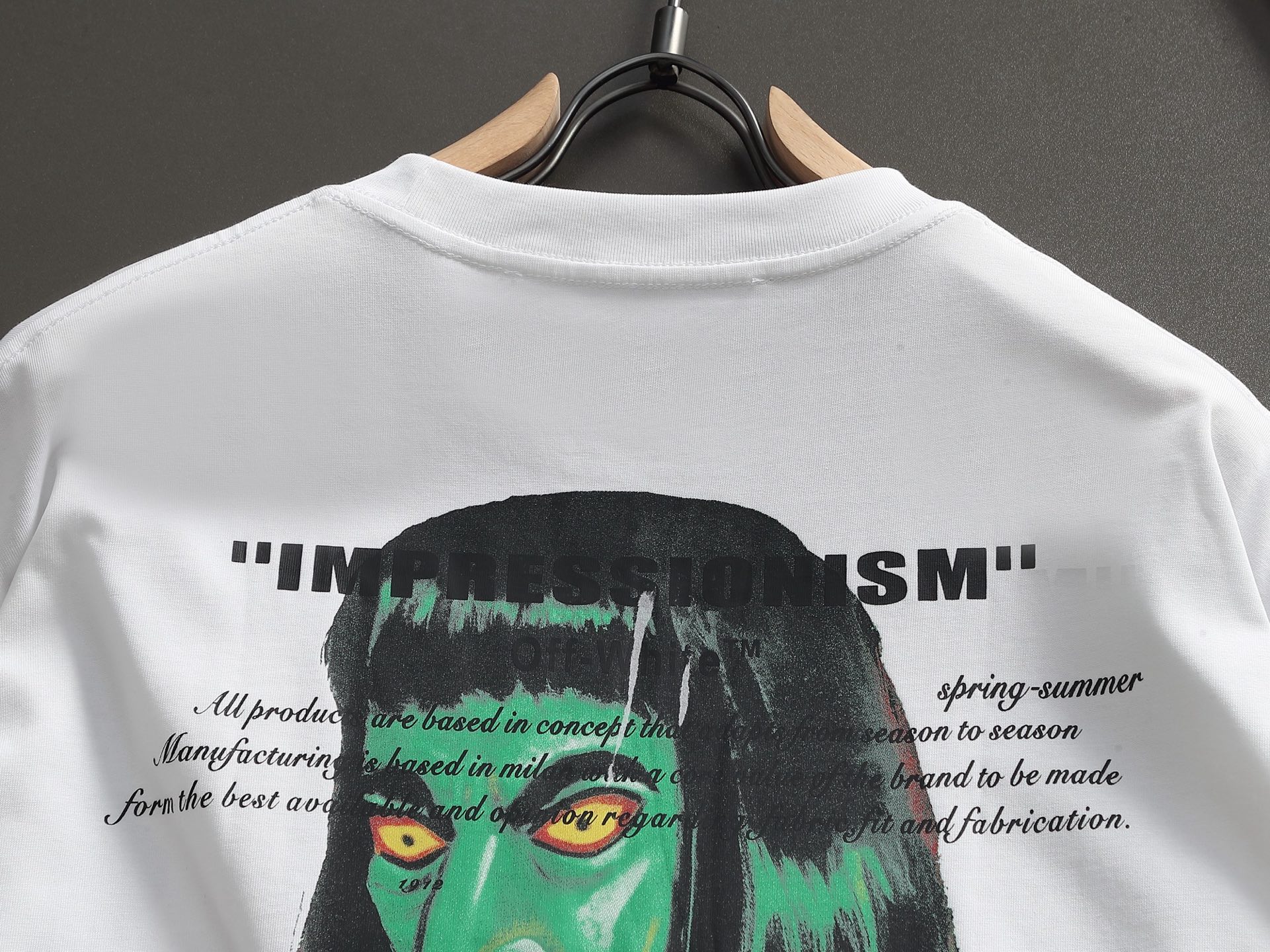 オフホワイト(Off-White)が印象派にオマージュを捧げたインプレッショニズムTシャツ、ホワイトカラーのブランド コピーは、静かな迫力を湛えた特別なアイテムです。フロントの「”99″」という謎めいた引用符の横に描かれたサングラスをかけた男性像が、どこか皮肉めいた視線を投げかけ、裾を大きく占める「IMPRESSIONISM」の文字がコンセプトを堂々と宣言します。バックに広がるグリーンの女性ポートレートは、まるで絵画から抜け出してきたような幻想的な表情で、見る者を引き込みます。