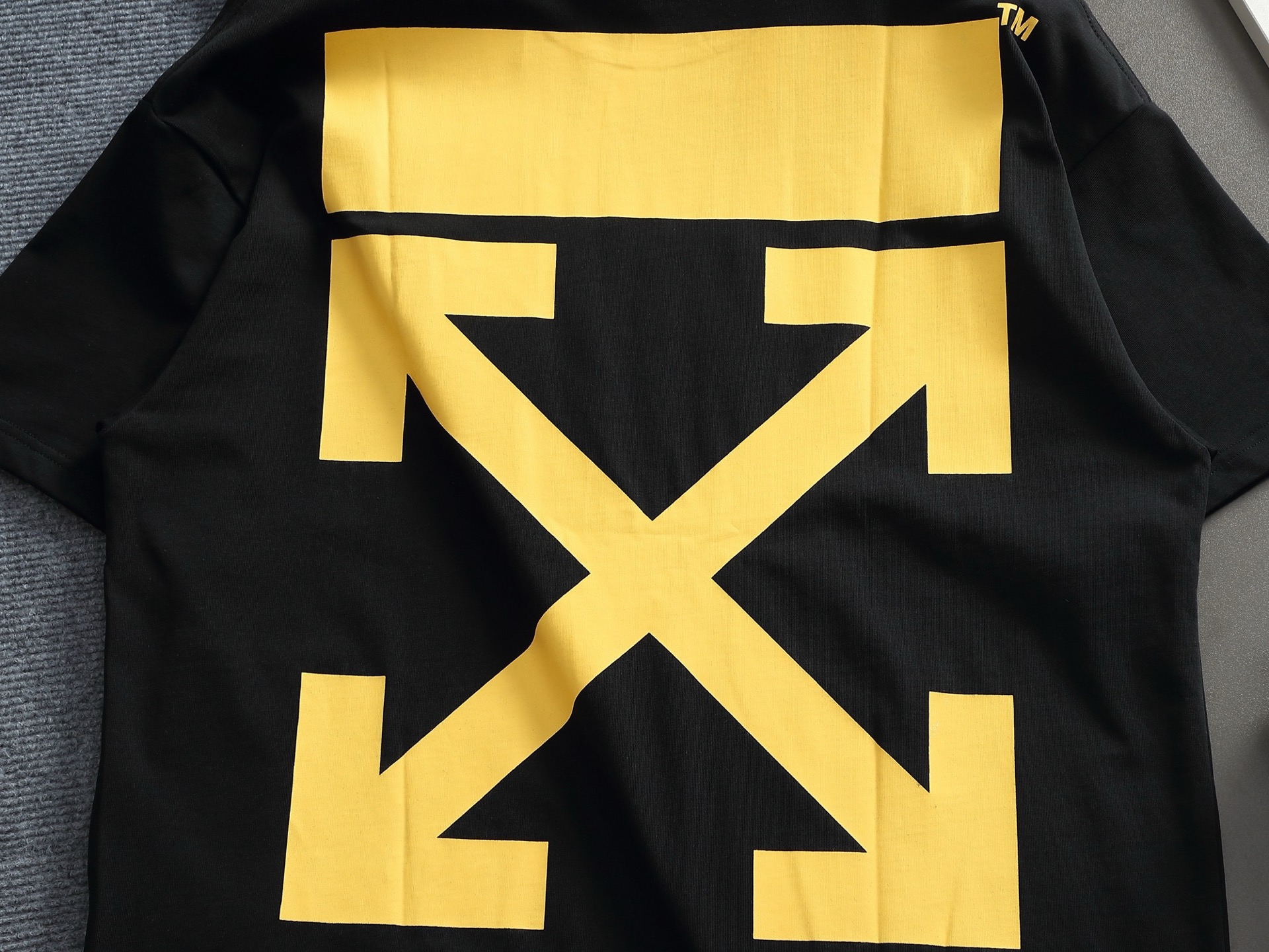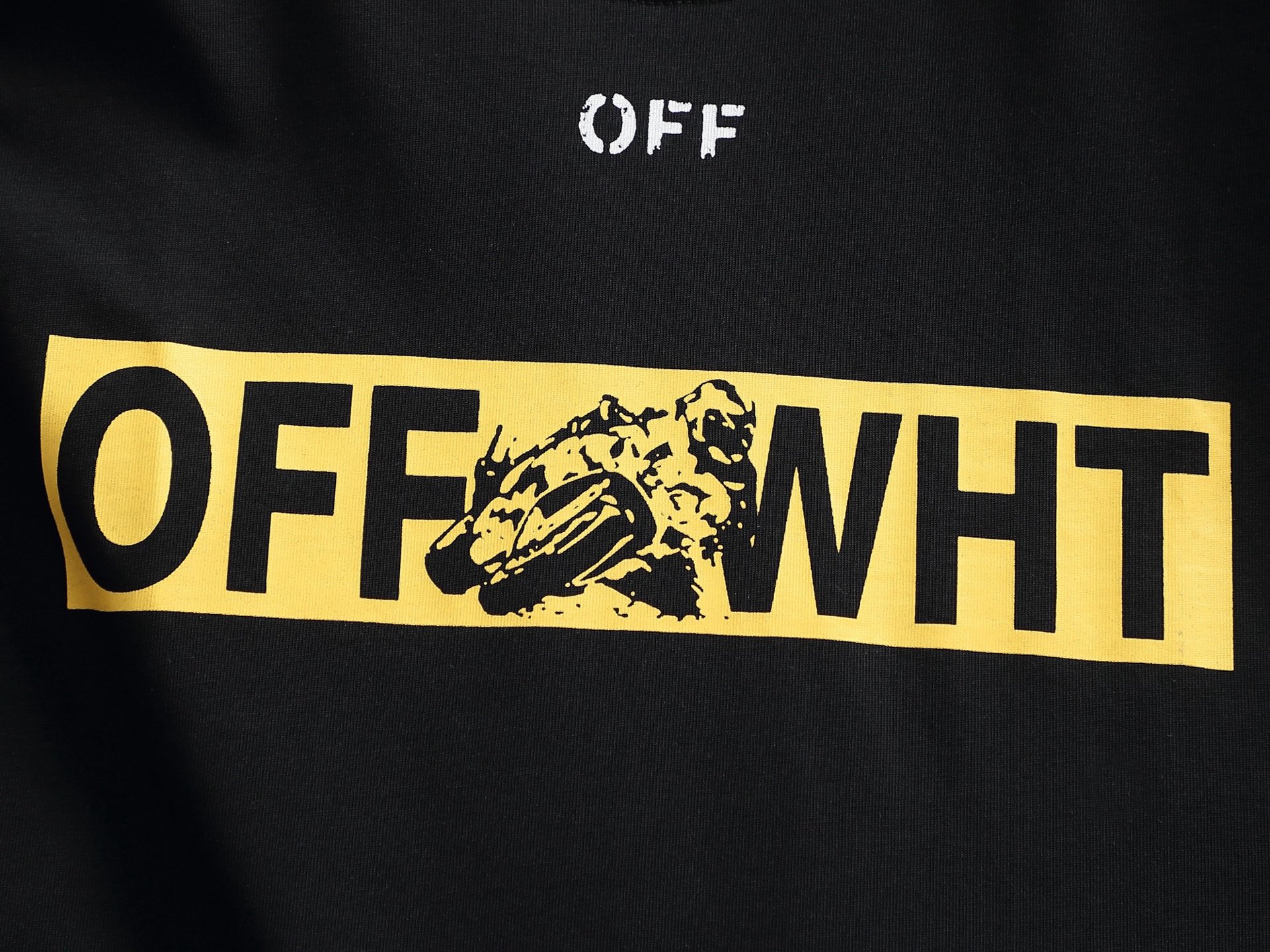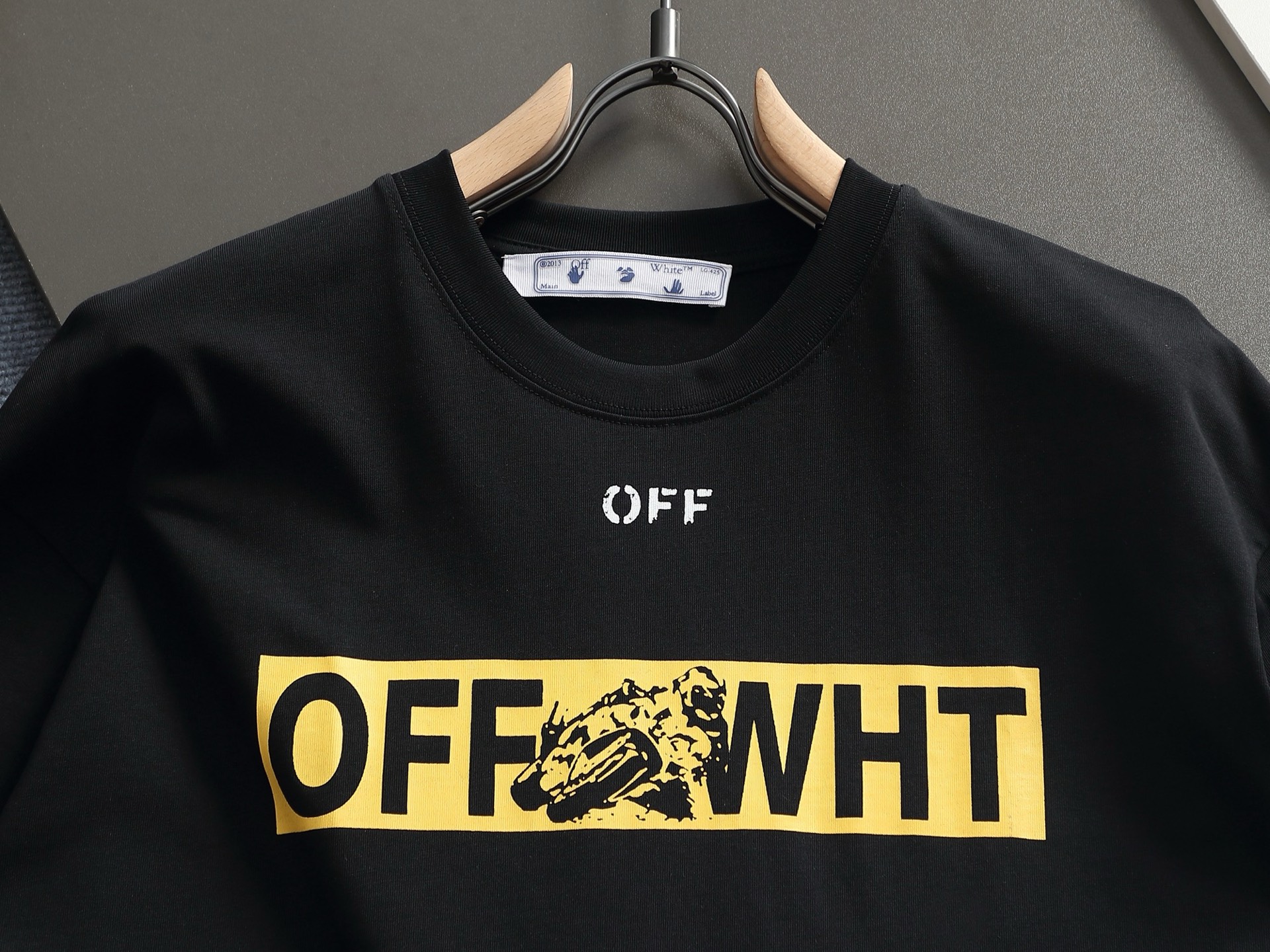 オフホワイト(Off-White)を象徴するイエローアローTシャツの芸能人偽物、ブラックボディに映えるビビッドなイエローが圧倒的な存在感を放つ一着です。フロント中央のボックス内に収まった「OFF WHT」ロゴに潜むタイガーが鋭いアクセントを加え、バックの巨大クロスアローがブランドのアイデンティティを力強く主張します。シンプルながらも一度見たら忘れられない、ストリートカルチャーの王道デザインです。