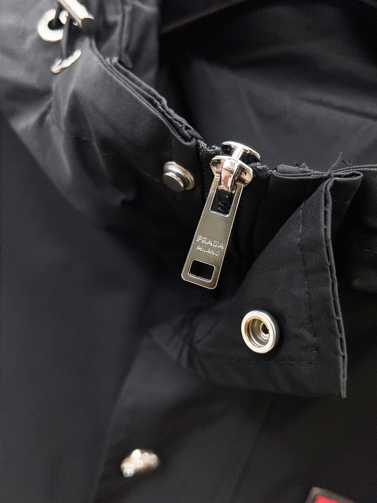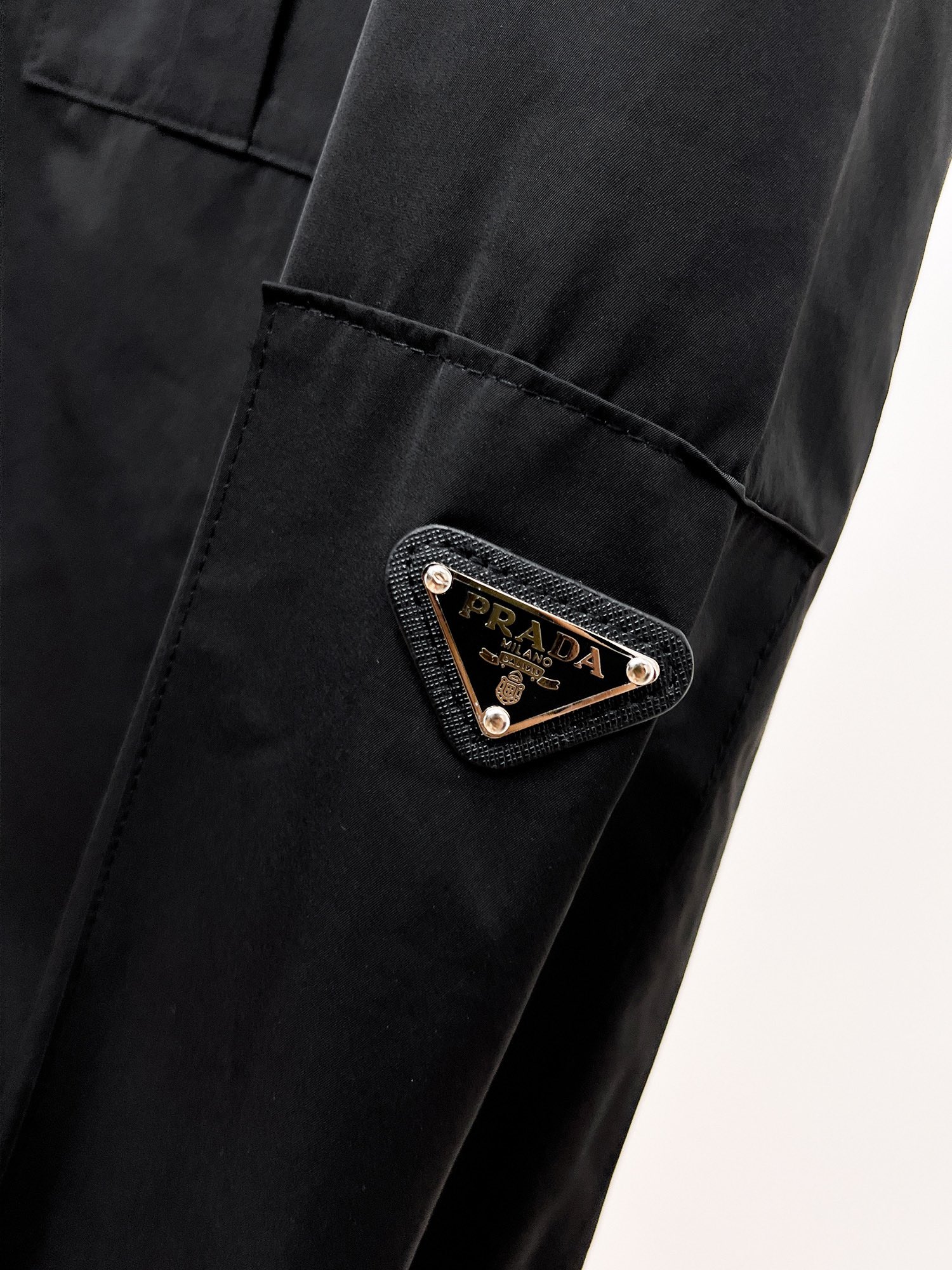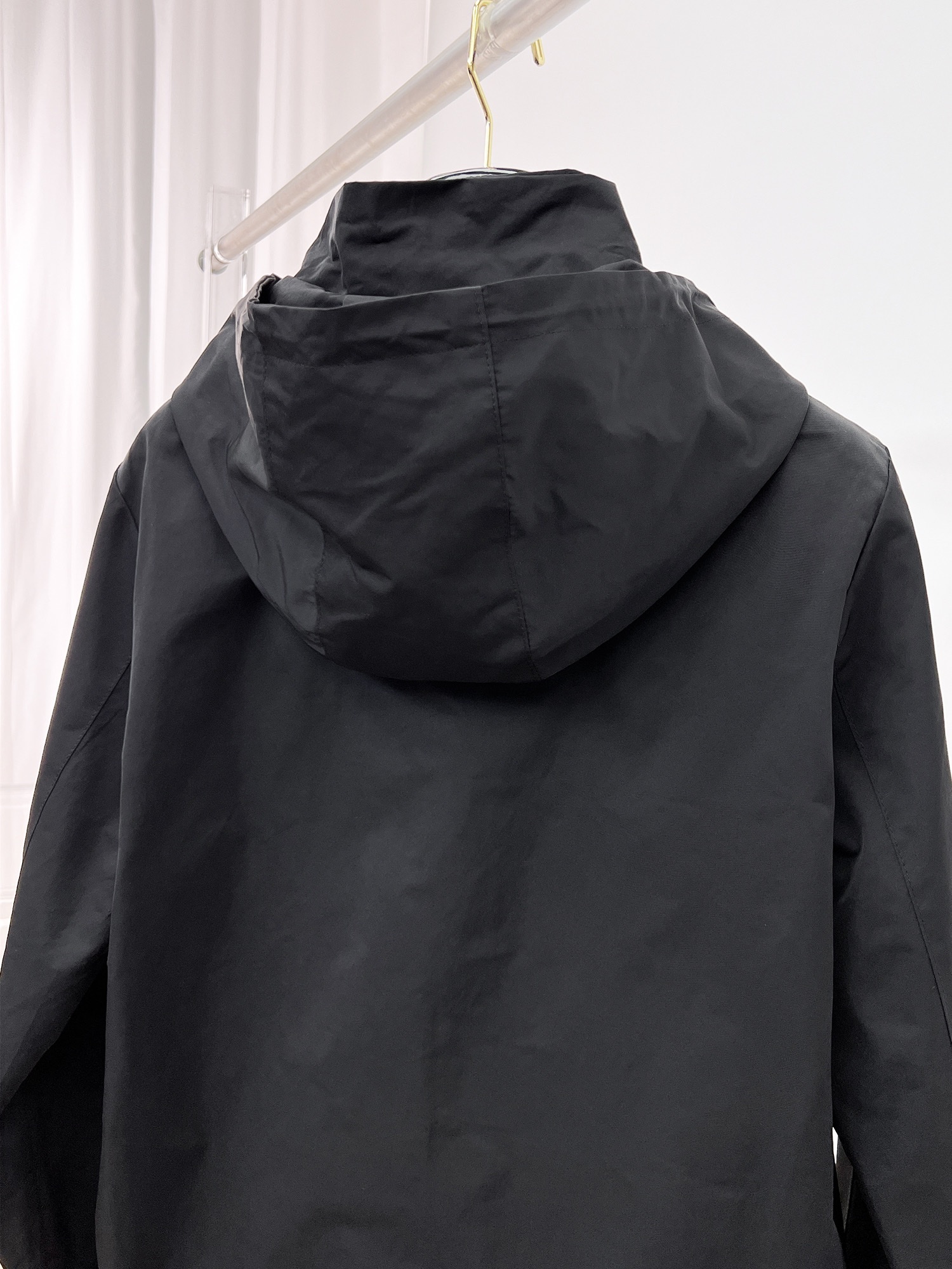 PRADA のジップディテール フーディブルゾンは、都会的なブラックナイロンをベースにシルバーのジップ装飾を多数配したデザインが特徴。フロントジップは滑らかな開閉が可能で、着脱のしやすさとデザイン性を兼ね備えています。程よい光沢感がスタイルを格上げし、ストリートからモードスタイルまで幅広いコーデに対応。