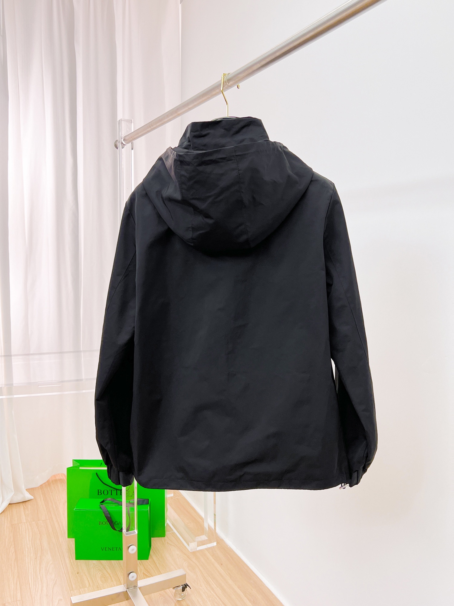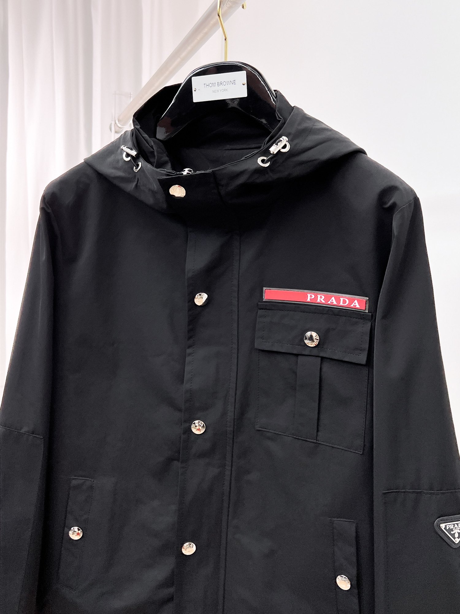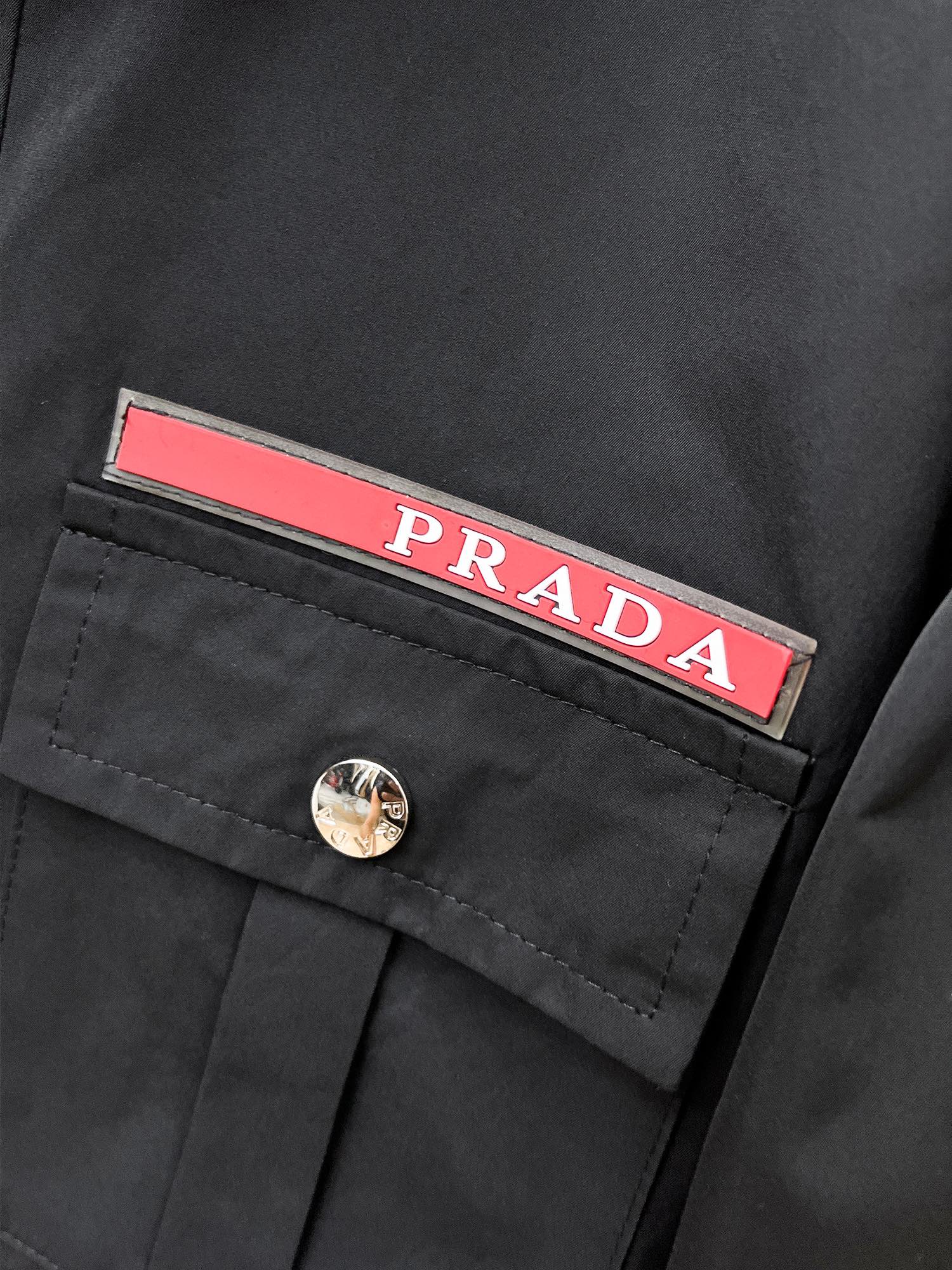 PRADA のジップディテール フーディブルゾンは、都会的なブラックナイロンをベースにシルバーのジップ装飾を多数配したデザインが特徴。フロントジップは滑らかな開閉が可能で、着脱のしやすさとデザイン性を兼ね備えています。程よい光沢感がスタイルを格上げし、ストリートからモードスタイルまで幅広いコーデに対応。