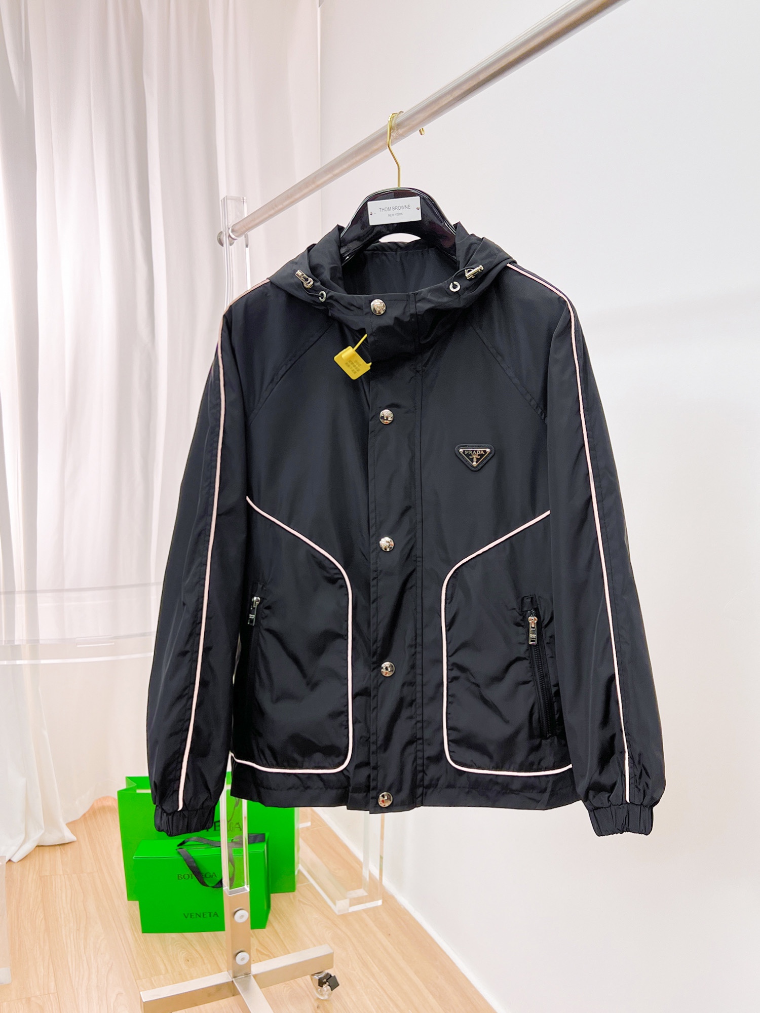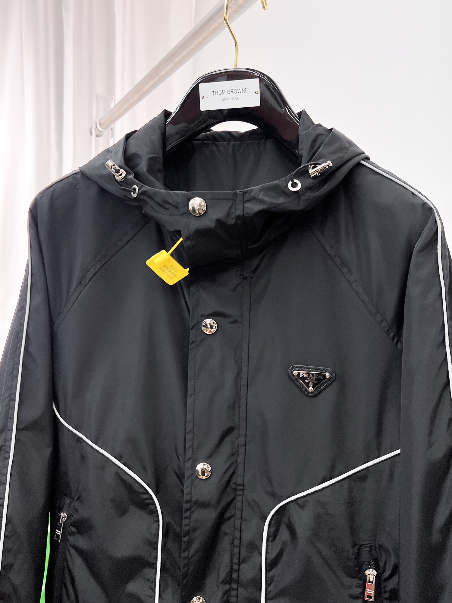 PRADA のクラシックロゴ フラップフーディジャケットは、シグネチャーのレッドロゴテープが映えるスポーティなアウター。耐久性のあるナイロン素材と丁寧な縫製で、日常使いから軽いアウトドアまで活躍します。収納力のあるフラップポケットとフィット感の良いフードが機能美を高め、都会的で洗練された印象を演出します。